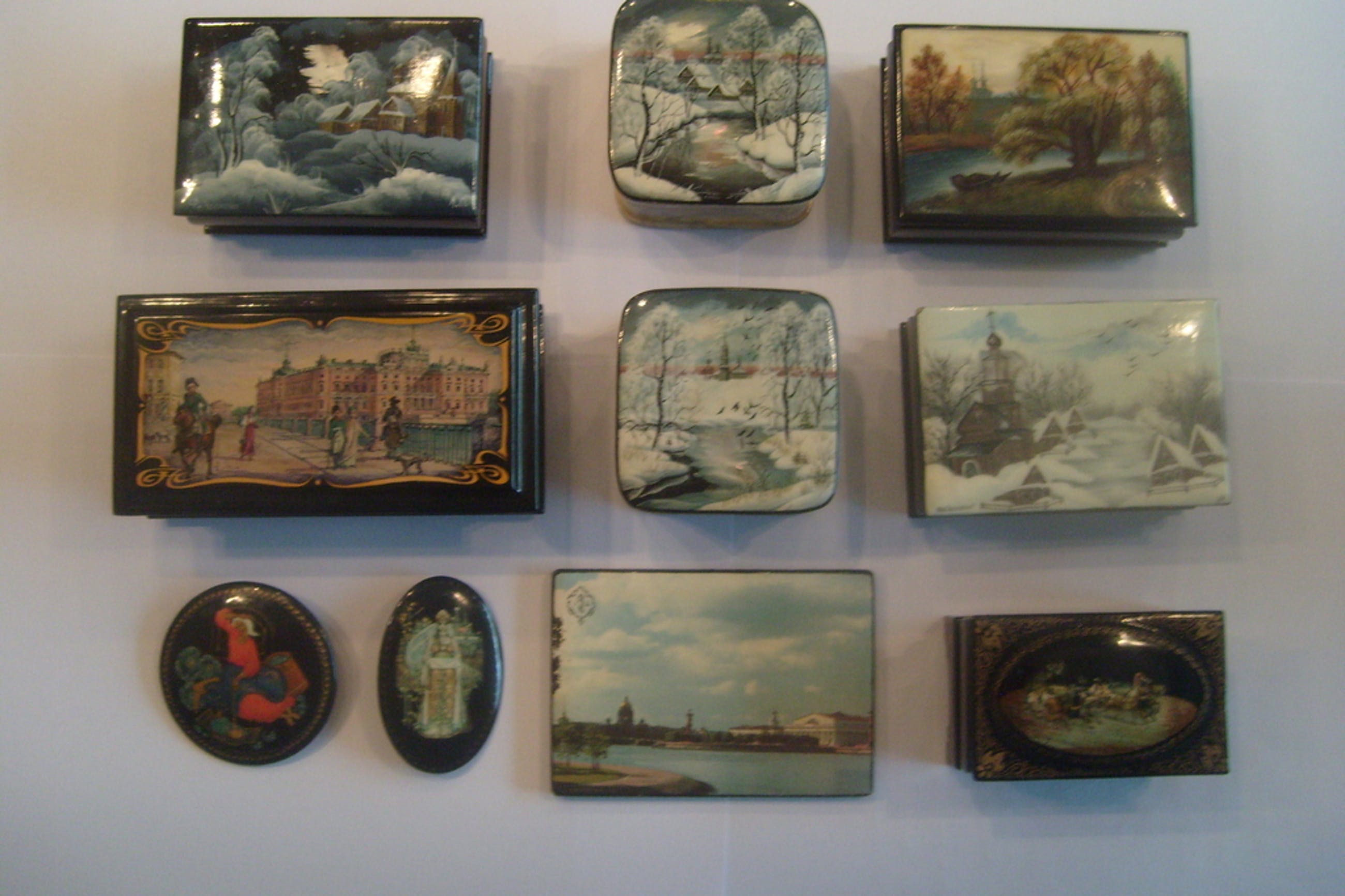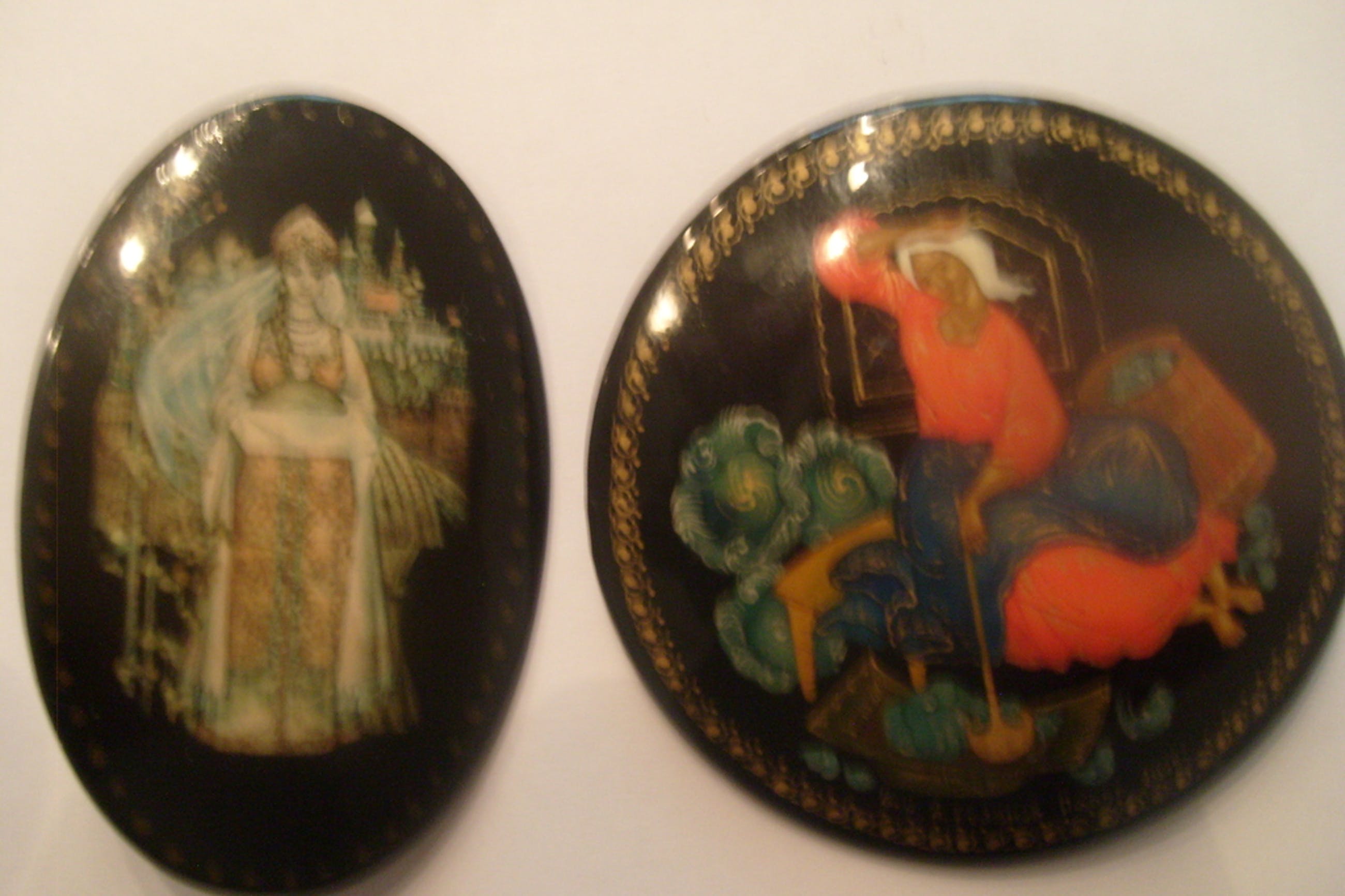 Verschillende Russische kunstschilders van lakdoosjes en broches.