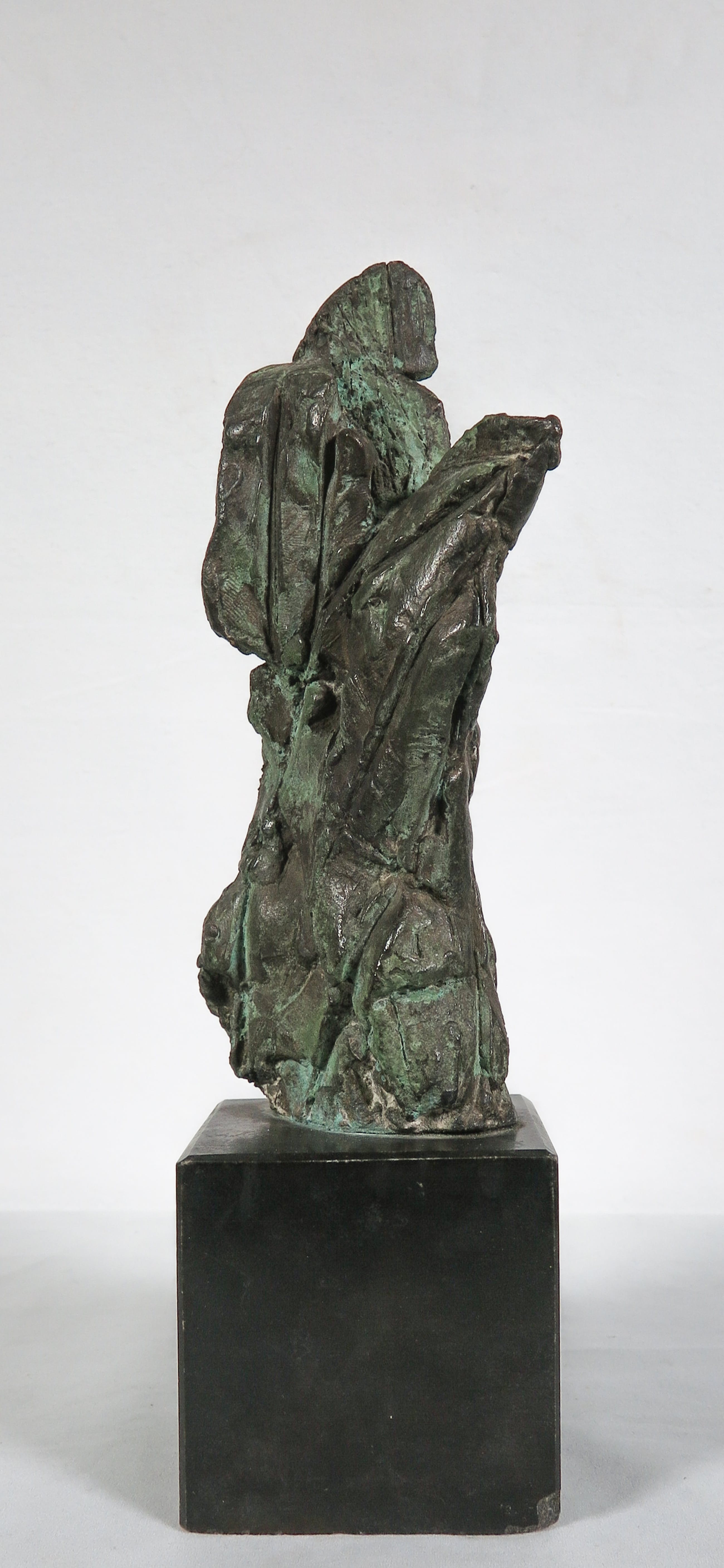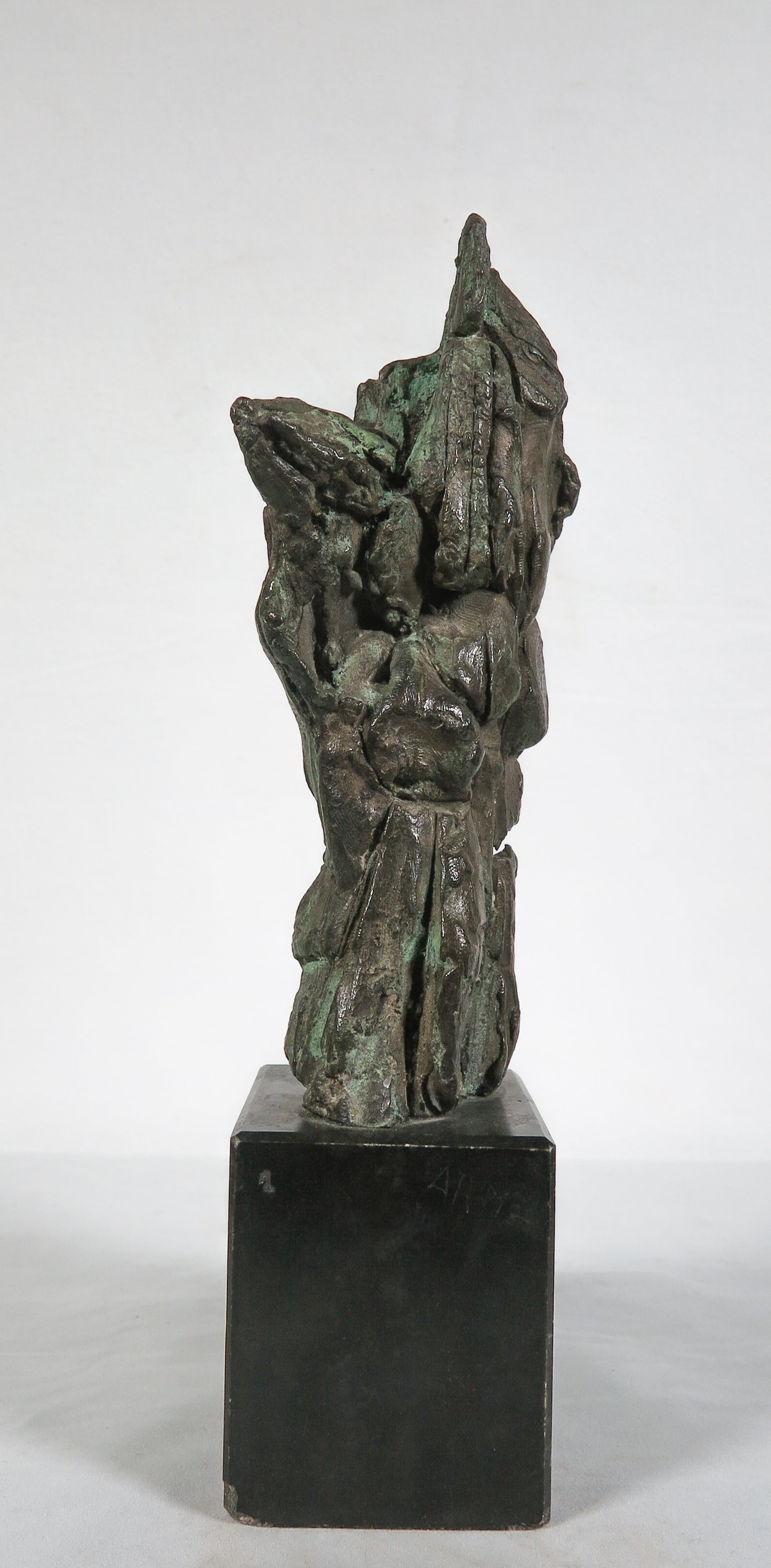 Groen gepatineerd abstract bronzen figuur op harstenen sokkel.