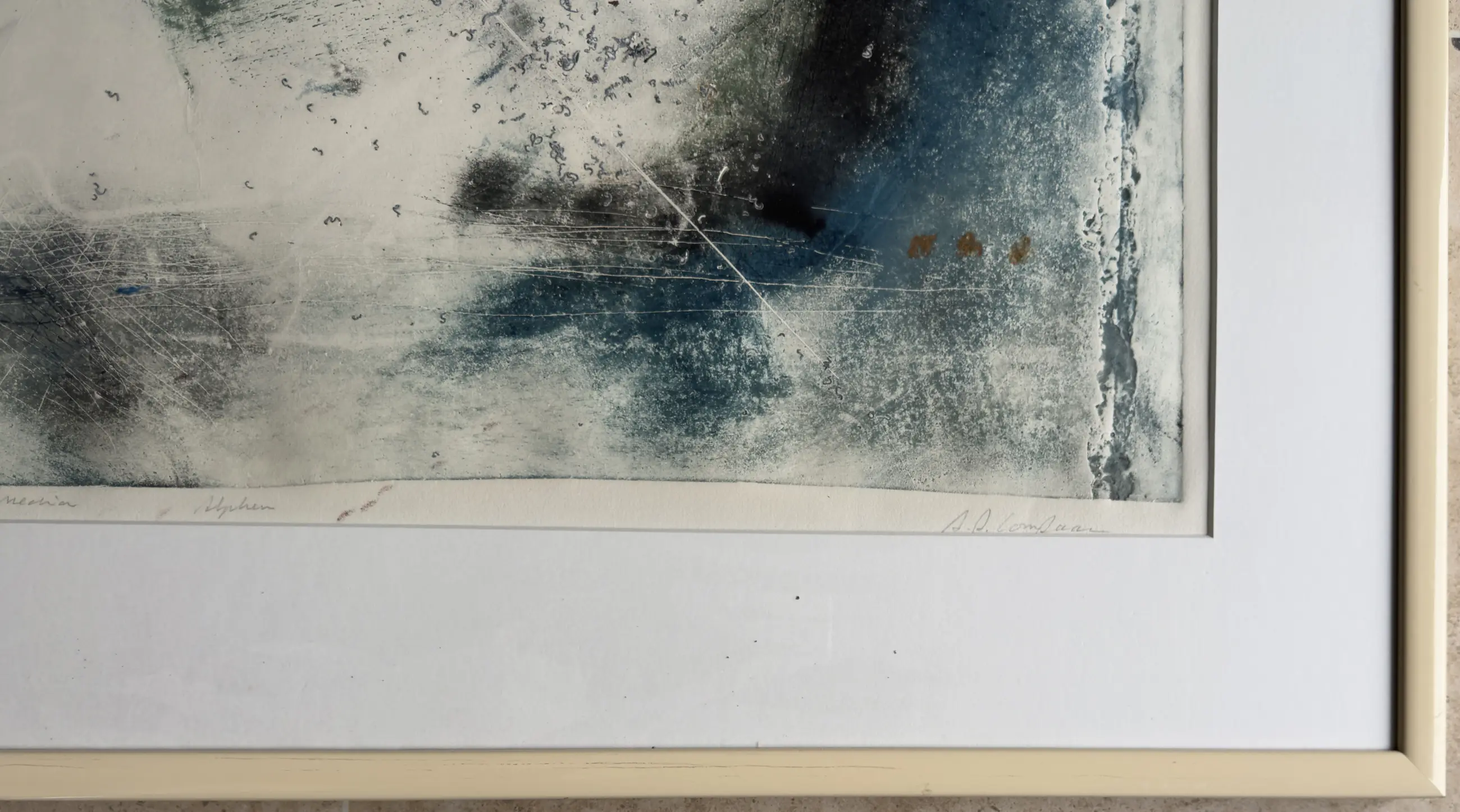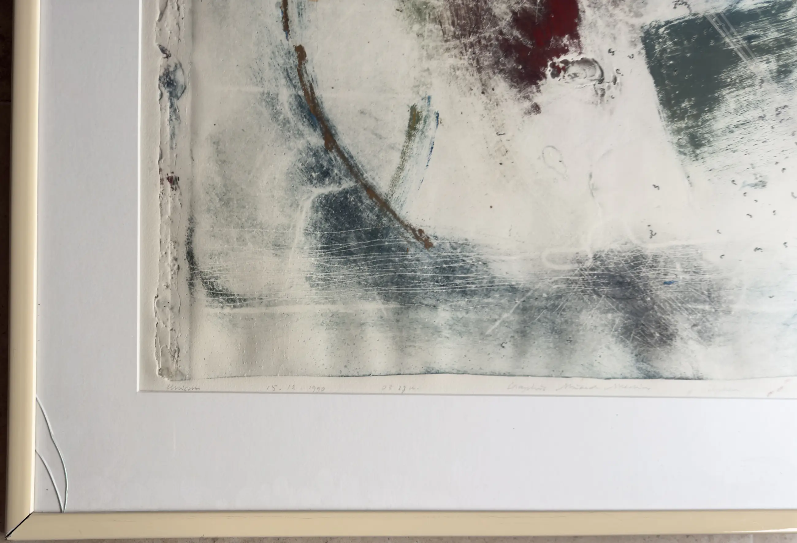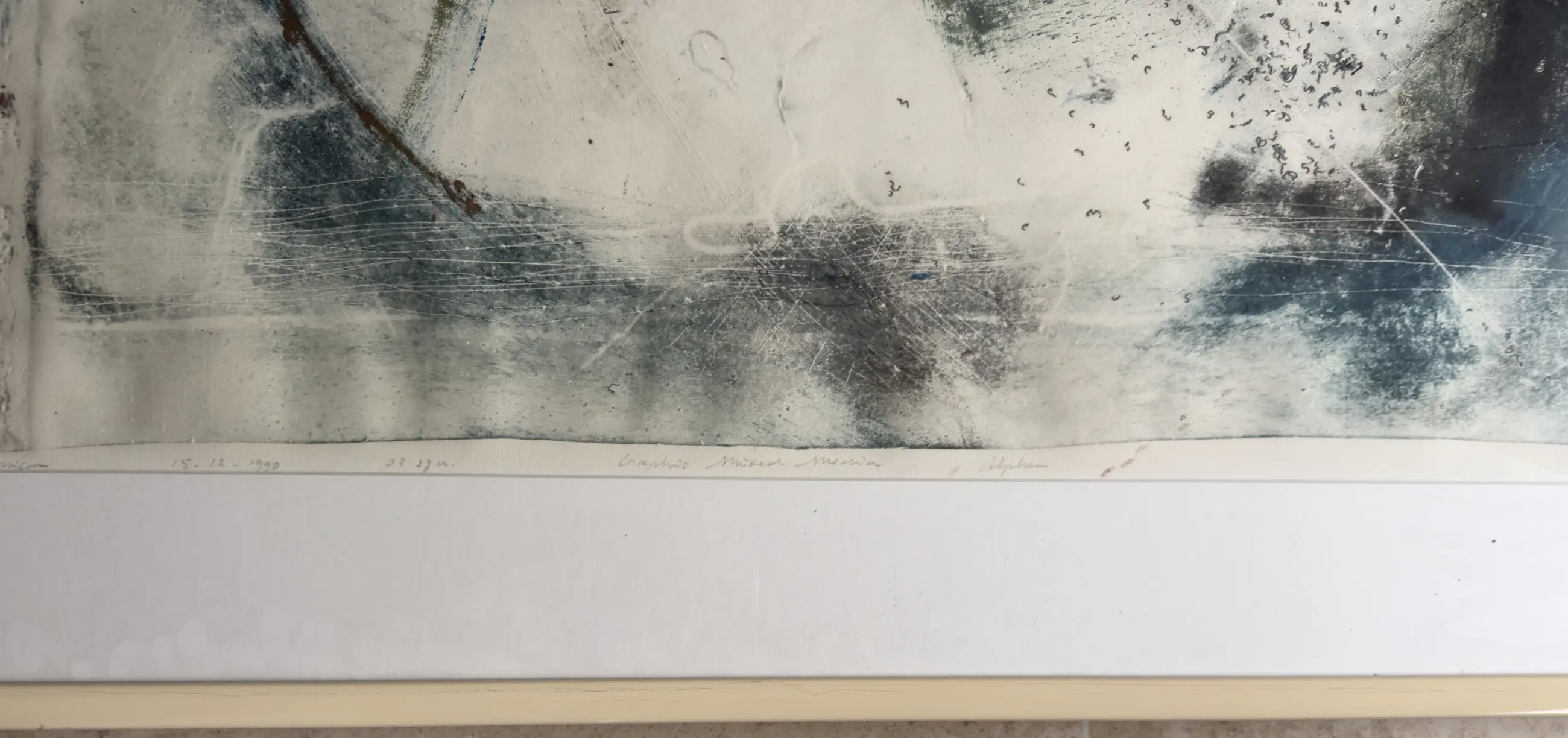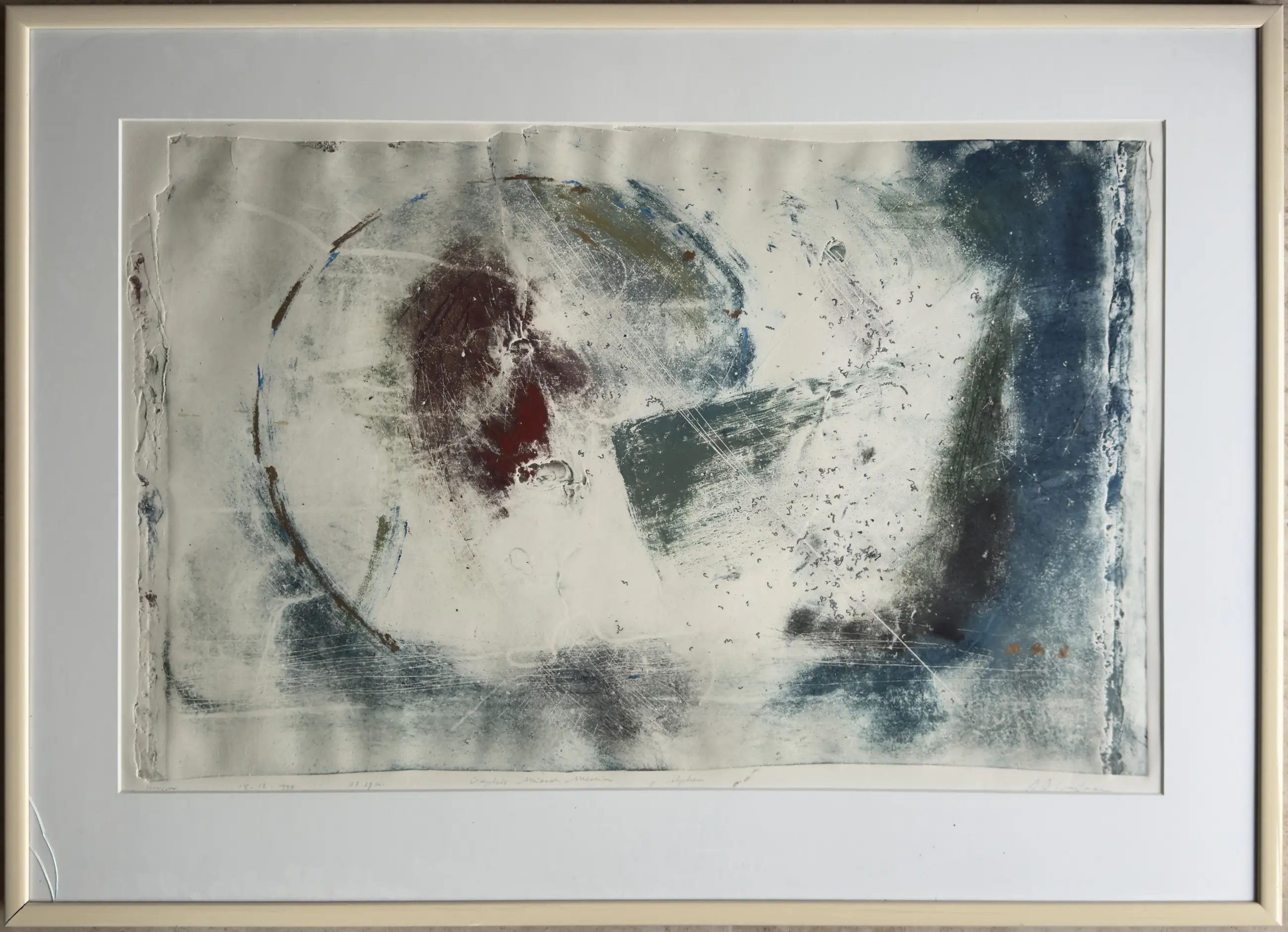 Titel: Abstracte voorstelling Jaar: 1990 Techniek: Ets Oplage: Unicum Gesigneerd: Rechtsonder Afwerking: Ingelijst Afmeting voorstelling (HxB): 67 x 106 cm Afmeting lijst (HxB): 92 x 127 cm Conditie werk: Goed, wat gebobbeld Conditie lijst: De lijst heeft gebruikssporen, het glas is gebroken Referentie: ZK3001345