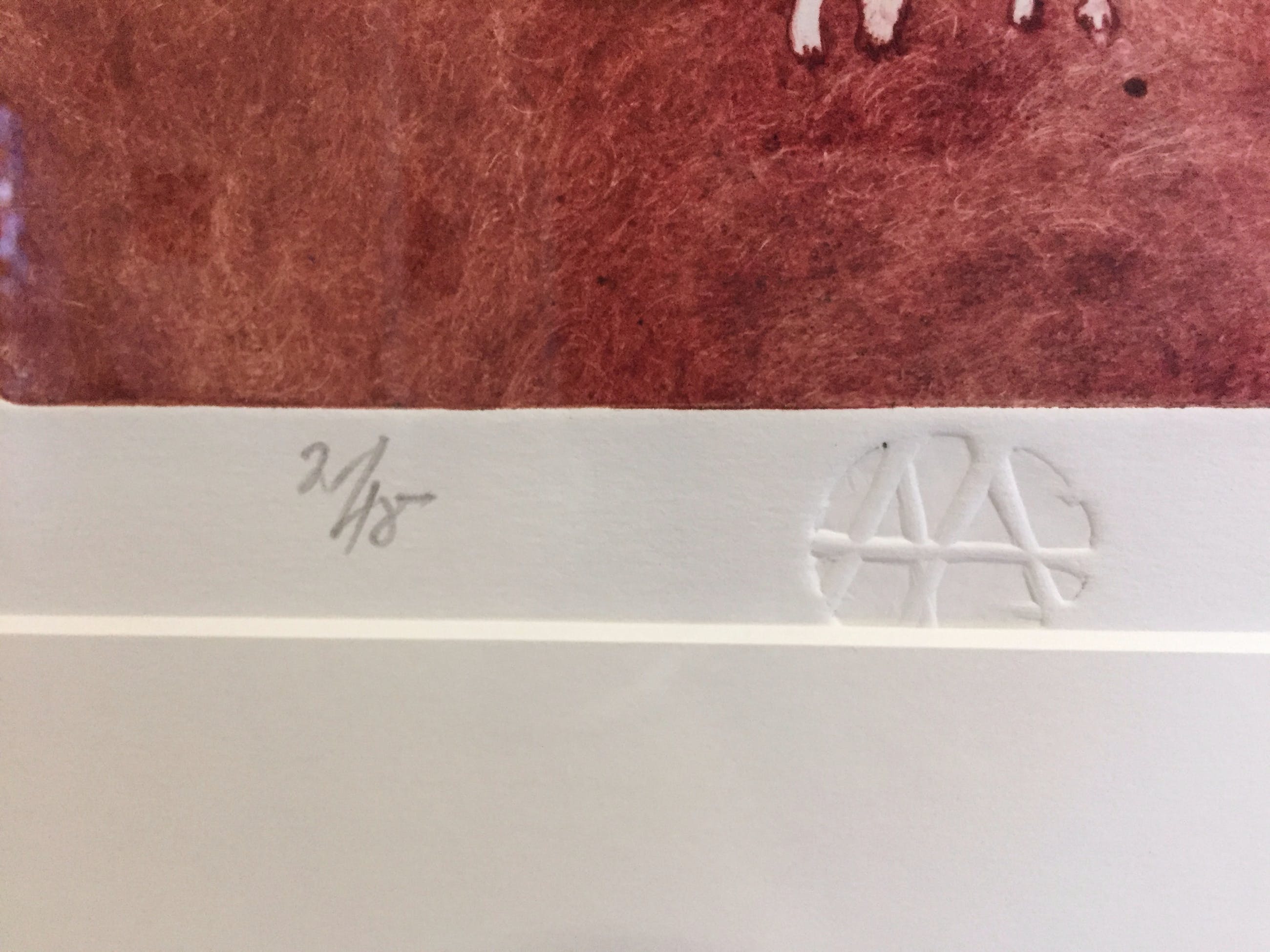 Prachtige kleuren-ets (oplage 18 nr 2), onmiskenbaar - ook al zou hij niet zijn gesigneerd - van de hand van Ad Arma (kunstenaar van het jaar 2007). Het werk - vakkundig zuurvrij ingelijst in een perfect passende Italiaanse Ferrosa lijst met inleg - komt uit een prive-collectie. In verband met de verzhuizing naar een kleinere woonruimte is mij gevraagd deze werken (zie ook nog andere kavels) namens eigenaar ter veiling aan te bieden.