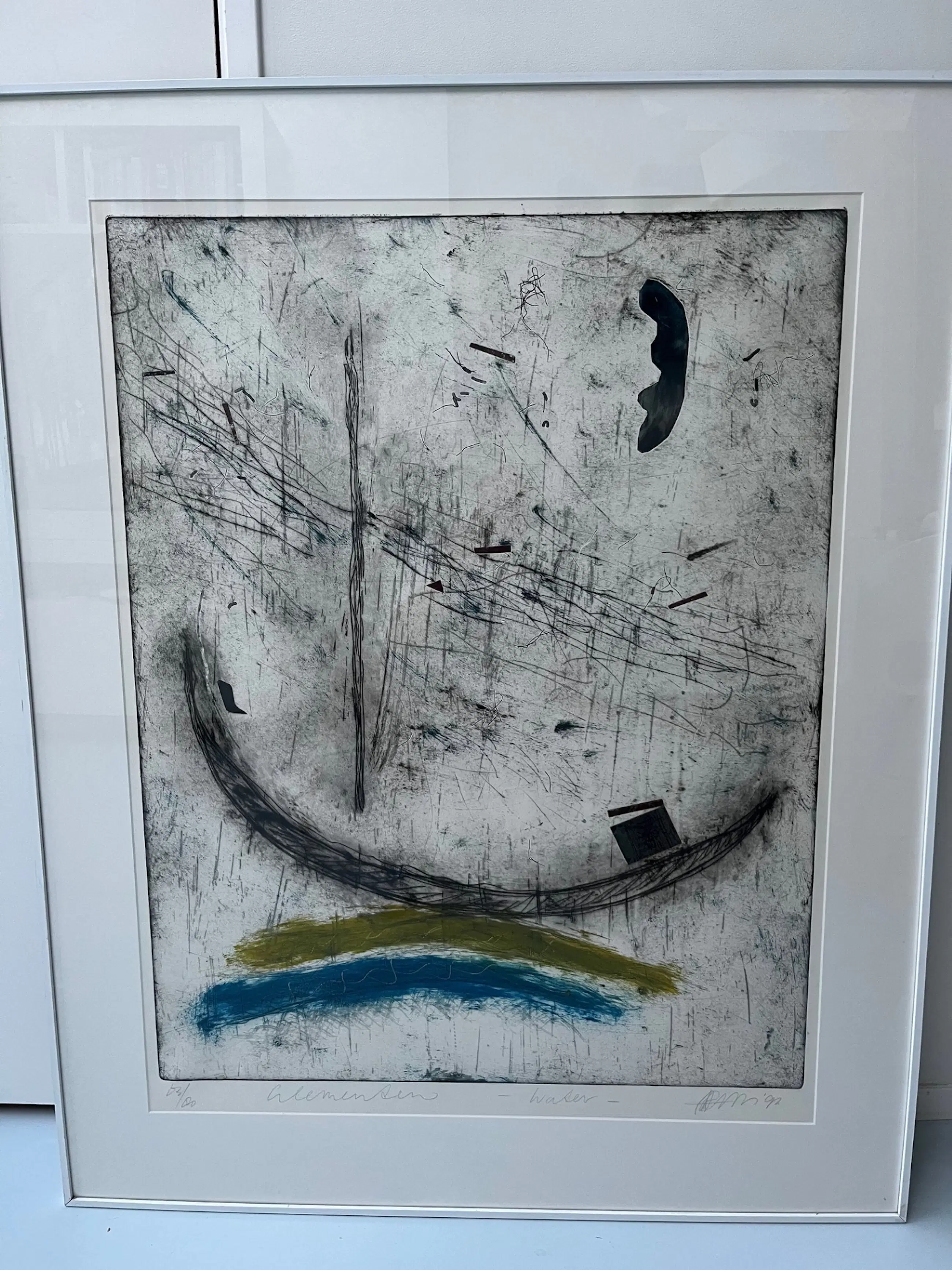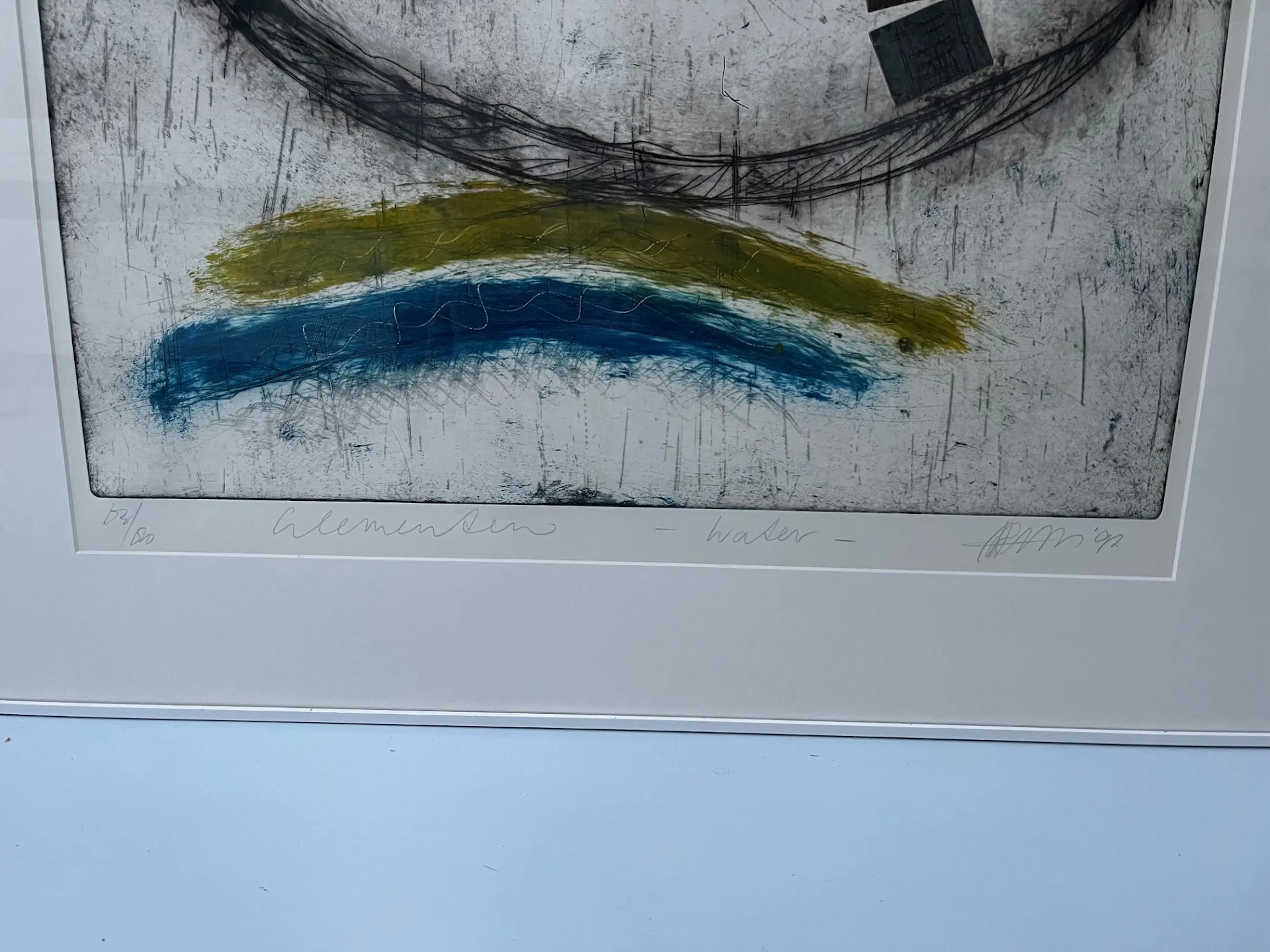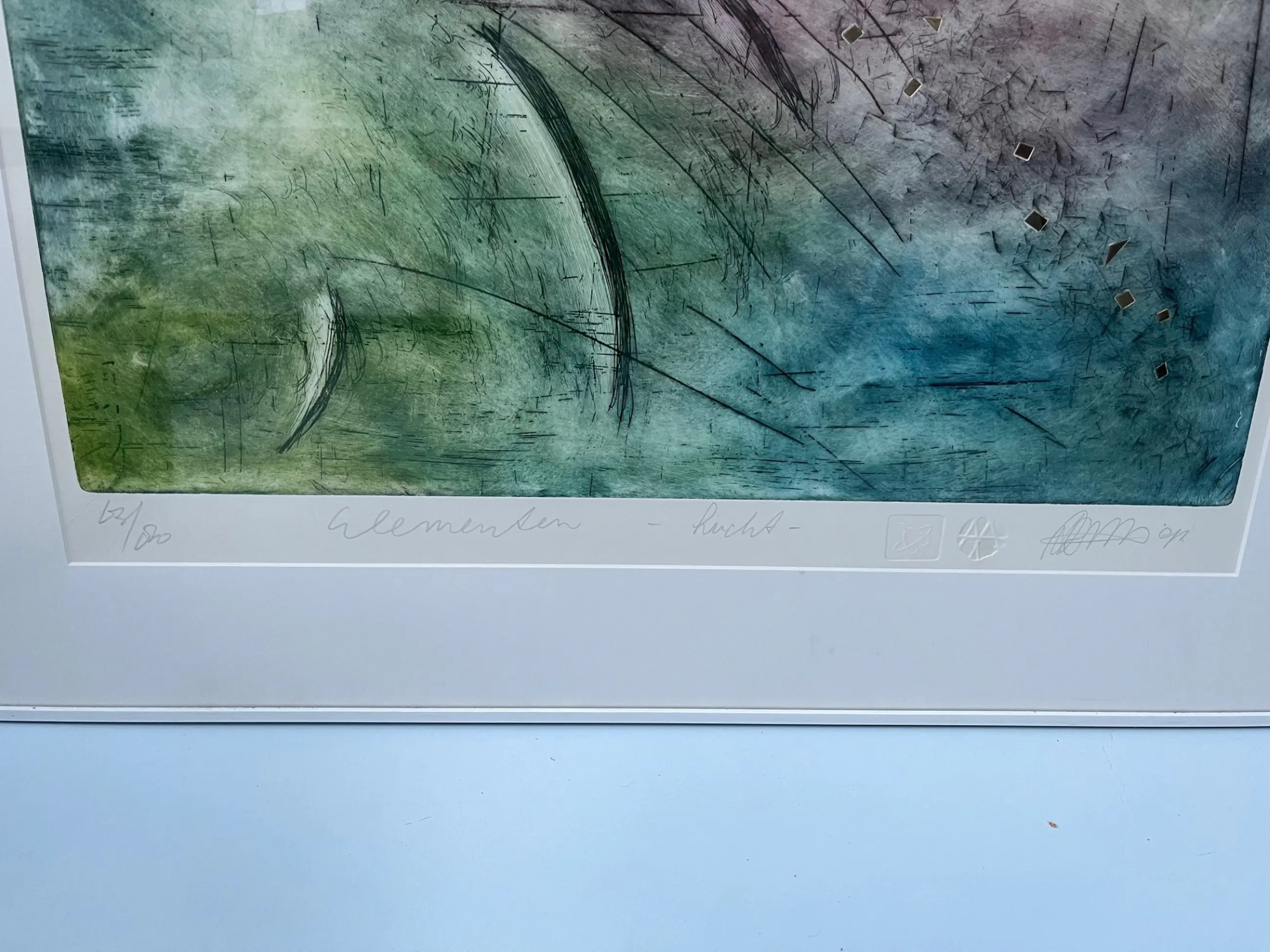 Ingelijste serie 'Elementen' van Ad Arma, nummer 63/80, bestaande uit 'Aarde', 'Lucht', 'Vuur' en 'Water'. Ingelijst met wit passepartout. Voorkeur als serie over te nemen.