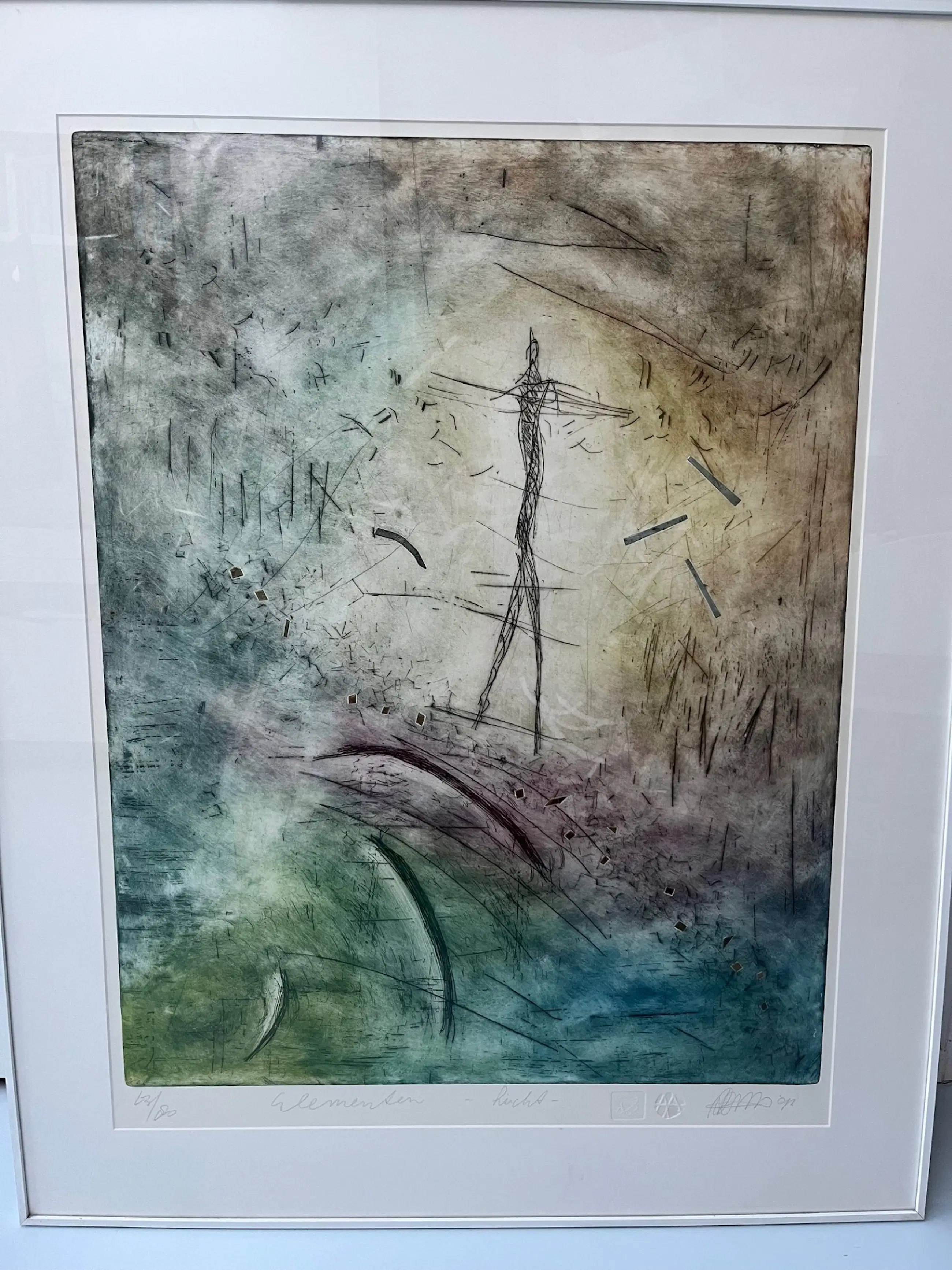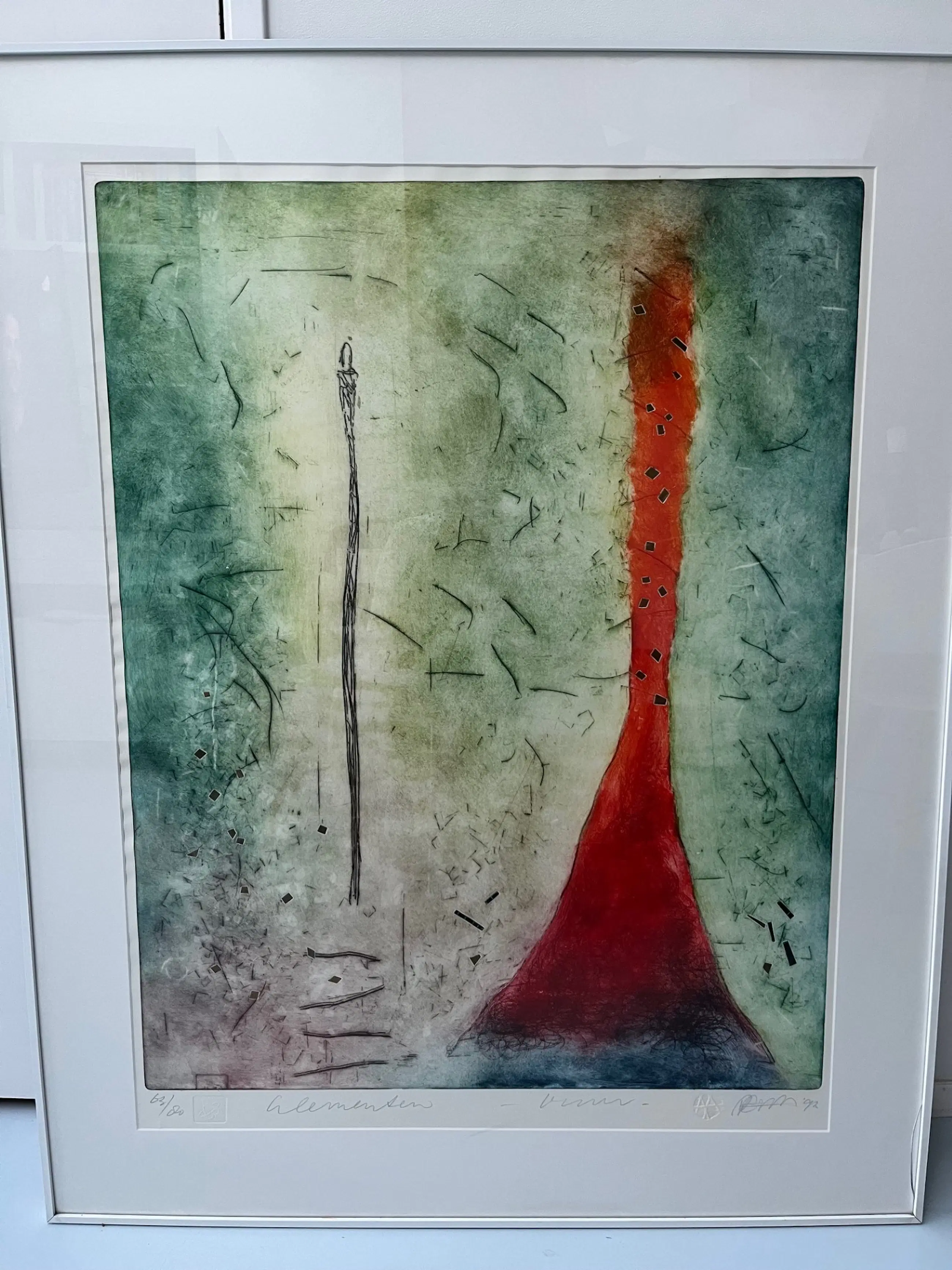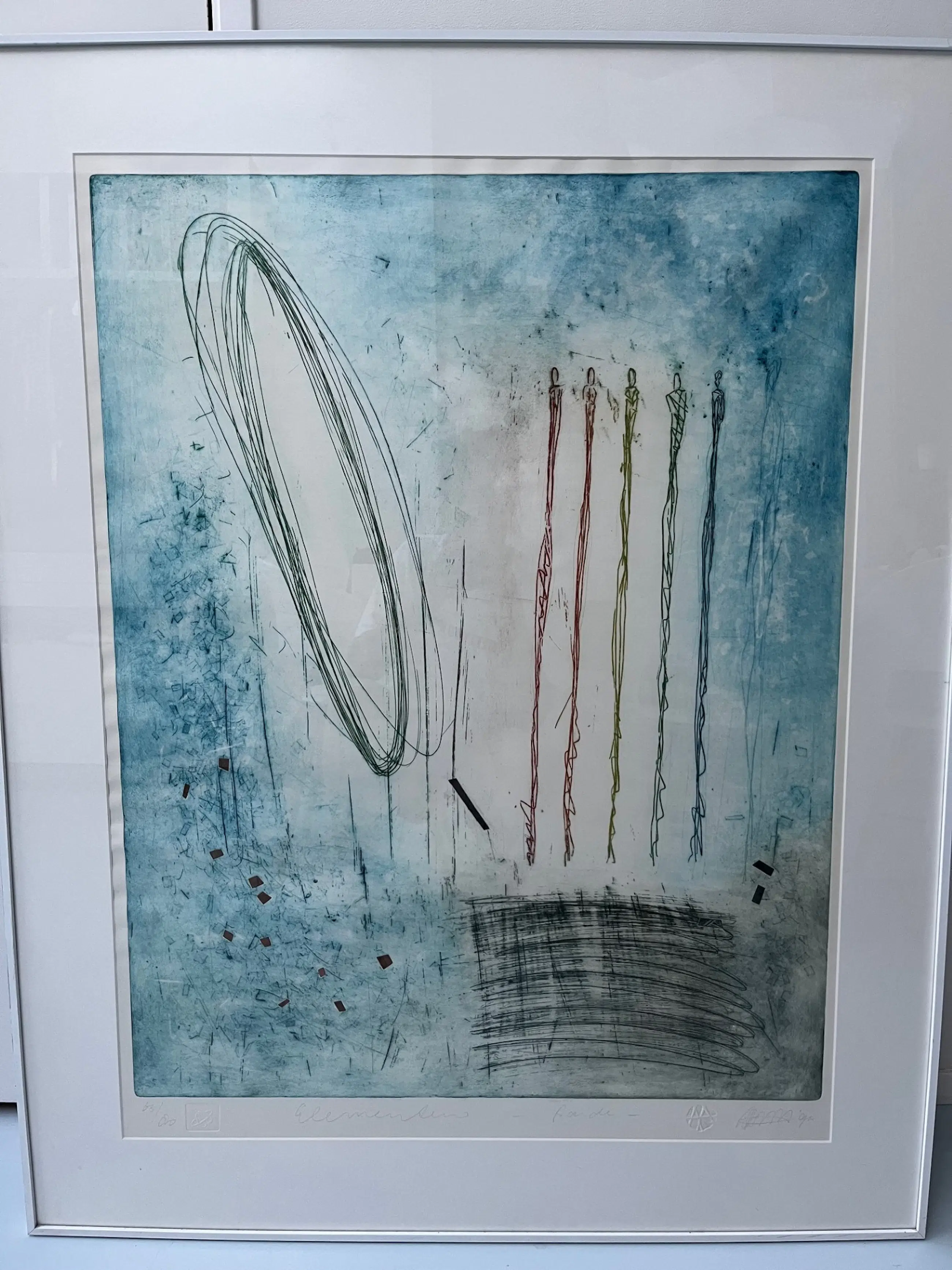 Ingelijste serie 'Elementen' van Ad Arma, nummer 63/80, bestaande uit 'Aarde', 'Lucht', 'Vuur' en 'Water'. Ingelijst met wit passepartout. Voorkeur als serie over te nemen.