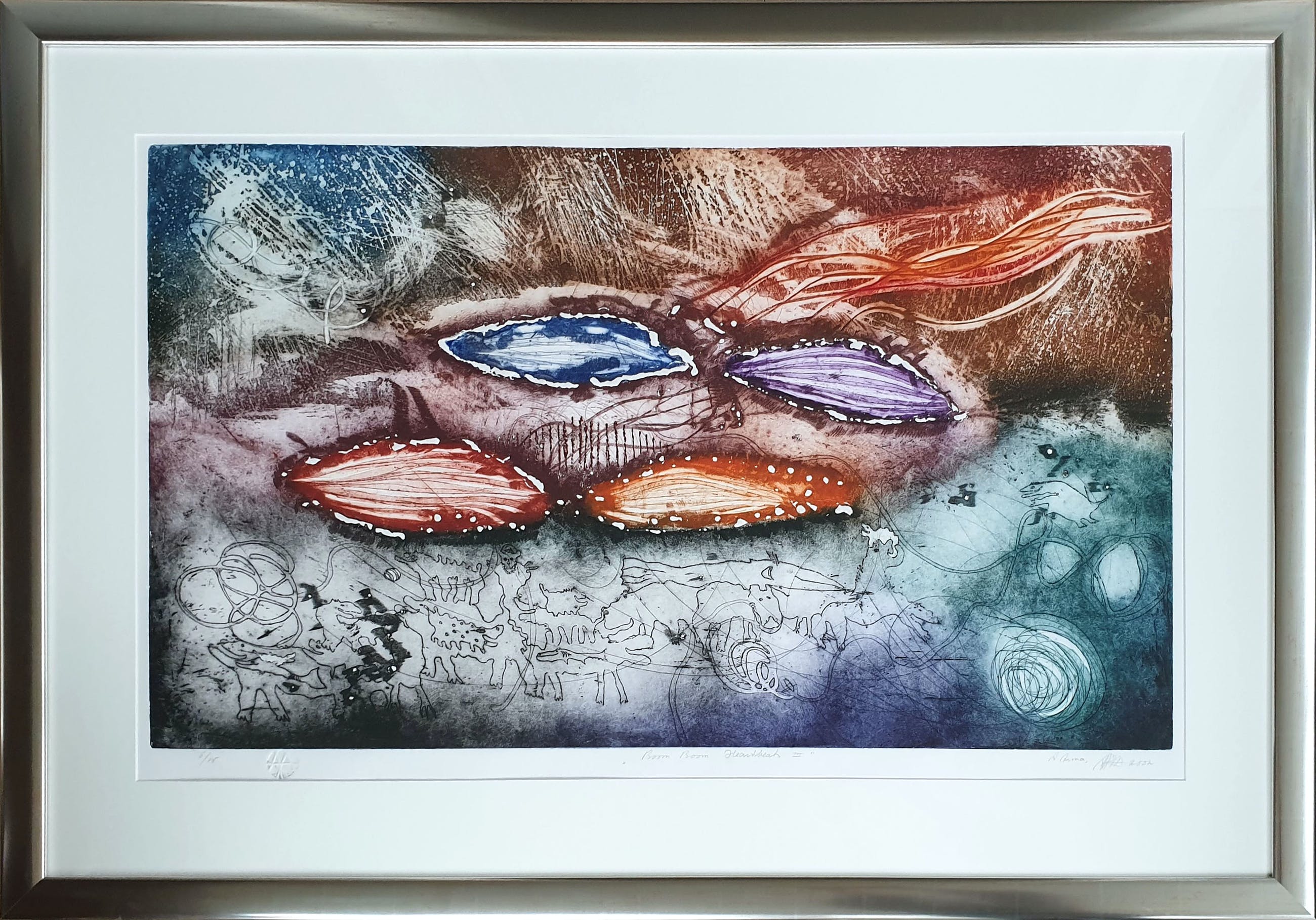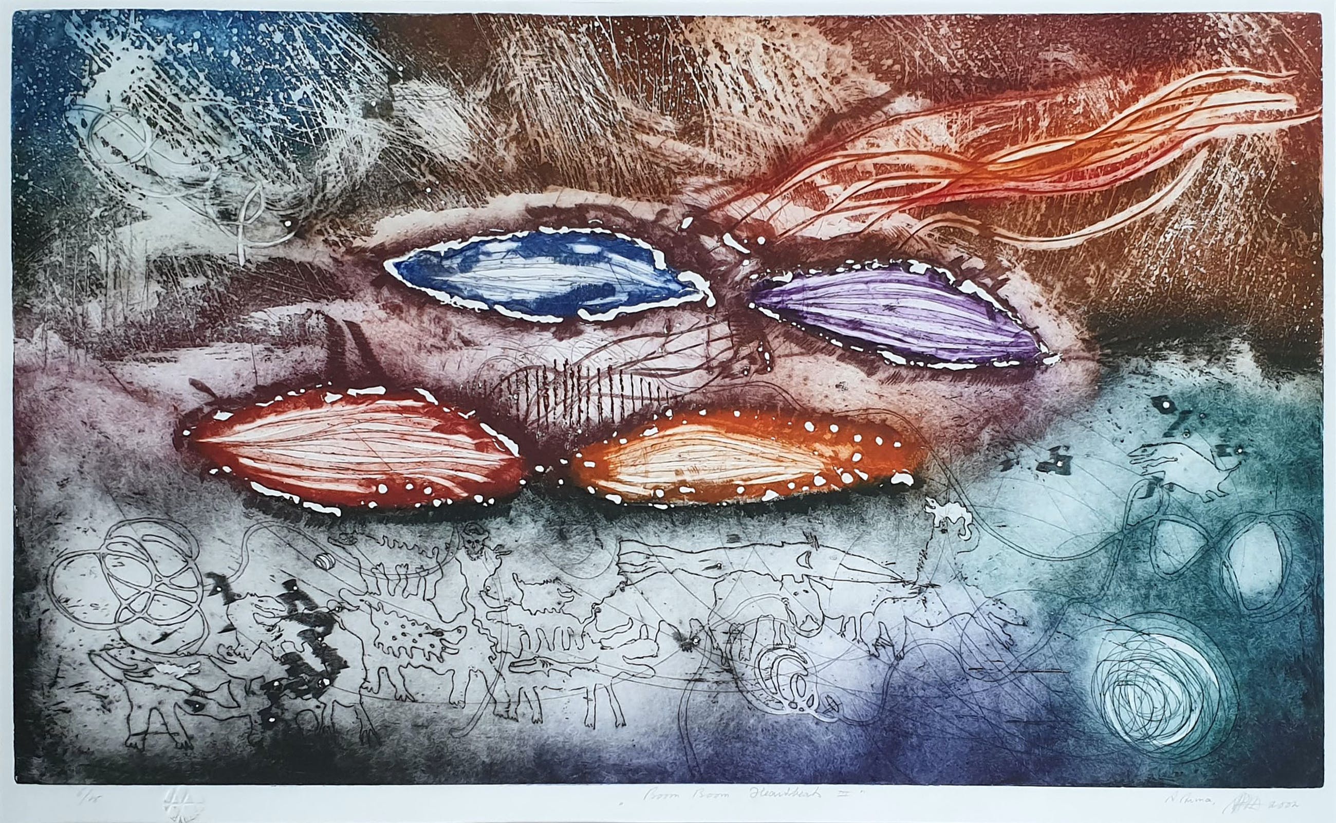 Zeer fraaie ets van Ad Arma met de titel: 'Boom Boom Heartbeat III' uit 2002. Rechtsonder met de hand gesigneerd door de kunstenaar.