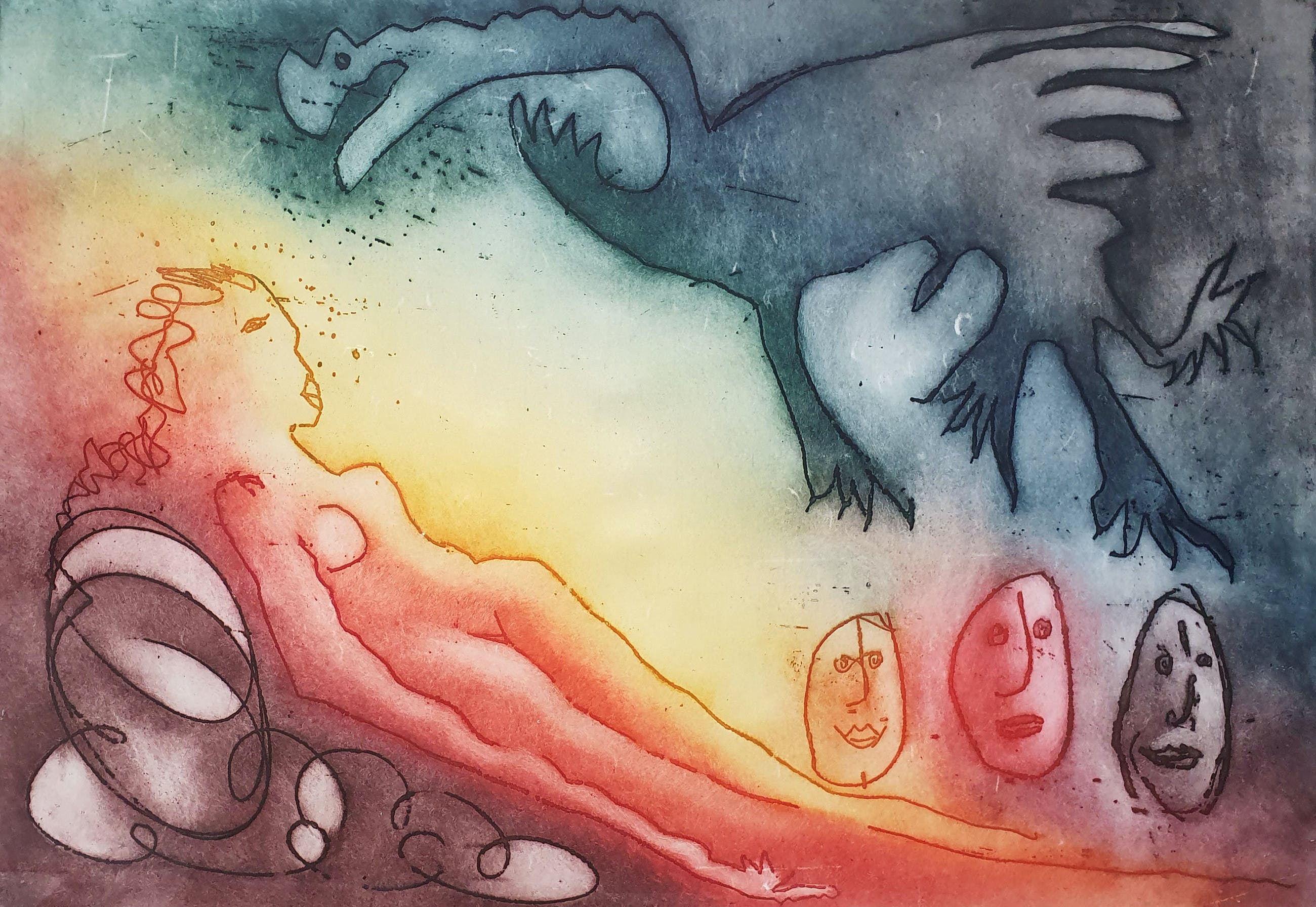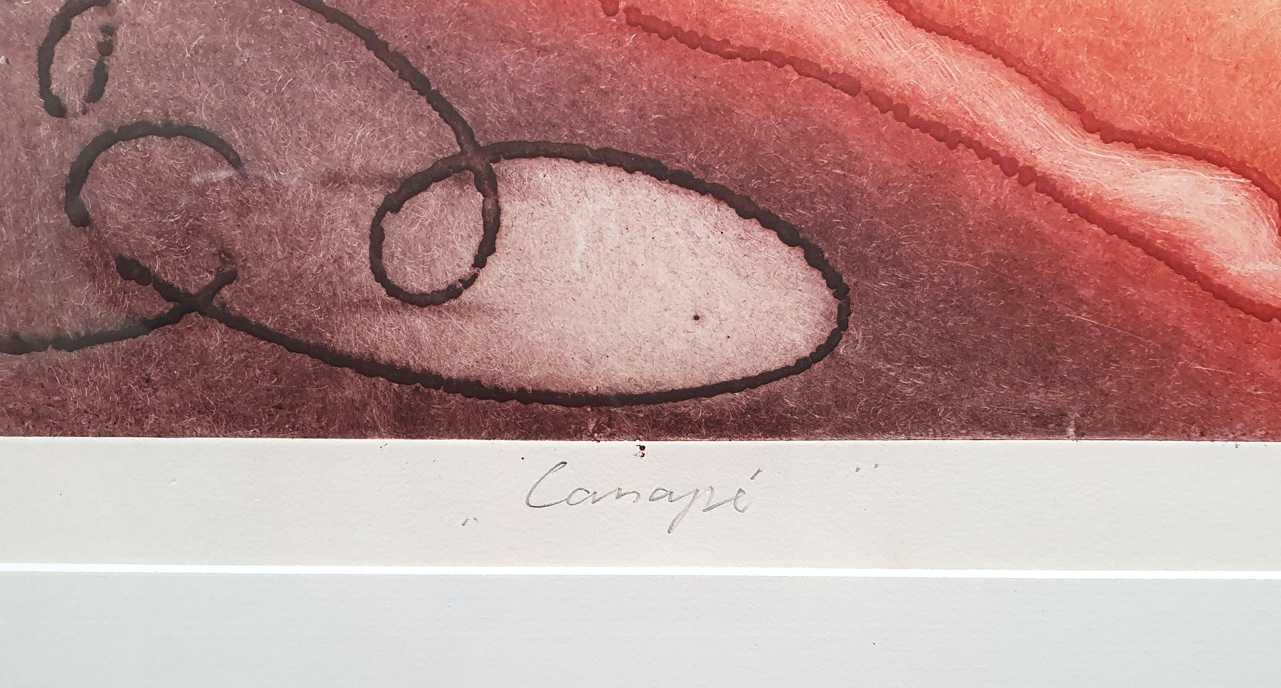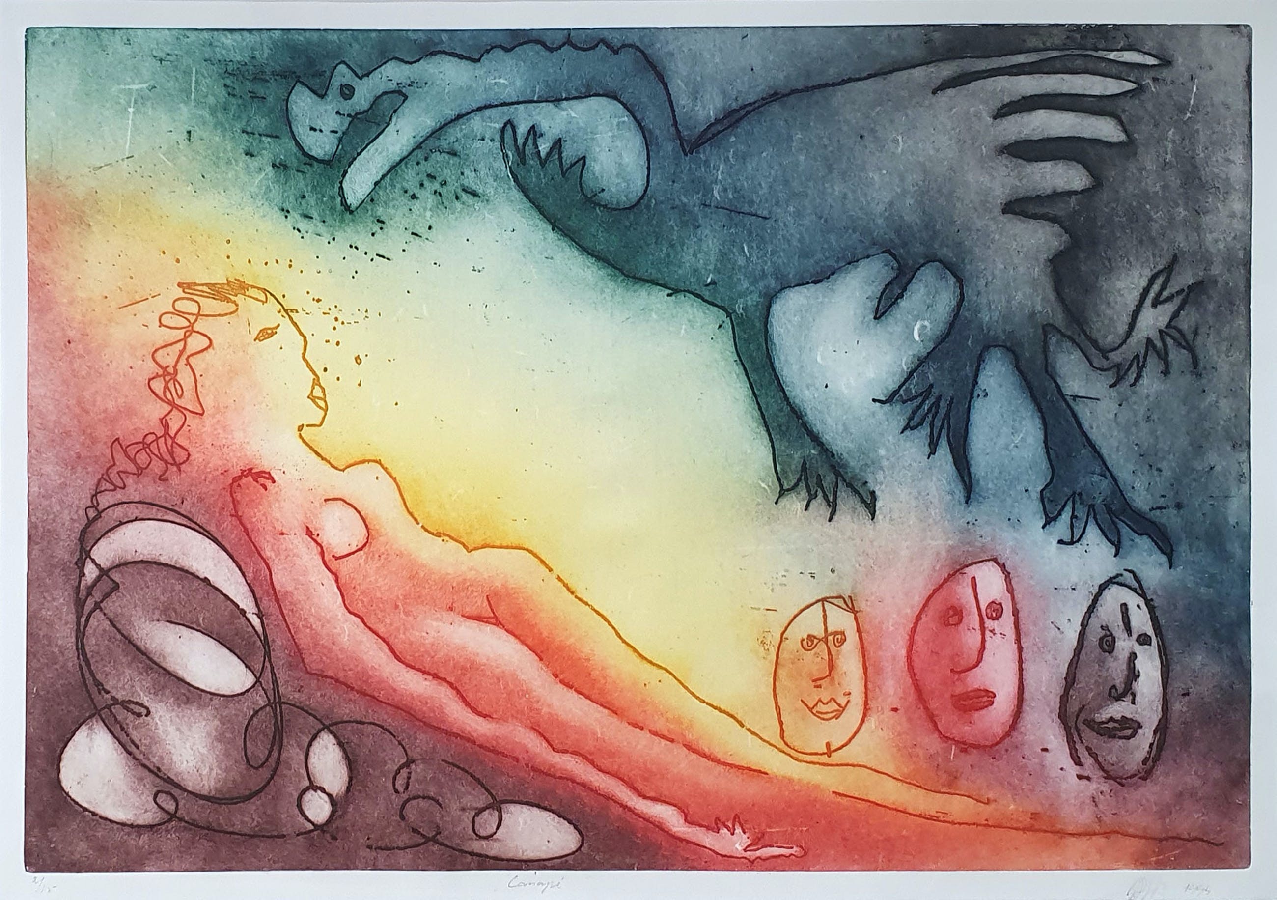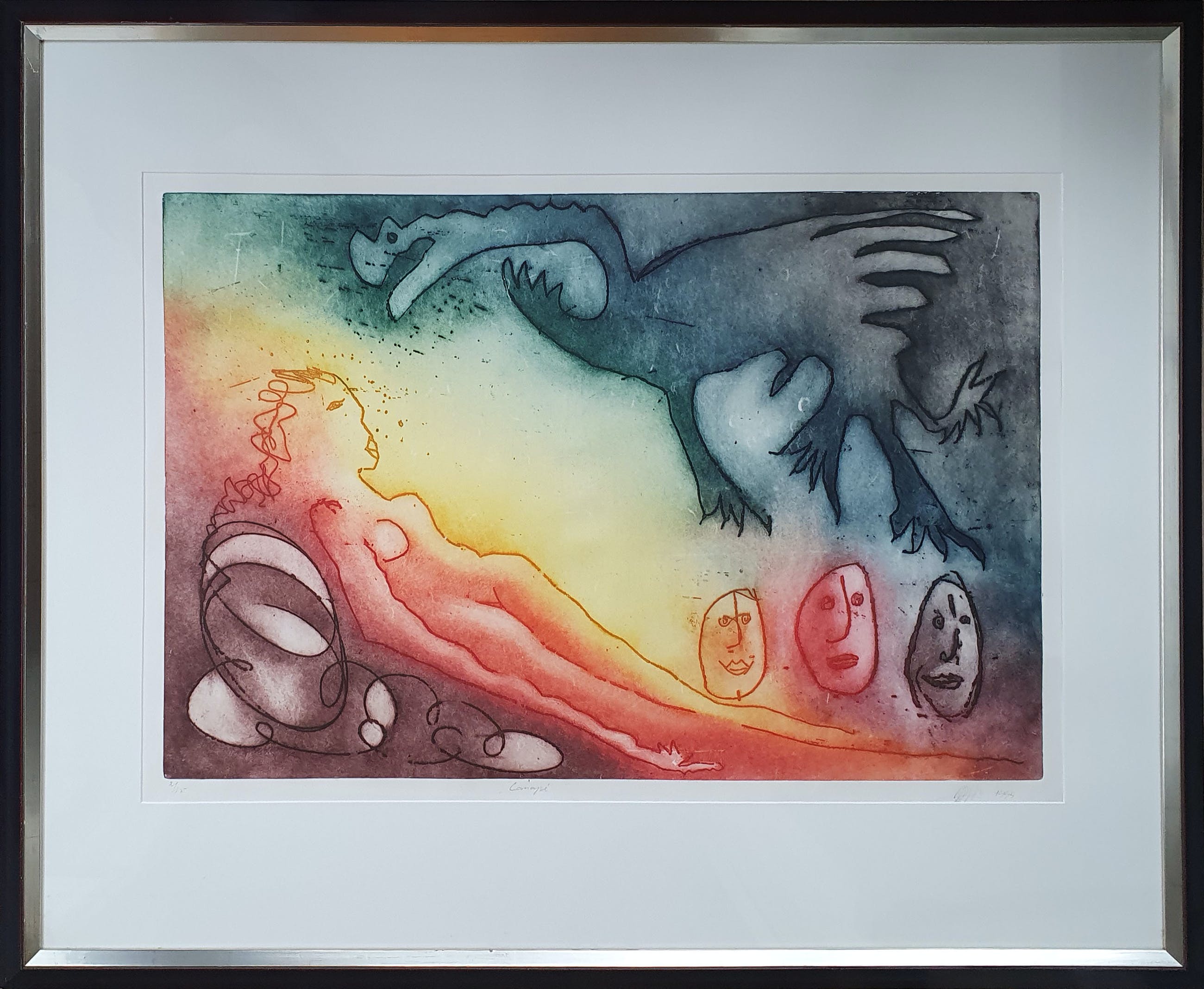 Kleurrijke ets van Ad Arma met de titel: 'Canapé'. Het werk is rechtsonder met de hand gesigneerd door de kunstenaar.