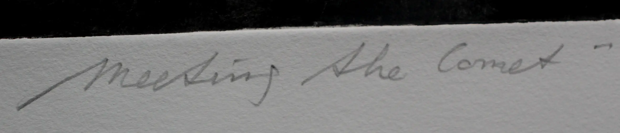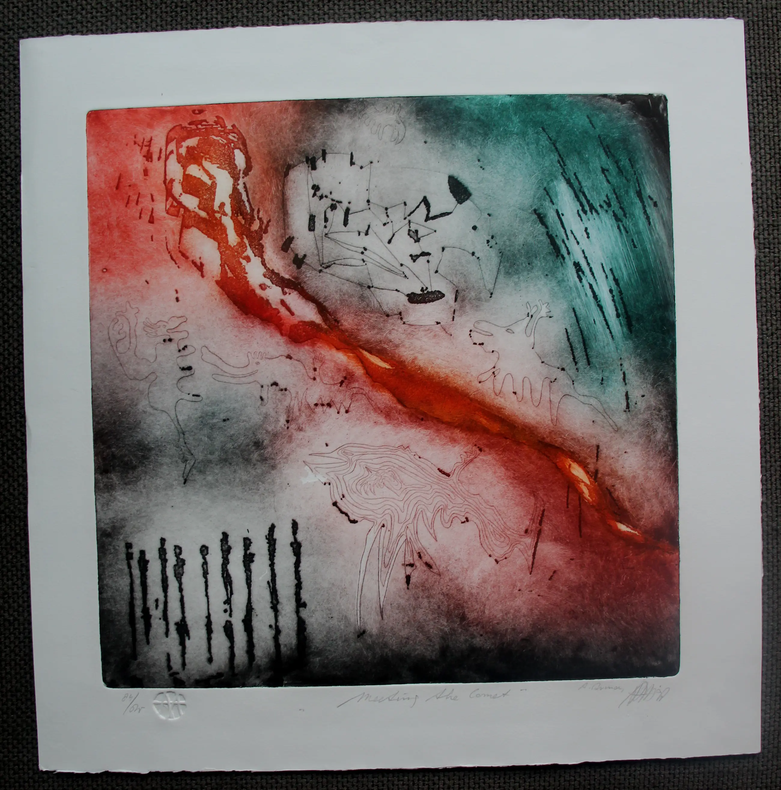 Ets van Ad Arma. Titel: "Meeting the cornet". Oplage: 84/85. Afmetingen blad: H50.5 x b50cm. Afmetingen voorstelling: H39 x b40cm. Het werk is rechts onderaan, met potlood gesigneerd, door de kunstenaar. De authenticiteit van het aangeboden werk wordt volledig gegarandeerd. Een certificaat van echtheid kan, op aanvraag worden gemaild.