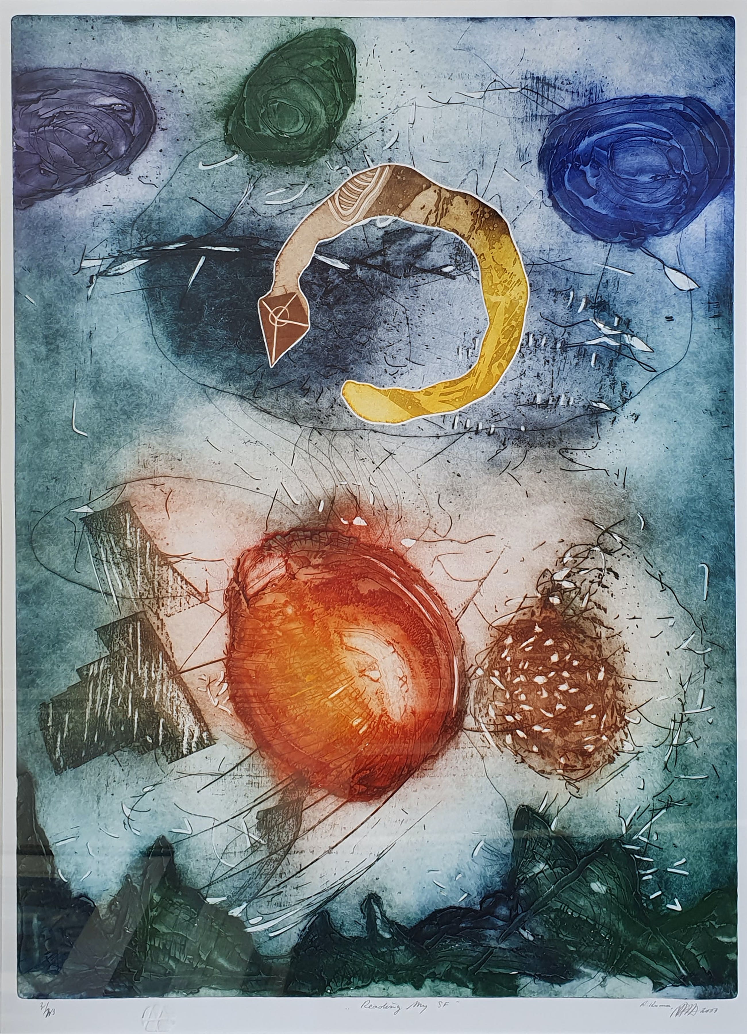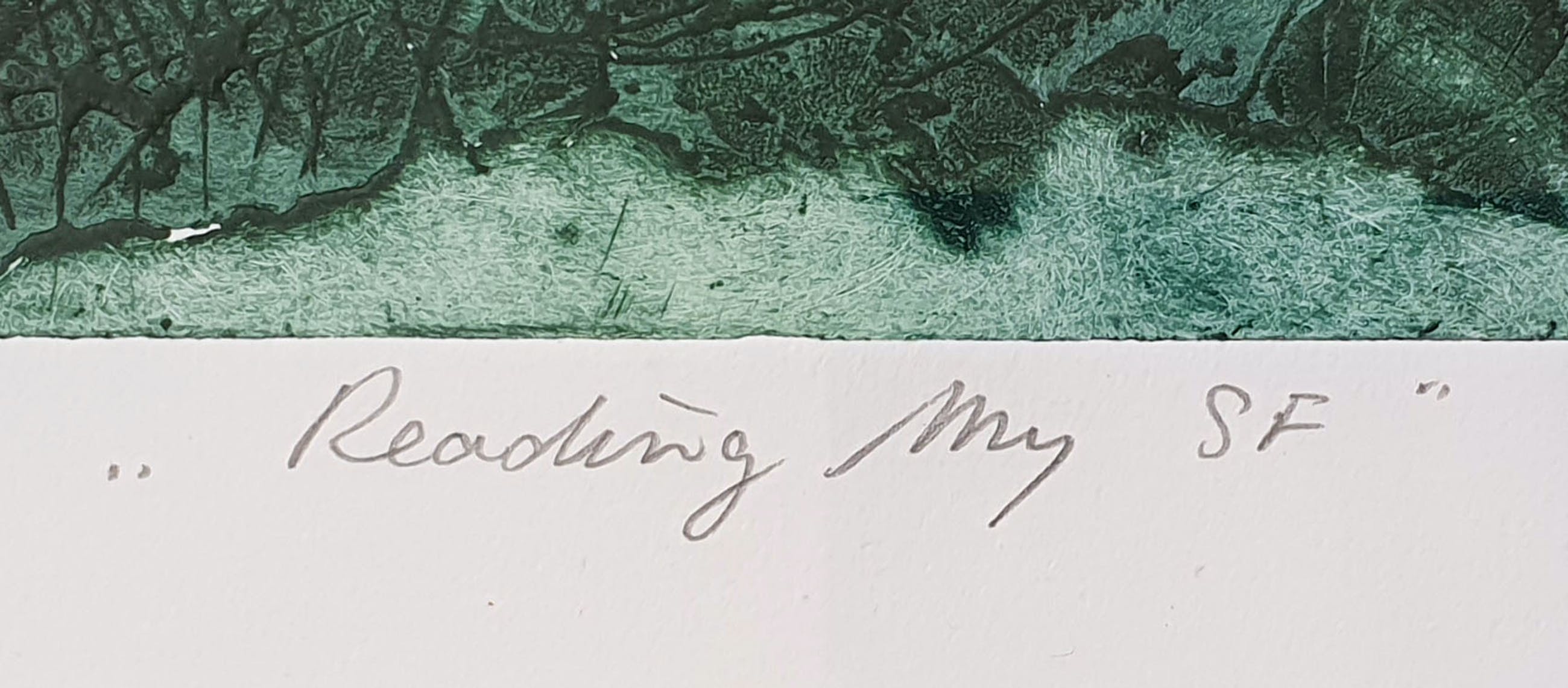 Zeer fraaie kleurrijke ets van Ad Arma met de titel: 'Reading my SF'. Het werk is rechtsonder met de hand gesigneerd door de kunstenaar.