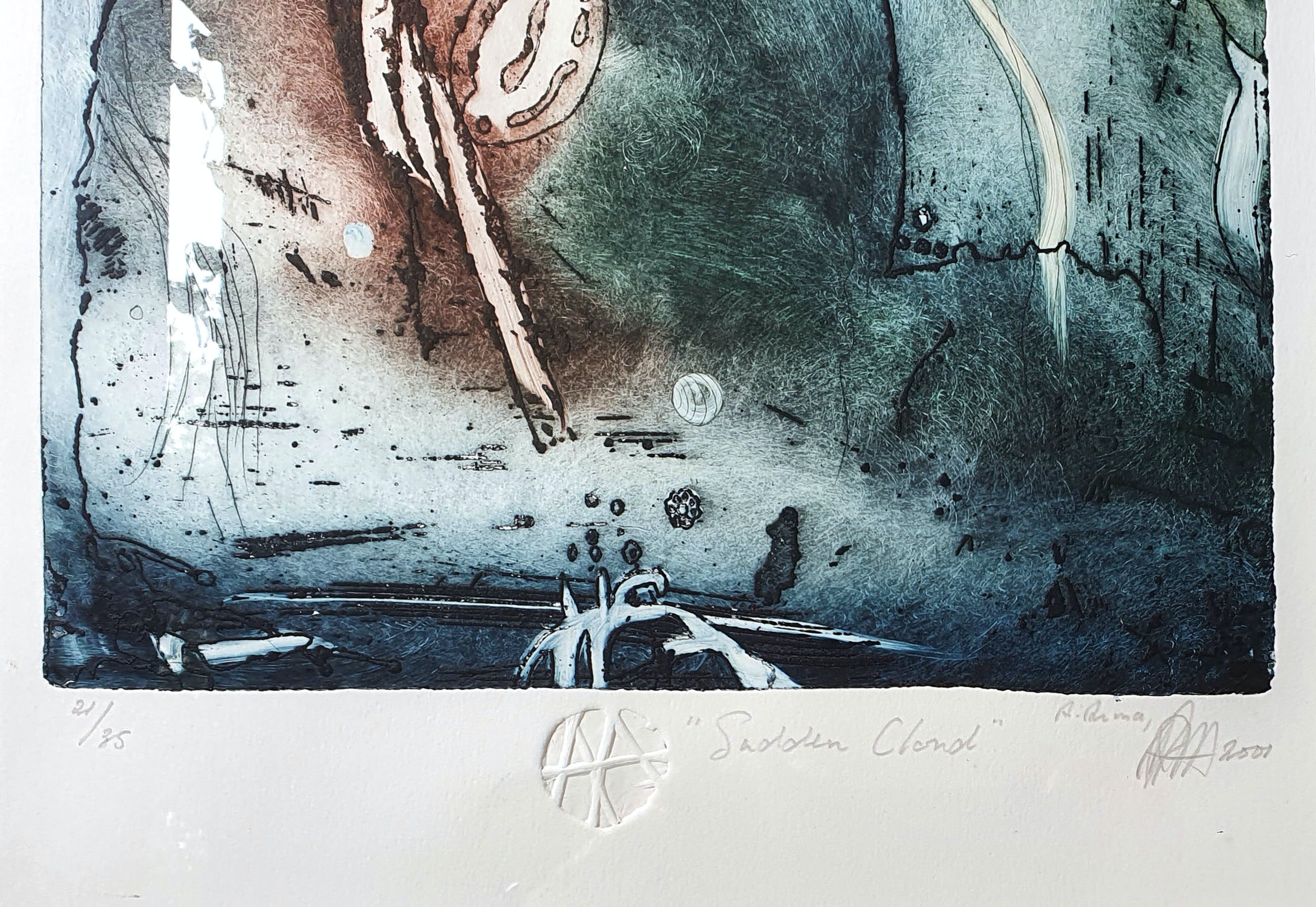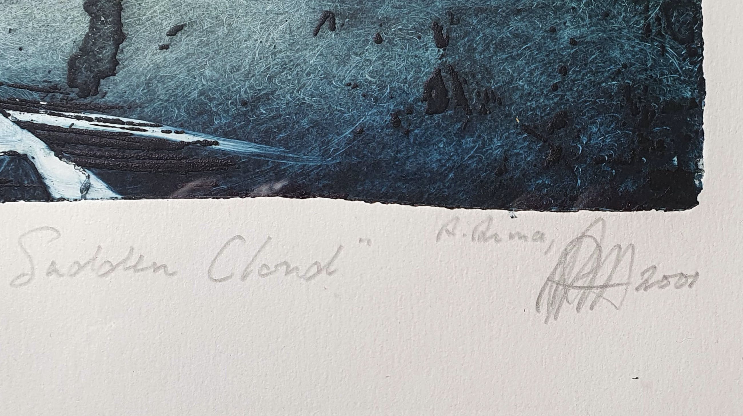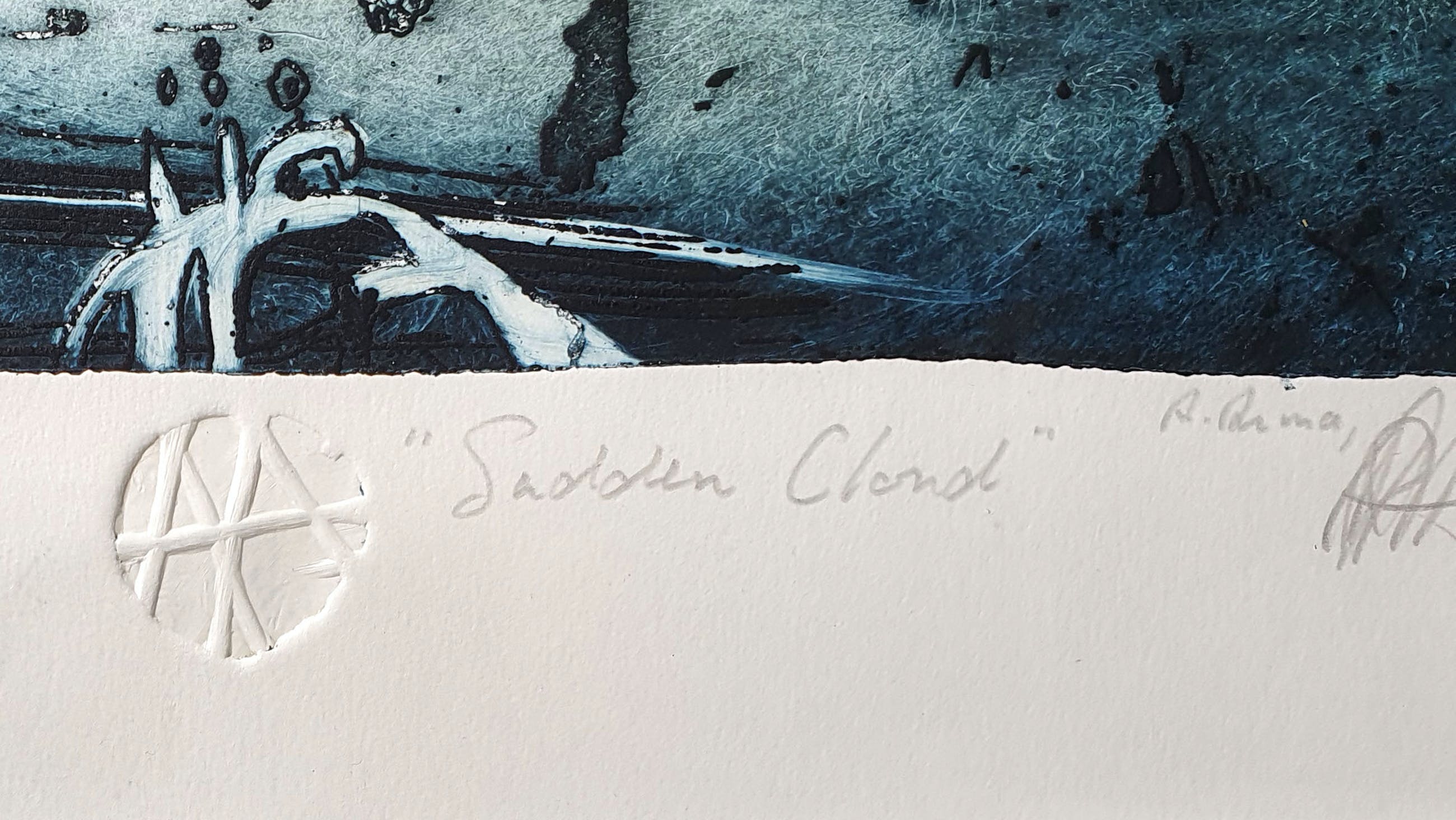 Zeer fraaie kleurrijke ets van Ad Arma met de titel: 'Sudden cloud' uit 2001. Het werk is rechtsonder met de hand gesigneerd door de kunstenaar.