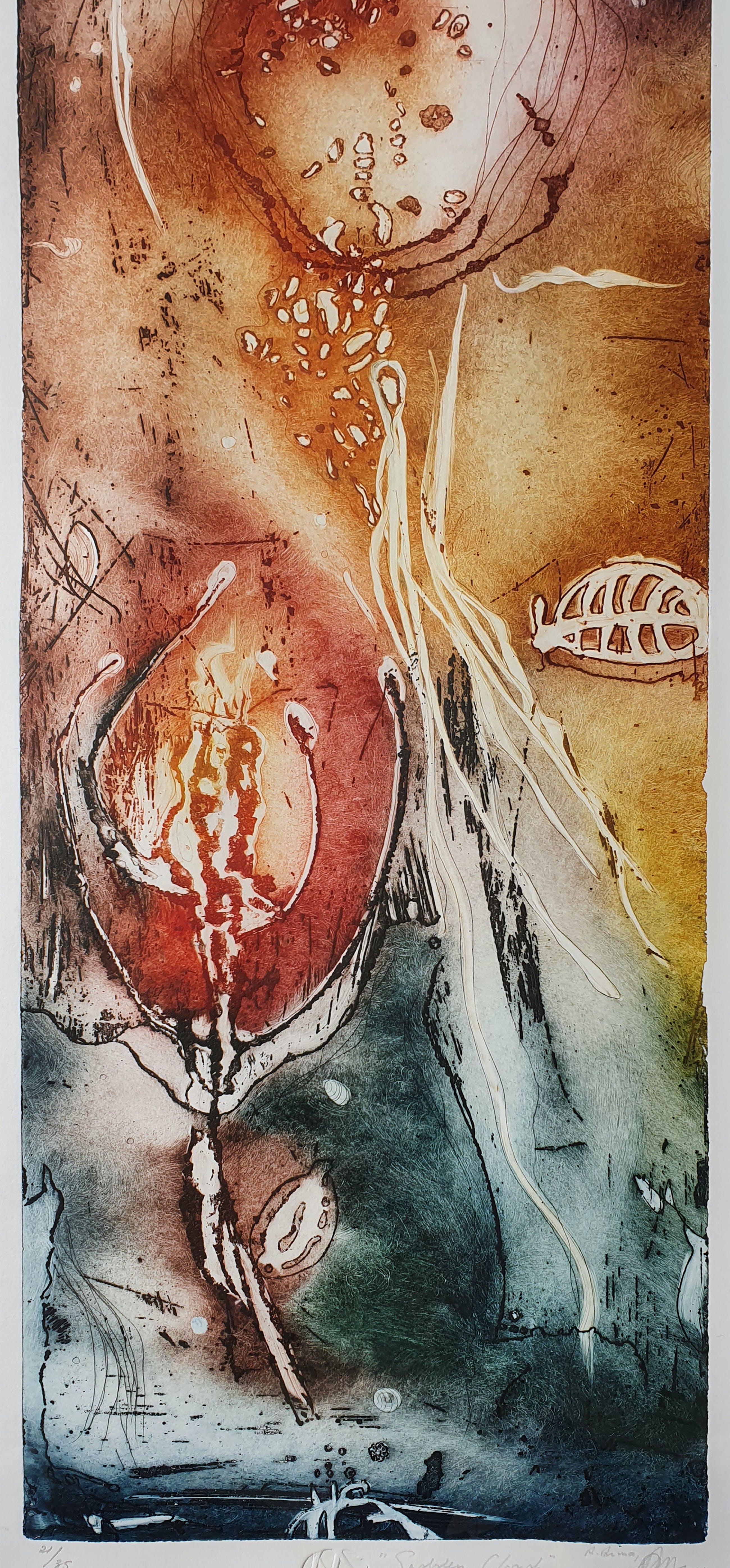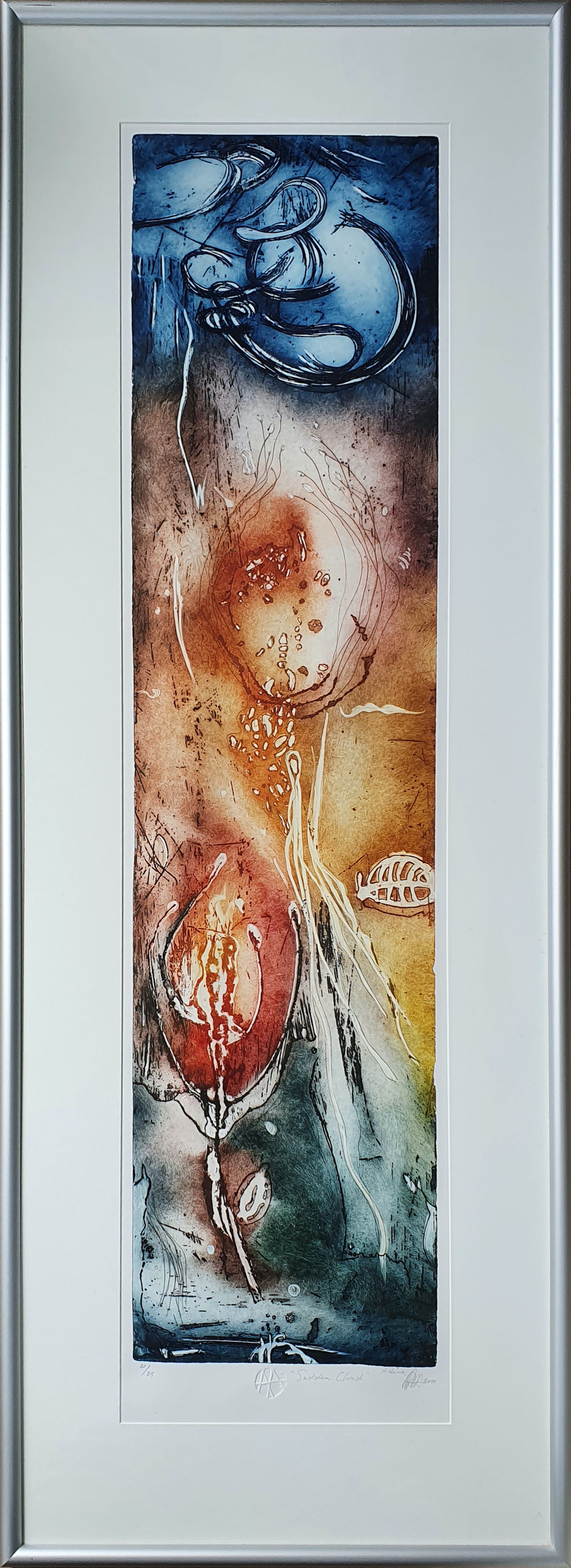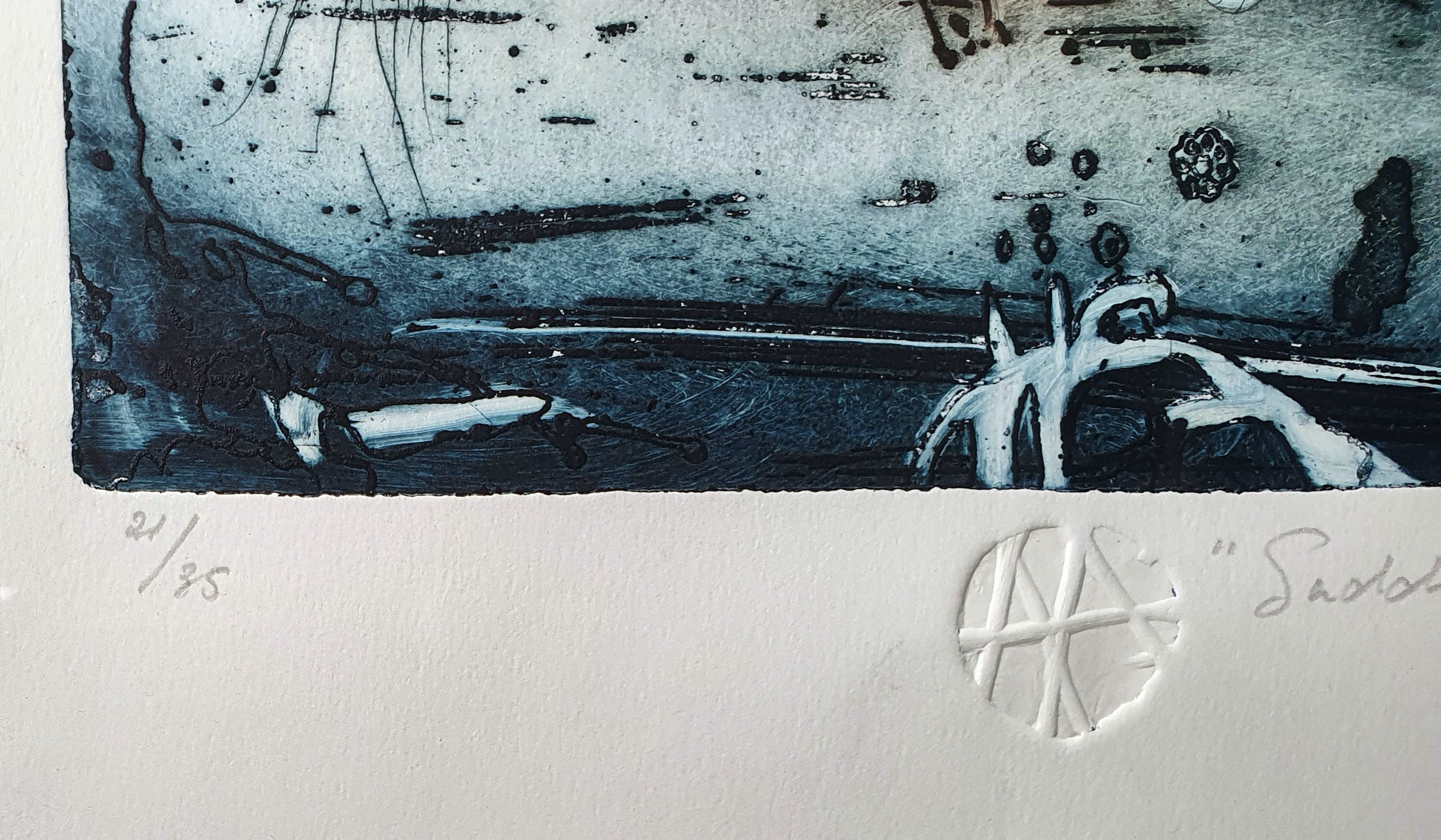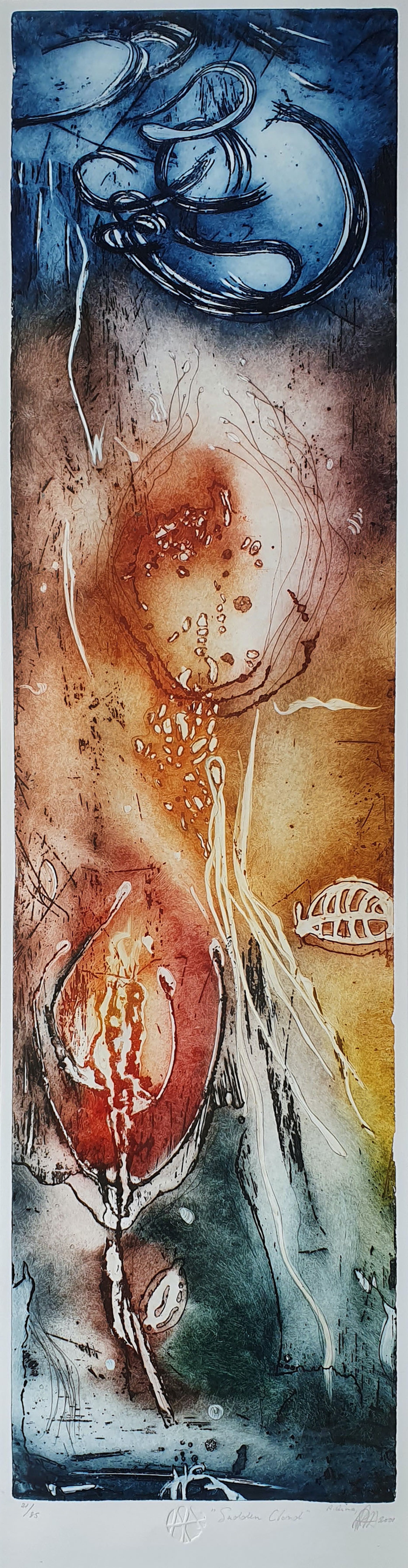 Zeer fraaie kleurrijke ets van Ad Arma met de titel: 'Sudden cloud' uit 2001. Het werk is rechtsonder met de hand gesigneerd door de kunstenaar.