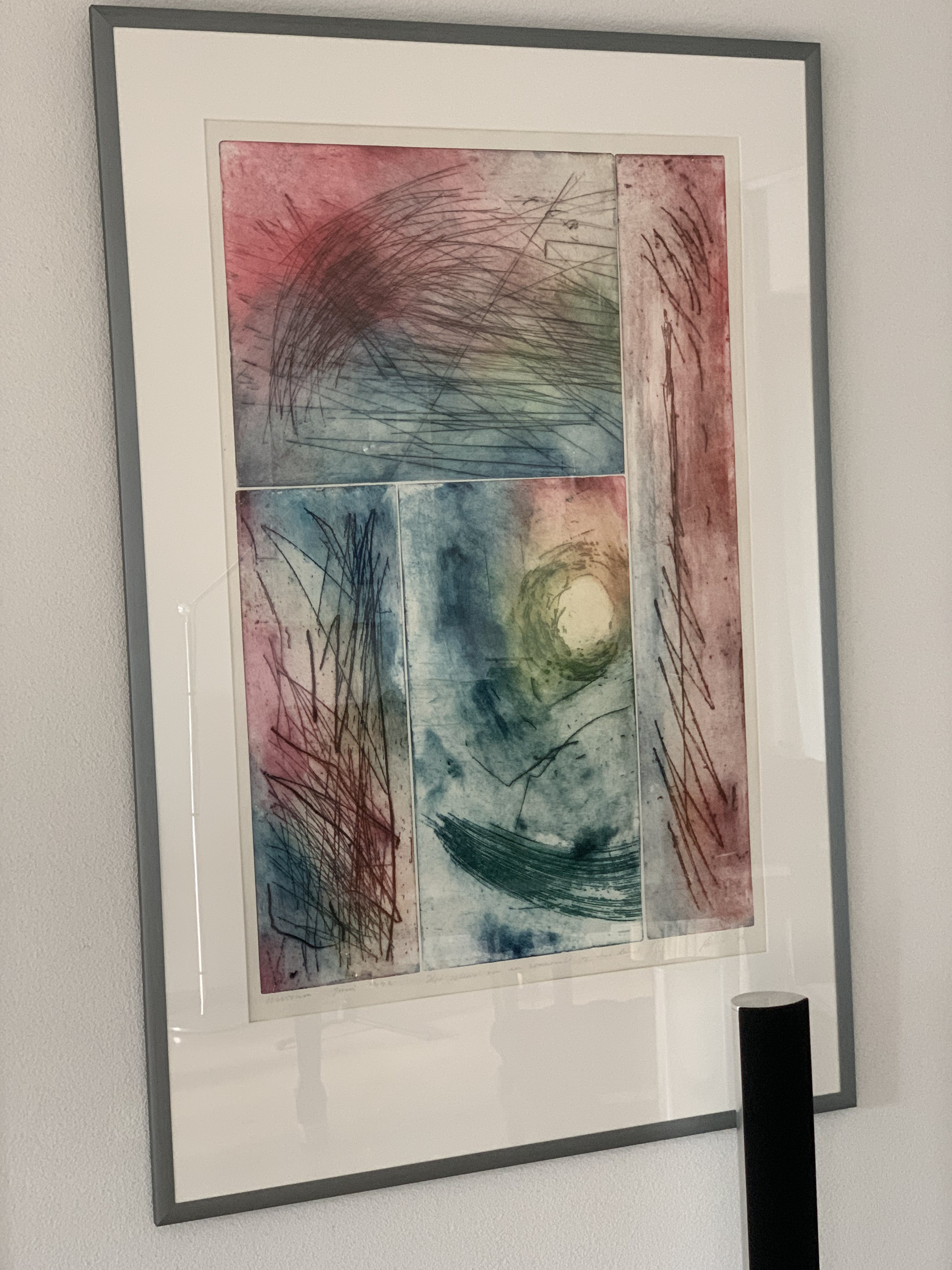 Te koop deze (zeer!) grote ets "het Geluid van een Zomernacht" van Ad Arma uit 1992. Het betreft een uniek werk, dus geen ets in serie! Fraaie compositie vanuit vier platen. Typisch Ad Arma thema. Gesigneerd onderzijde. Met droogstempel van Ad Arma in het papier. Echt fraai en uniek werk.
