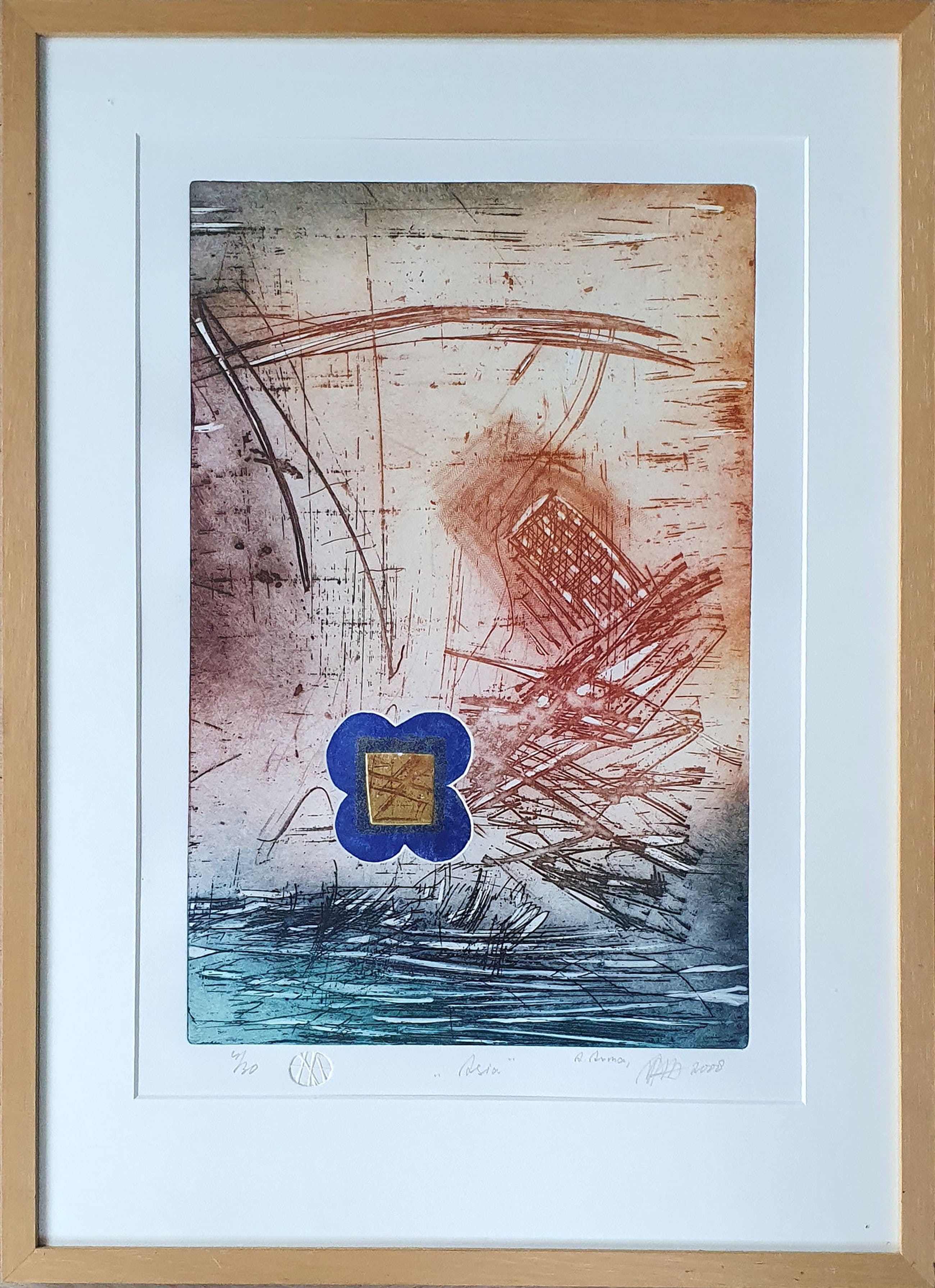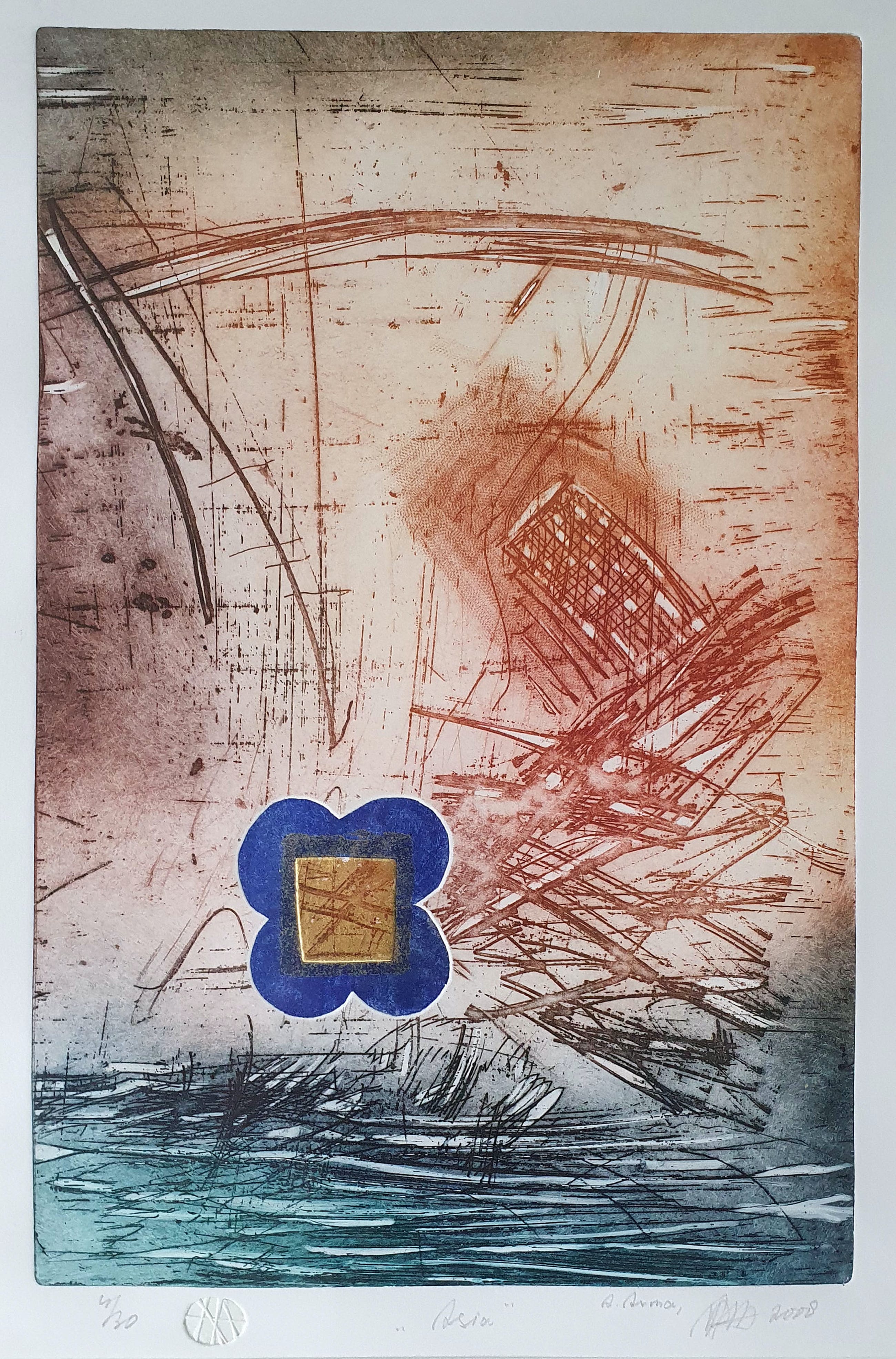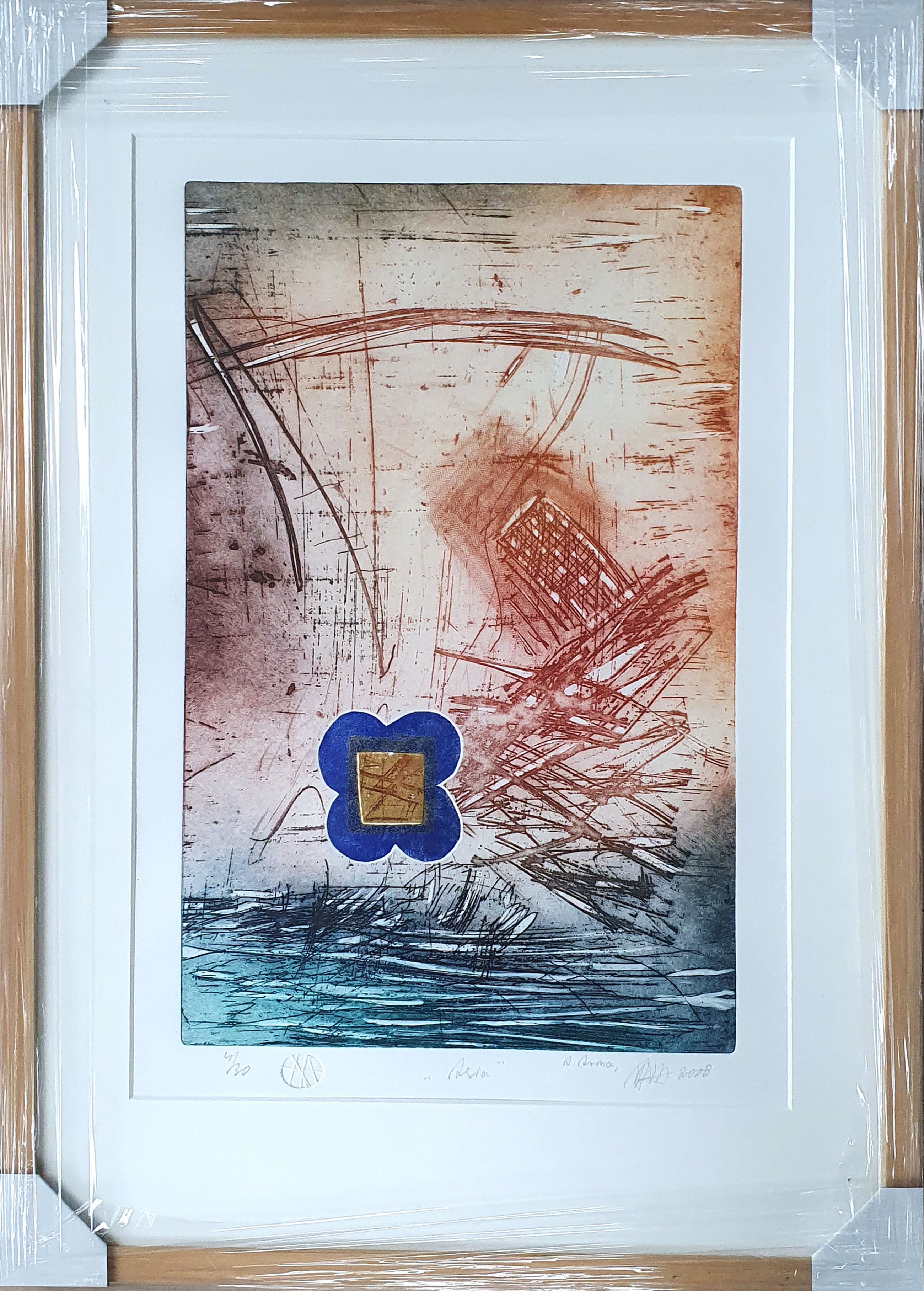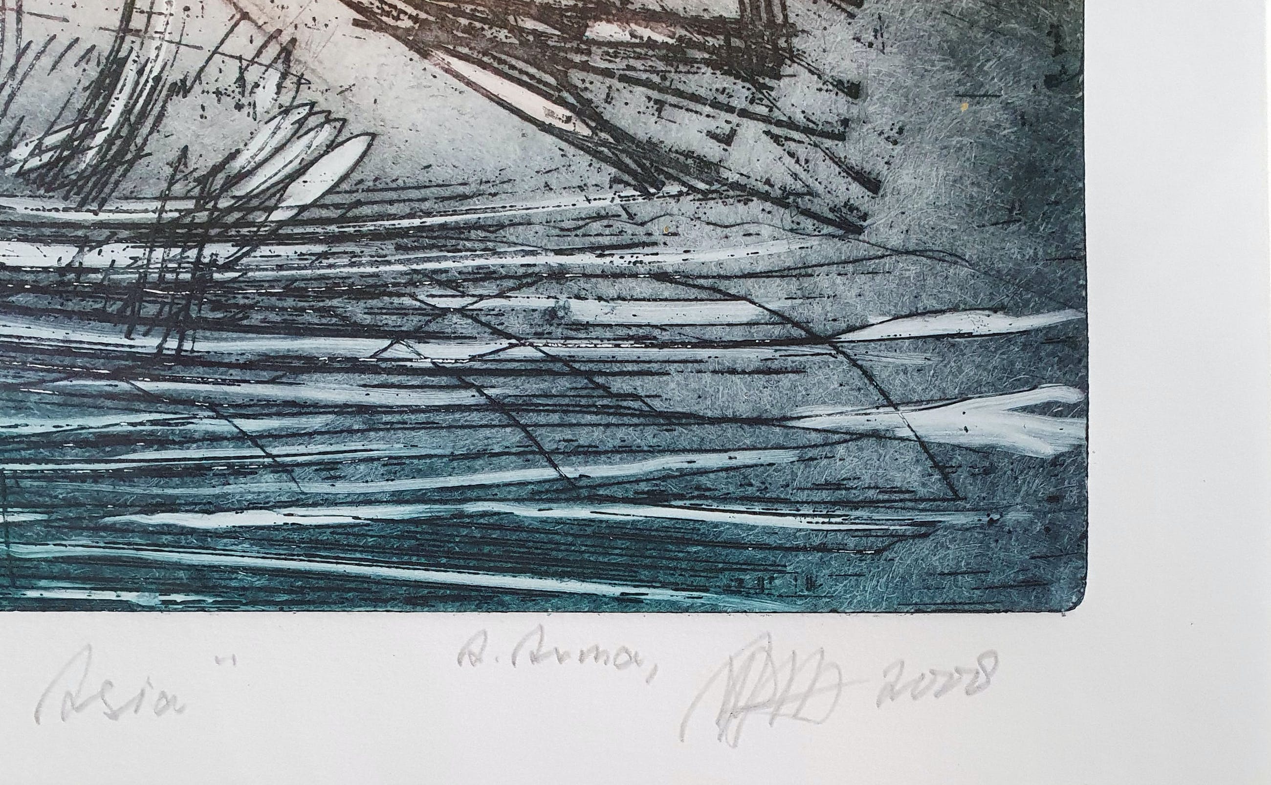 Ets uit 2008 van Ad Arma met de titel: 'Asia'. Het werk is rechtsonder met de hand gesigneerd door de kunstenaar.
