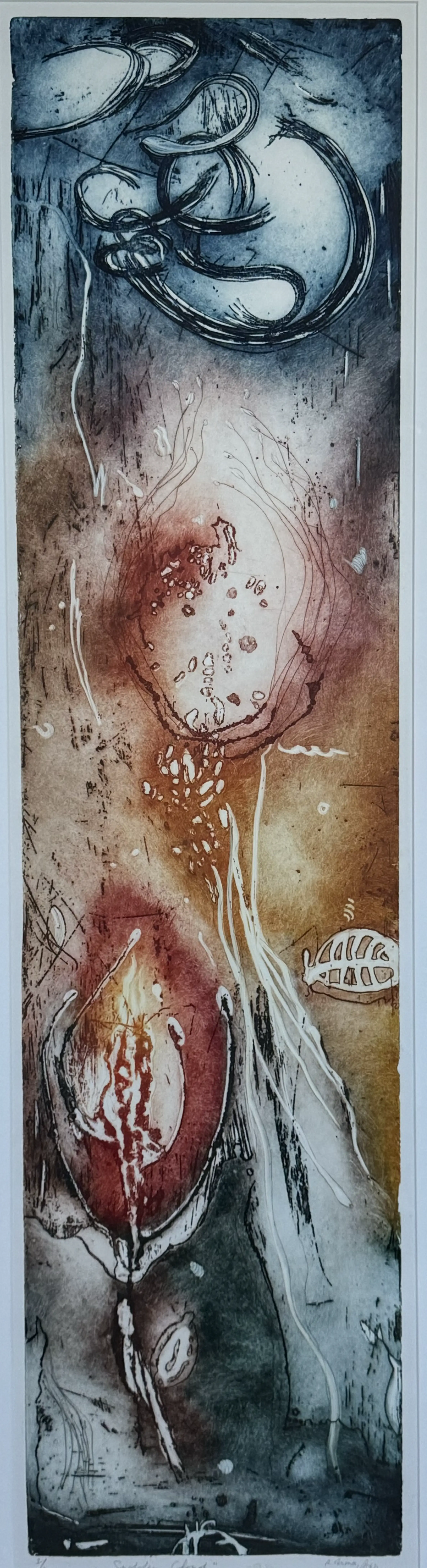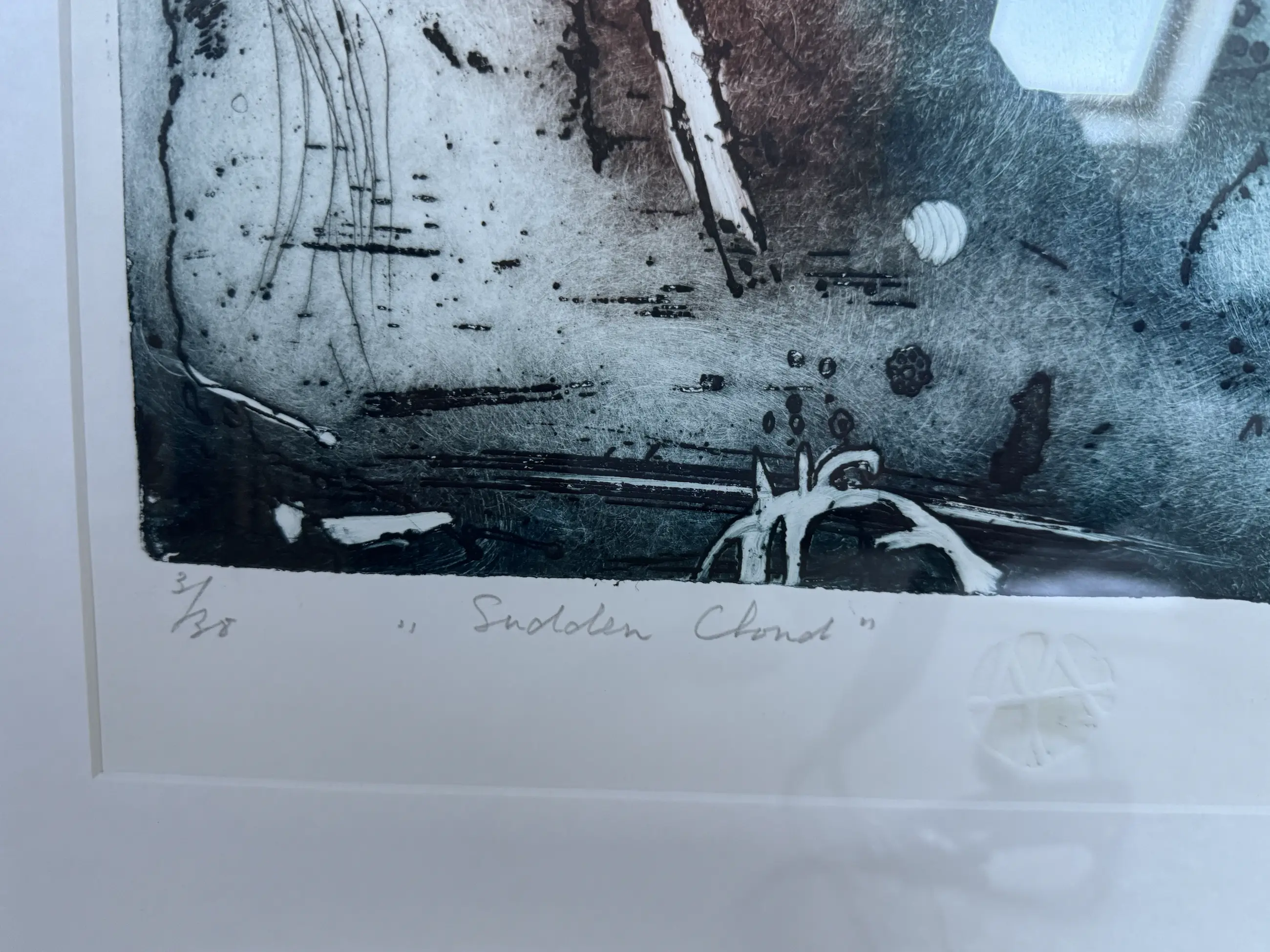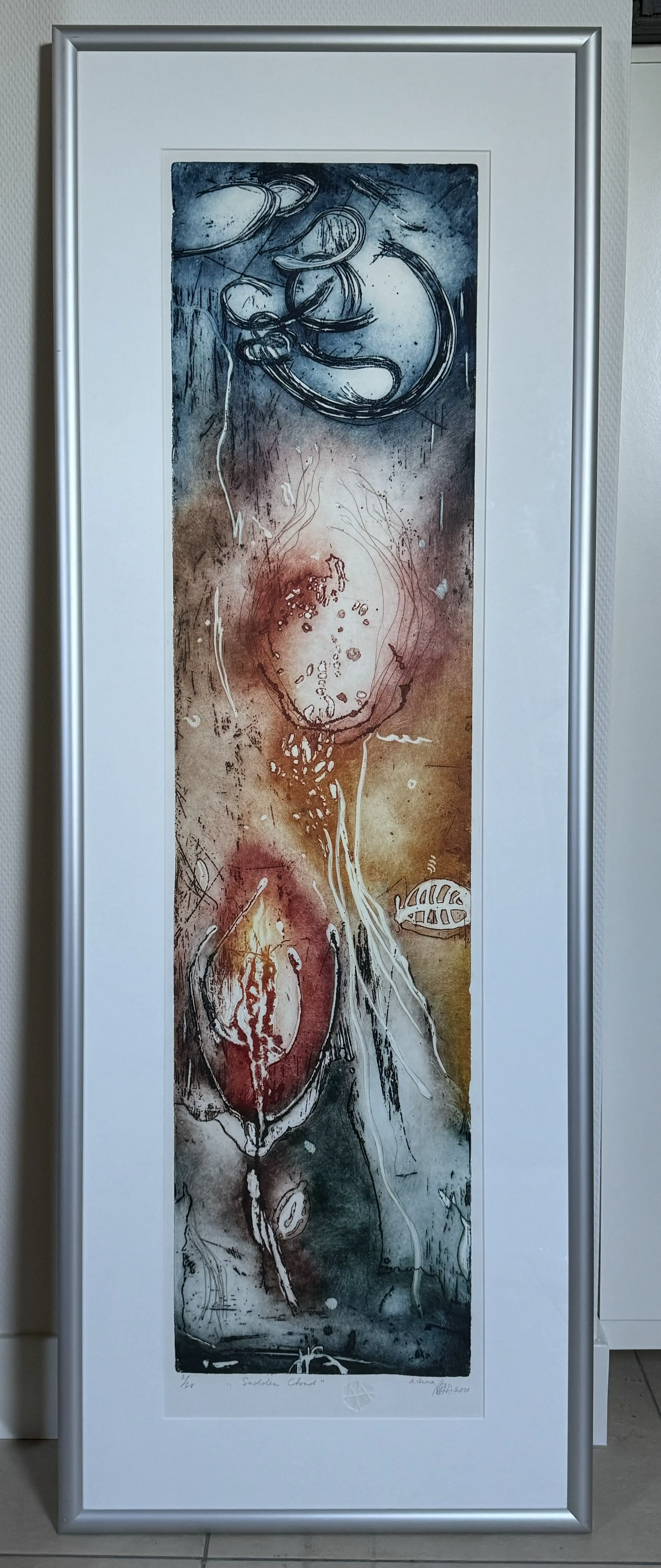 Prachtig kleurrijke ets van Ad Arma in groot formaat, ingelijst met passe partout in aluminium moderne lijst. In uitstekende staat. Handgesigneerd incl Ad Arma's zegel.