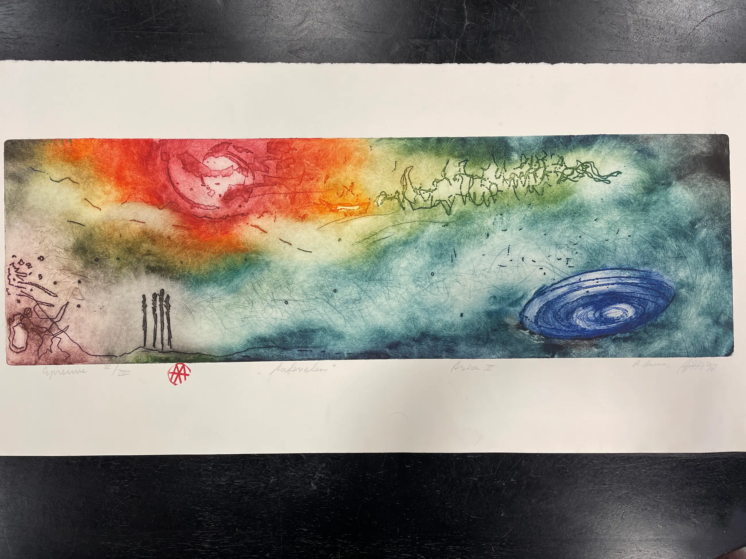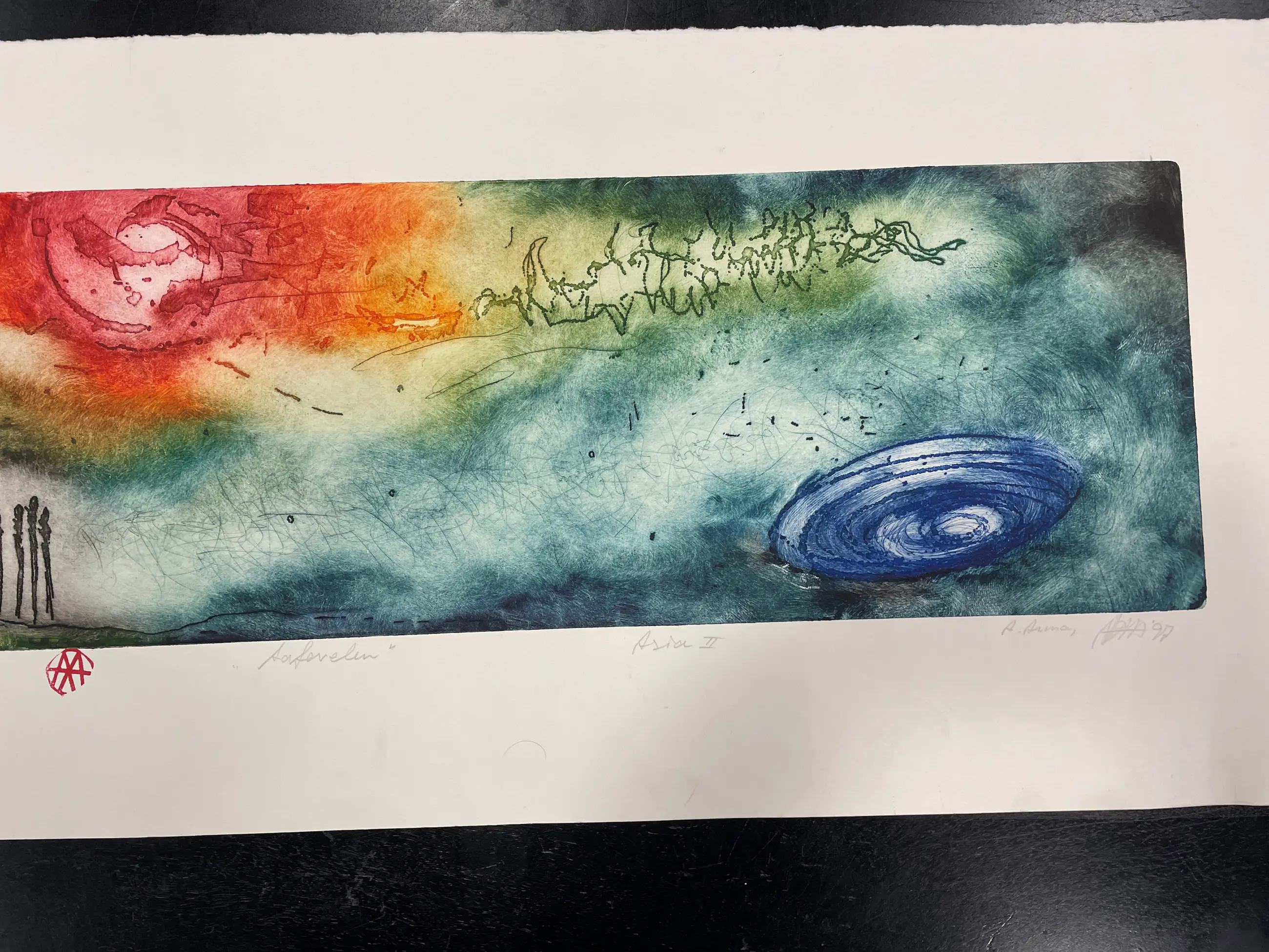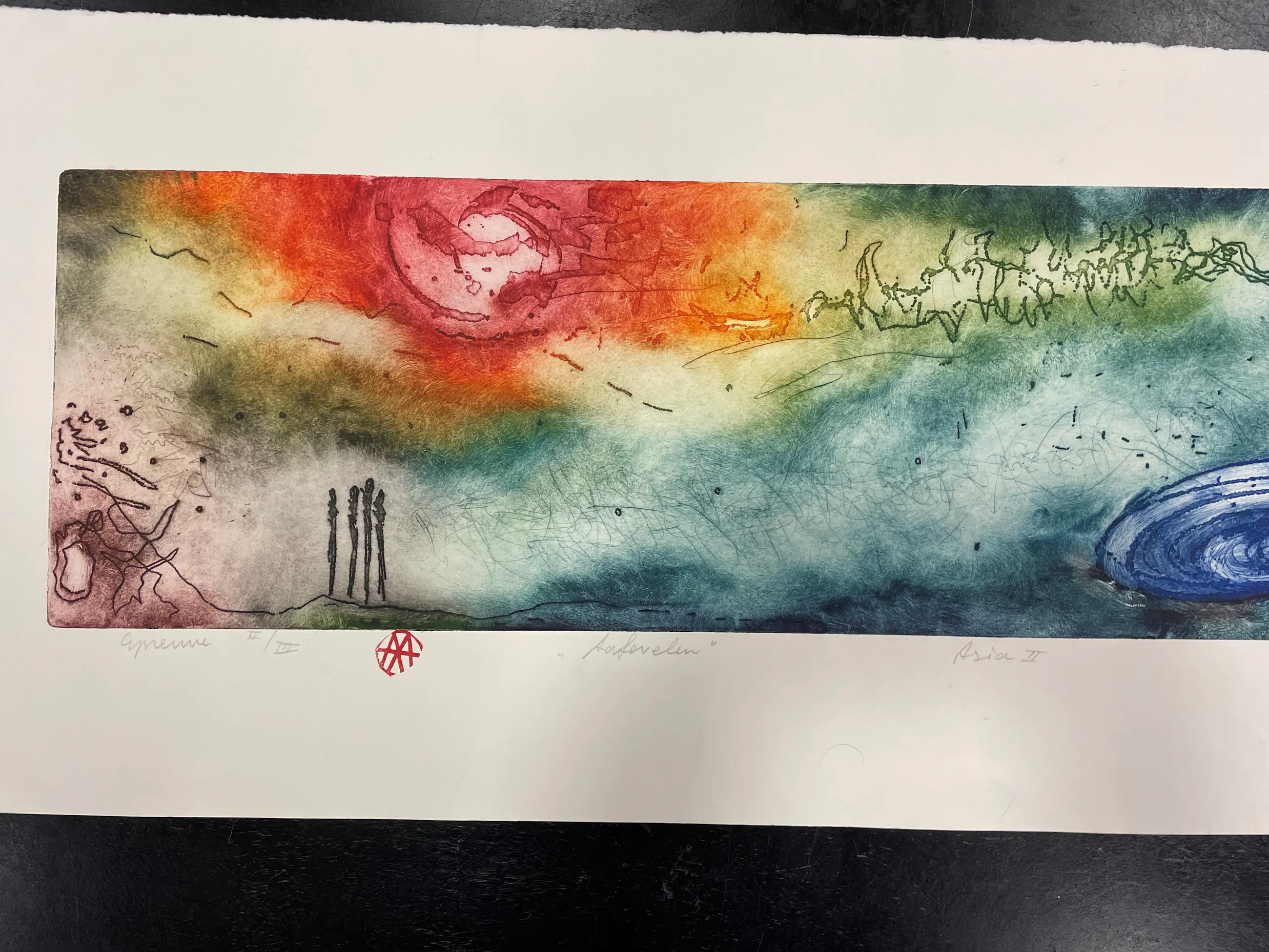 Prachtige ets van Ad Arma met heldere kleuren. Kenmerkende ets van Ad zoals hij ze tegenwoordig in het klein maakt
