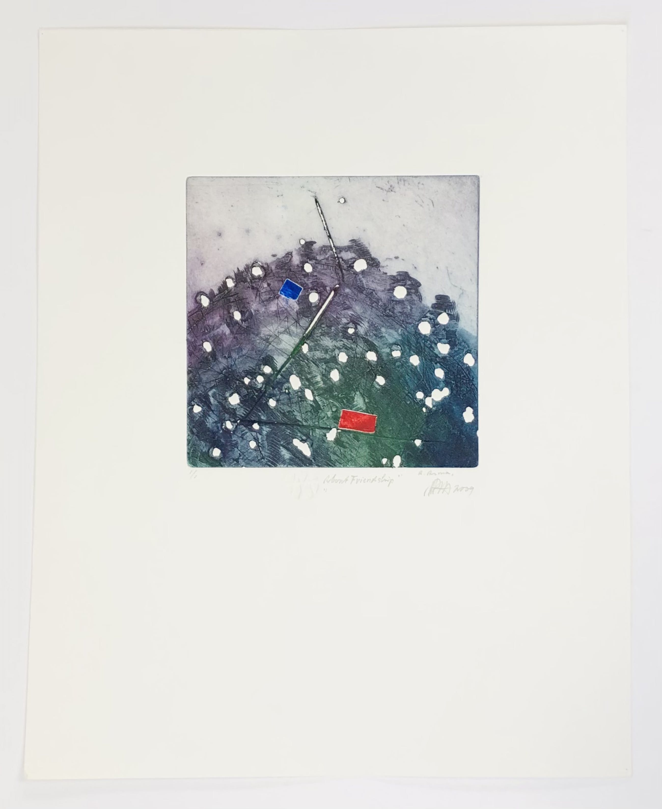 Zeer fraai uitgevoerd werk van de alleskunner Ad Arma. Hij schildert en beeldhouwt net zo makkelijk als hij etsen maakt. Ad Arma is een Nederlandse top-kunstenaar. In dit unieke werk komt de hand van de meester-etser tot uitdrukking. Een serie die hij About friendship heeft genoemd. Voorzien van signatuur, preegdruk en jaartal. De ets indruk zelf is ca 20 x 20 cm. Het werk verkeert in perfecte conditie. U kunt het werk vooraf komen bekijken in de schatkamer van galerie Rotor in Gorinchem of na aankoop ophalen. Het werk kan ook verzonden worden via aangetekende post. Wij kunnen het inlijstwerk voor u uitvoeren.