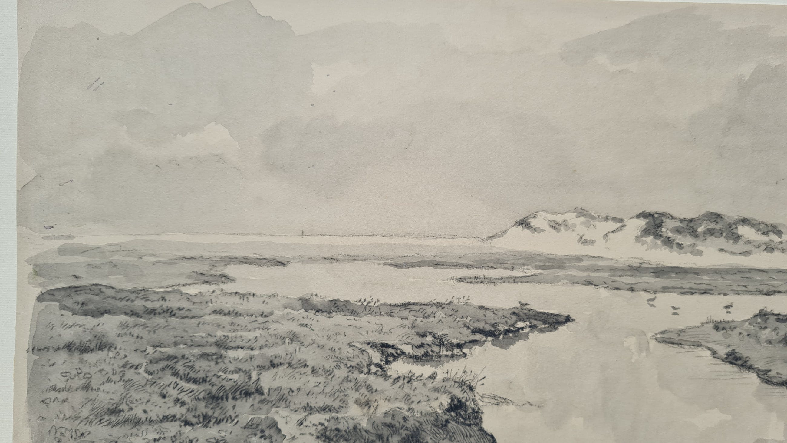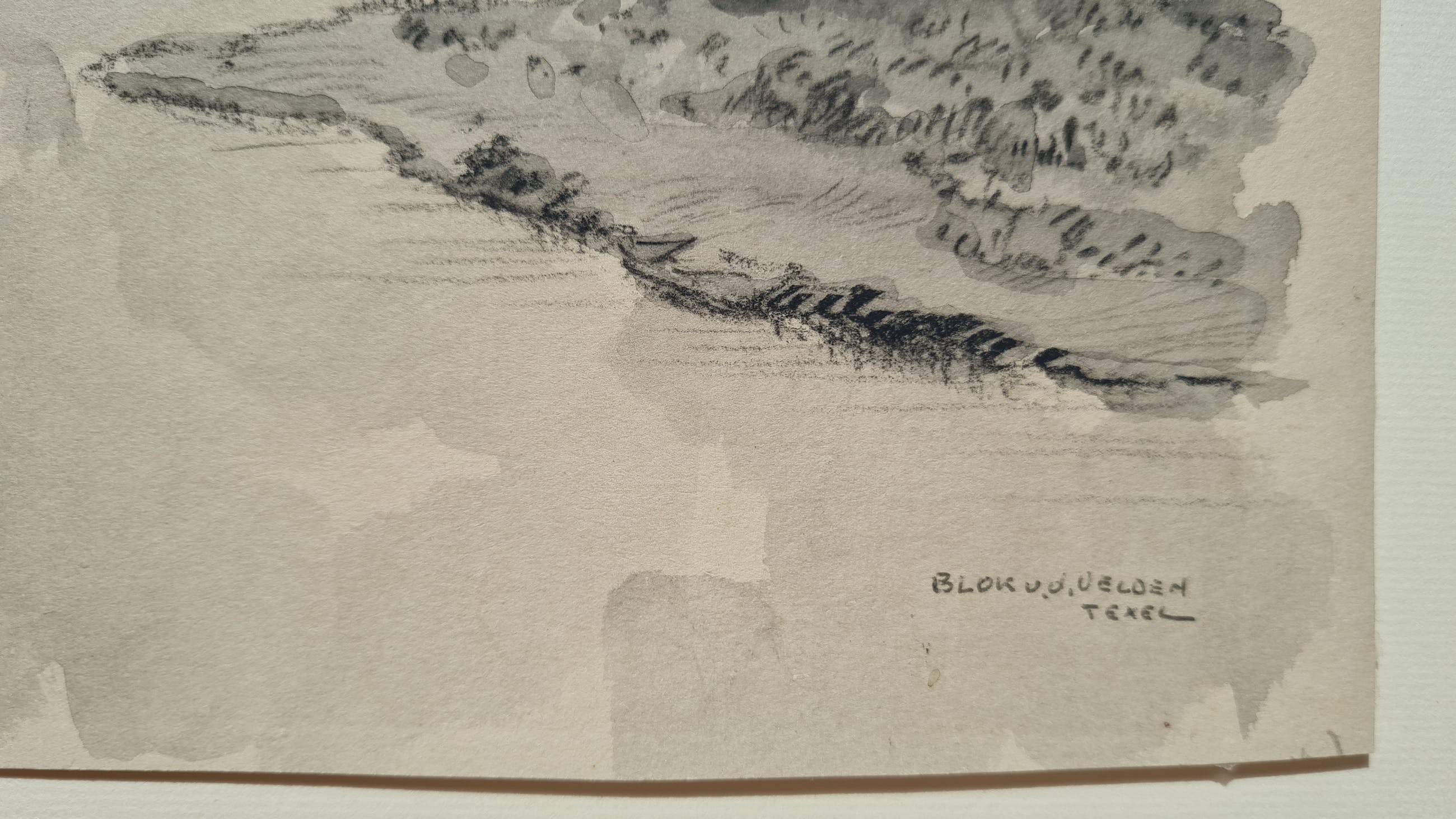 Mooie inkt en zwart krijt tekening van Texel, handgesigneert.