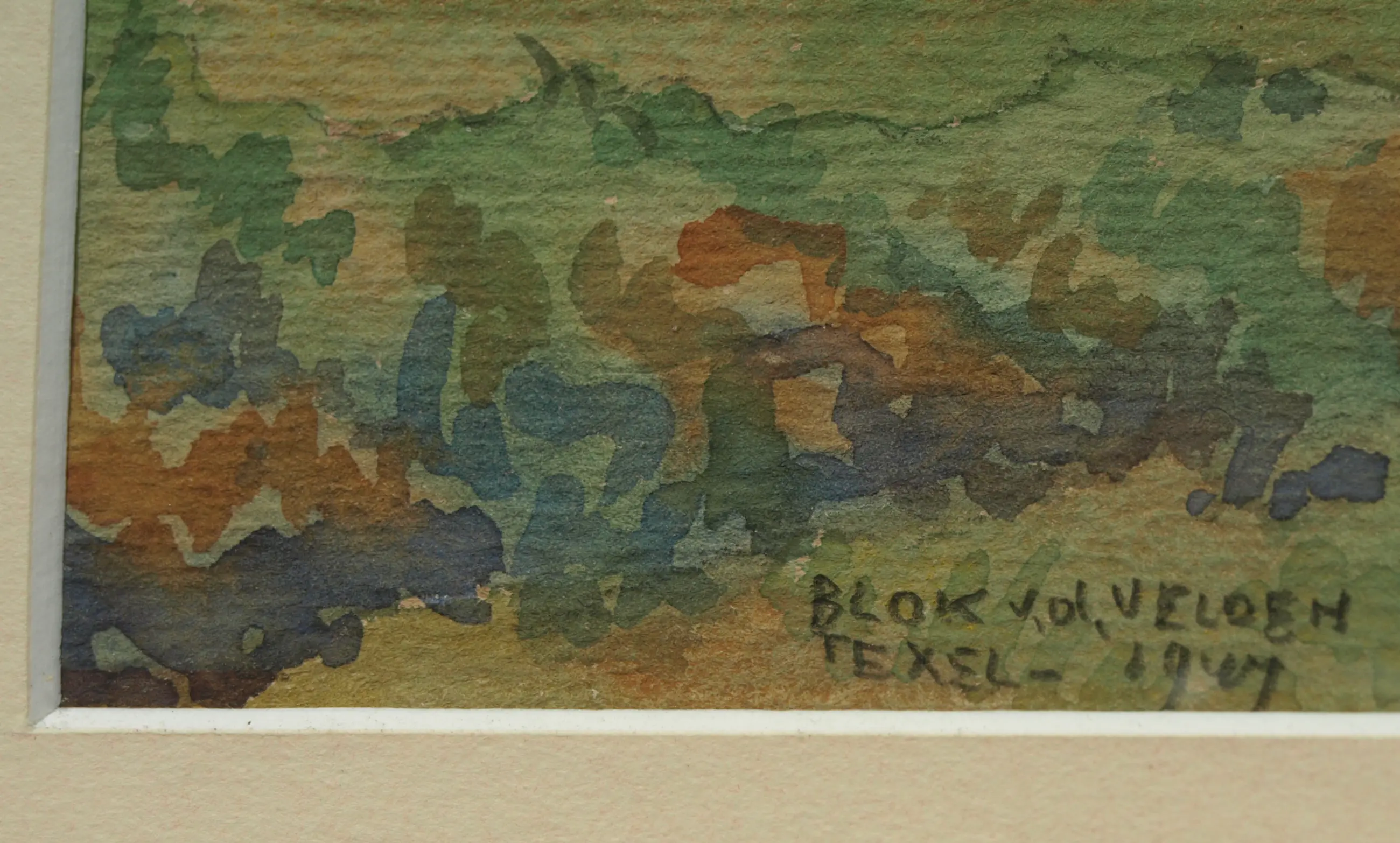 Informatie over de kunstenaar: Adrianus (‘Ad’) Dirk Blok van der Velden (Dordrecht, 12 april 1913 – Varese, Italië, 22 mei 1980), schilder, aquarellist, graficus en tekenaar. Hij is vooral bekend vanwege de tekeningen en schilderijen die hij op en van het eiland Texel maakte. -Opleiding: Academie voor Beeldende Kunsten Rotterdam. -Onderwerpen: (duin)landschappen, strandgezichten, figuurvoorstellingen. In 1934 kwam hij voor de eerste keer op Texel. Als natuurliefhebber voelde hij zich aangetrokken tot het eiland. Na een periode van twee jaar in de Franse stad Nice keerde hij terug naar Nederland en vestigde hij zich in augustus 1940 samen met zijn vrouw Ietje op het eiland. Hij voelde zich vooral aangetrokken tot het Texels landschap voordat er op grote schaal ruilverkaveling had plaatsgevonden. Als gevolg van die grootschalige ruilverkaveling voelde hij zich minder verwant met het eiland en week hij enkele zomers uit naar Terschelling. Vanaf 1971 verbleef hij ook vaker in Frankrijk en later Italië. In 1979 verliet hij Texel definitief en verhuisde hij naar Italië. Daar overleed hij een jaar later en werd hij aanvankelijk ook begraven. In 1995 vond er een herbegrafenis plaats en kwam hij naast zijn tweede vrouw Hanneke Breur te liggen op de Algemene Begraafplaats in Den Burg. Literatuur: De Wolf 2005, Eb en vloed : schilderijen en [...], passim. Scheen 1969-1970, Lexicon Nederlandse beeldende [...], p. 480. Jacobs 1993, Beeldend Nederland : [...], vol. 1, p. 117. Jacobs 2000, Beeldend Benelux : biografisch [...], vol. 1, p. 335. (Bron: RKD, Wikipedia)