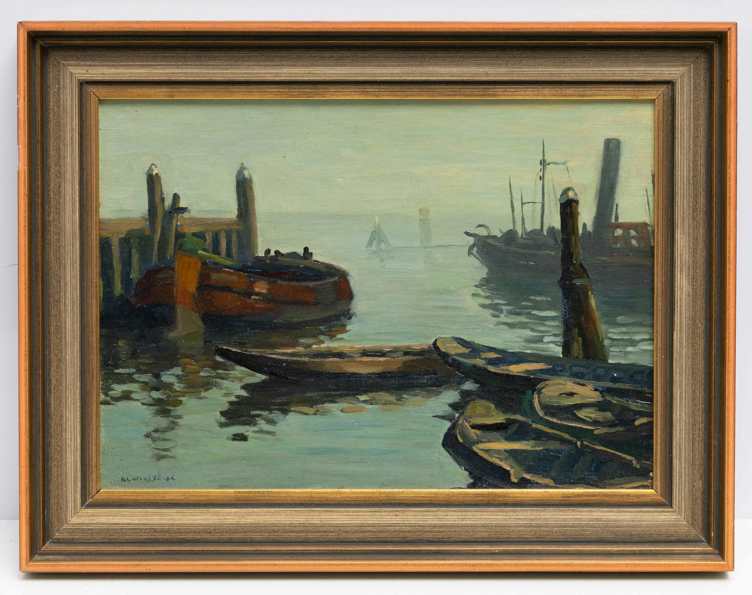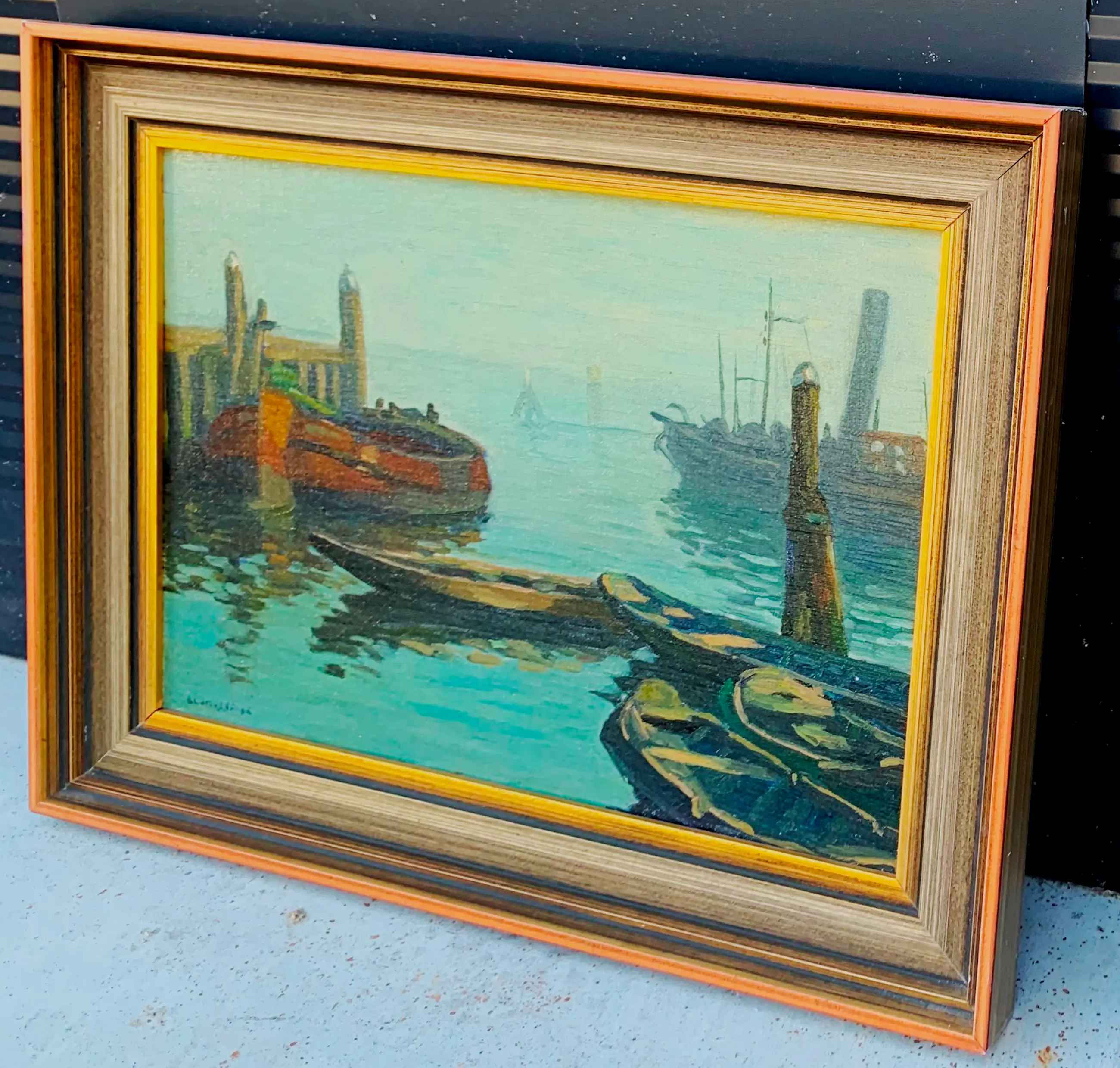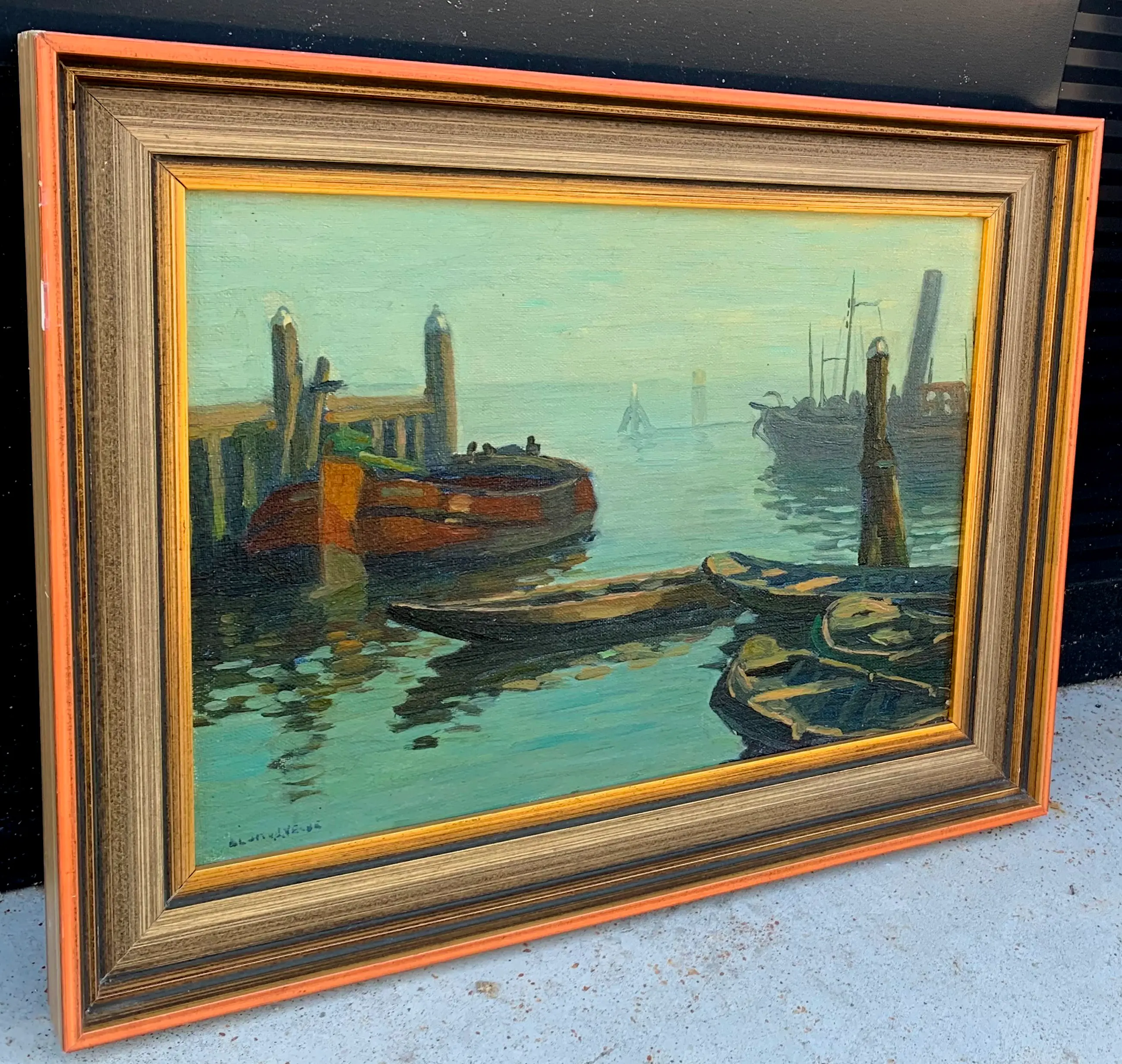 Ingelijste olieverf van Ad Blok van der Velden. Titel: Texels havengezicht. Afmetingen incl lijst: H32 x b42cm. Afmetingen voorstelling: H25 x b35cm. Het werk is links onderaan, gesigneerd('Blok v.d Velde) en gedateerd door de kunstenaar. De authenticiteit van het aangeboden werk wordt volledig gegarandeerd. Een certificaat van echtheid kan, op aanvraag, worden gemaild.