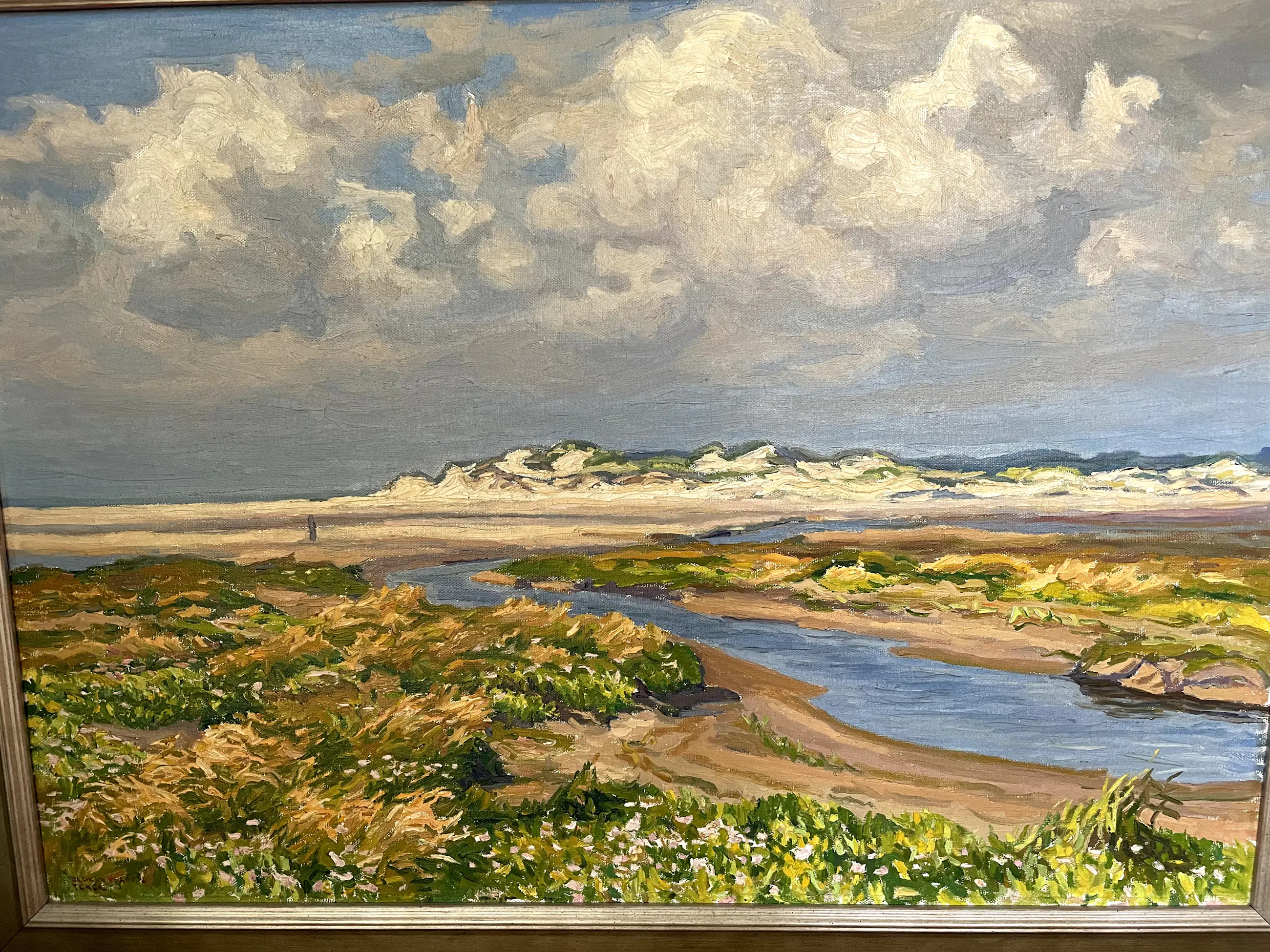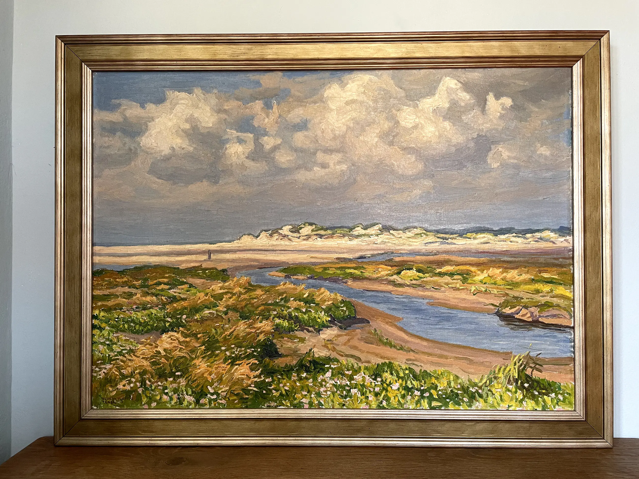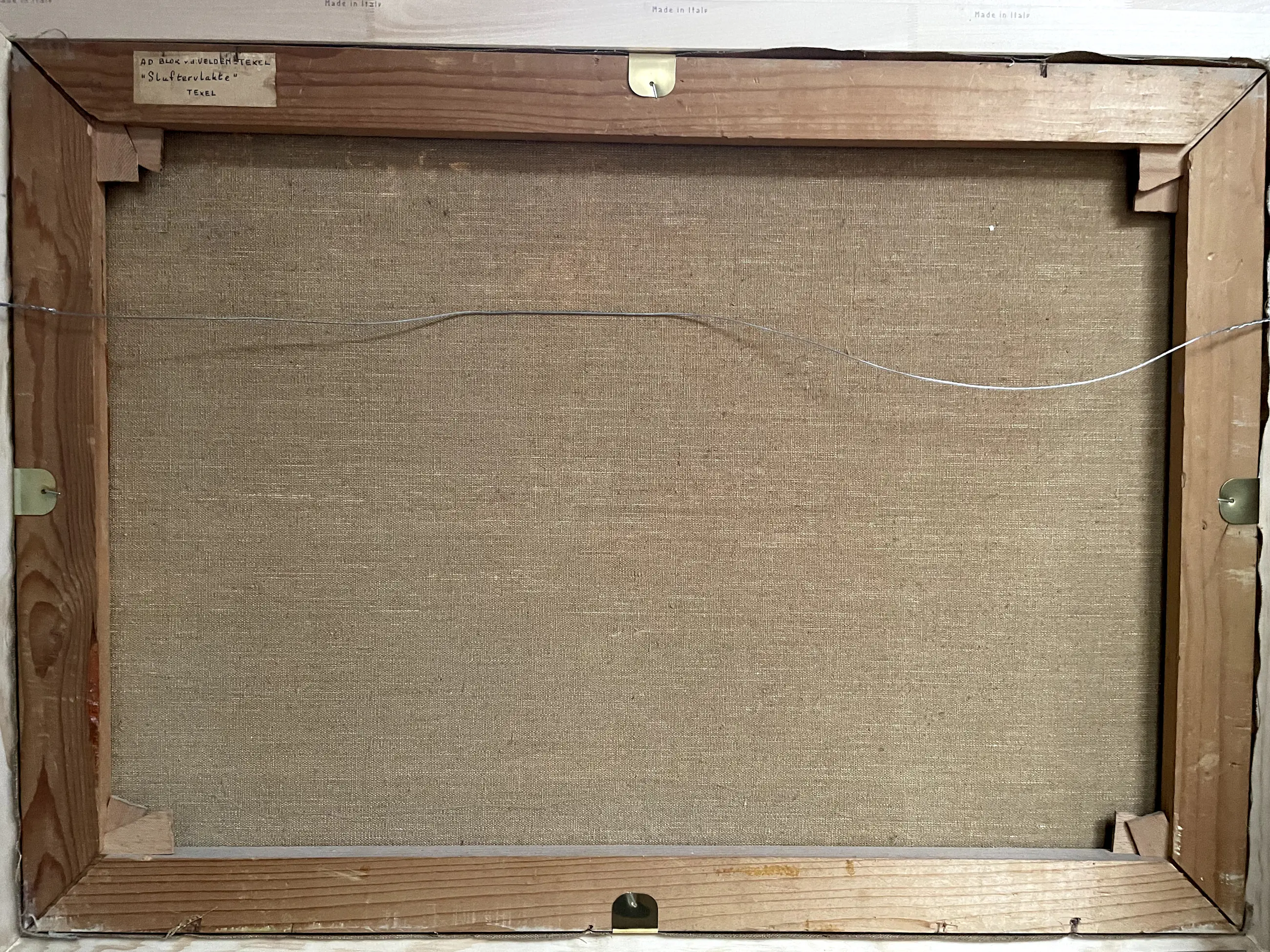 Een ingelijst schilderij van Ad Blok van der Velden (1913 - 1980) Nederlands kunstenaar, bekend van zijn schilderijen, tekeningen en aquarellen van Texel.