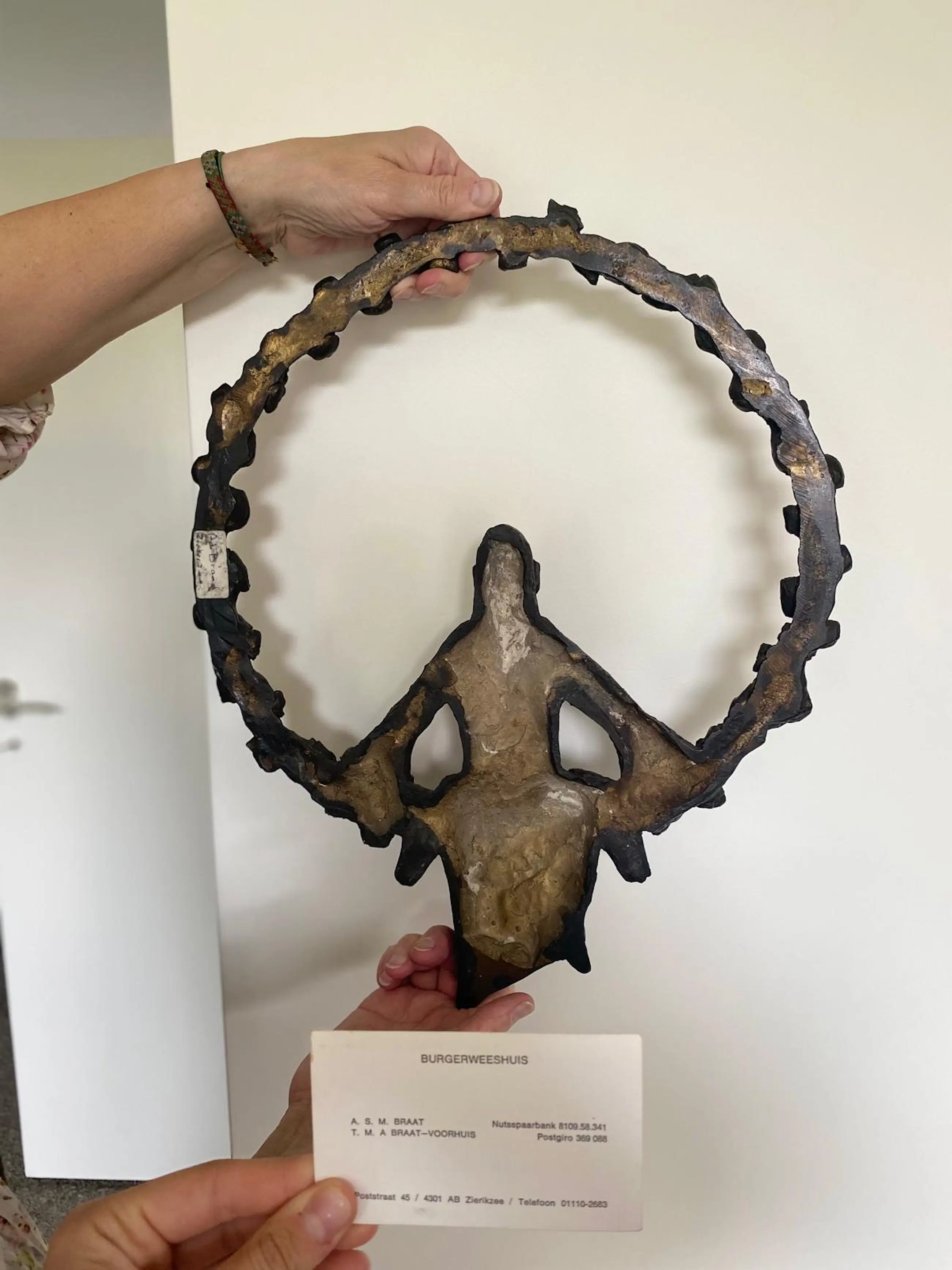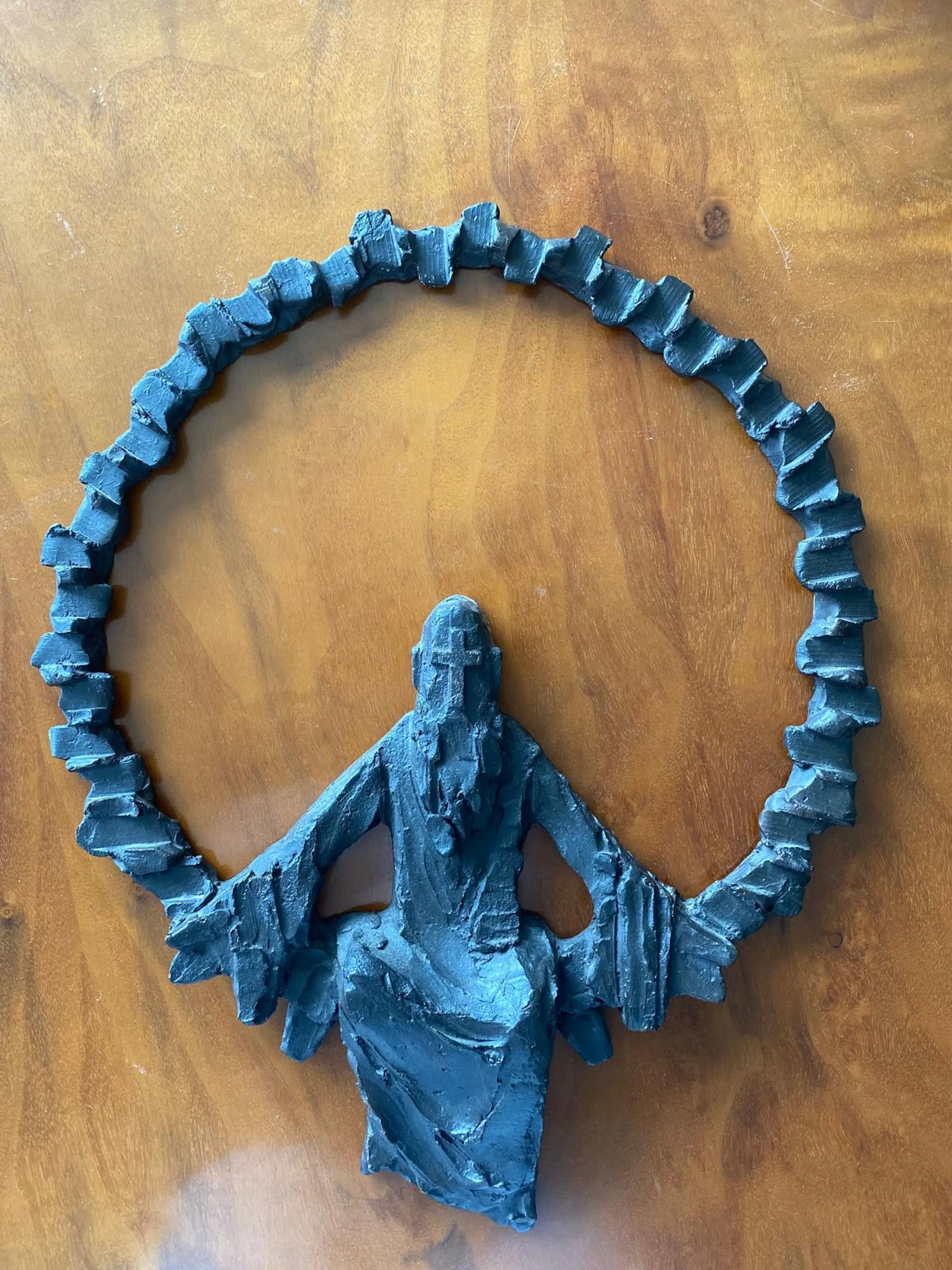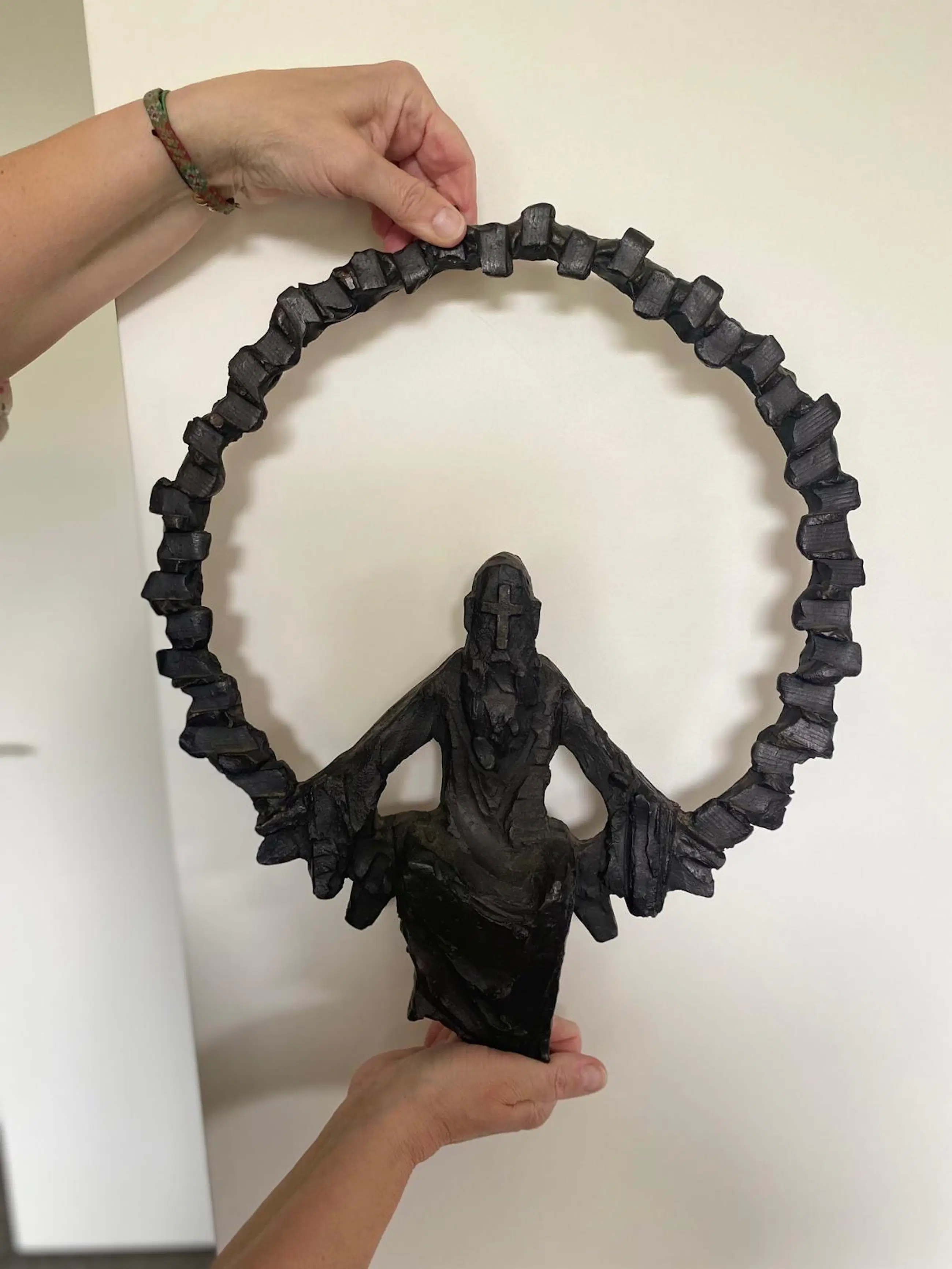 Dit is een bijzonder object voor liefhebbers van religieus geïnspireerde kunst, symboliek of expressieve beeldhouwkunst. Het beeld kan zowel aan de muur worden gehangen als staand worden gepresenteerd.