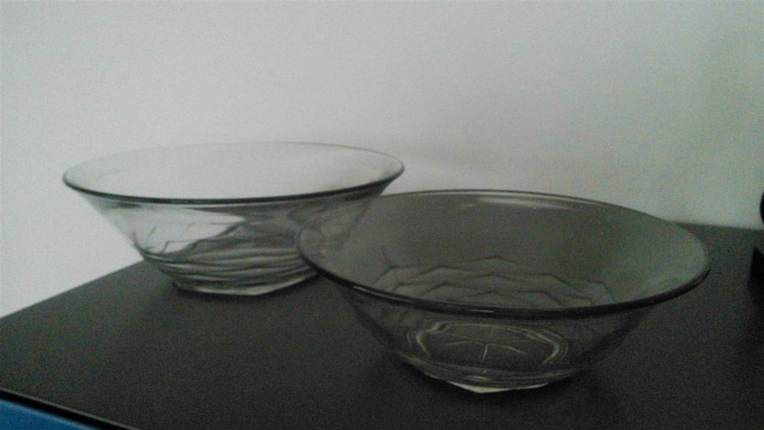 Afmetingen: fruitschaal doorsnede 30,5 cm, hoogte 4 cm.23,5 x 8 cm en 20 x 7 cm