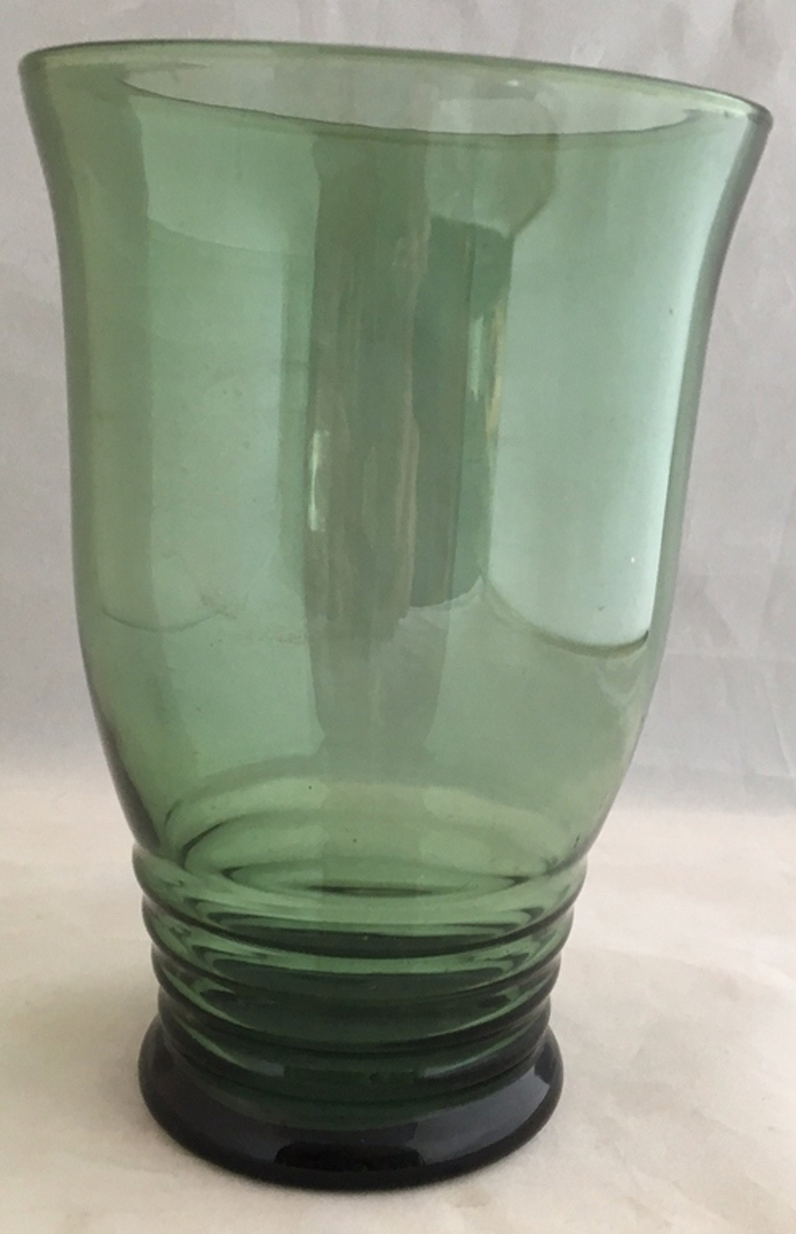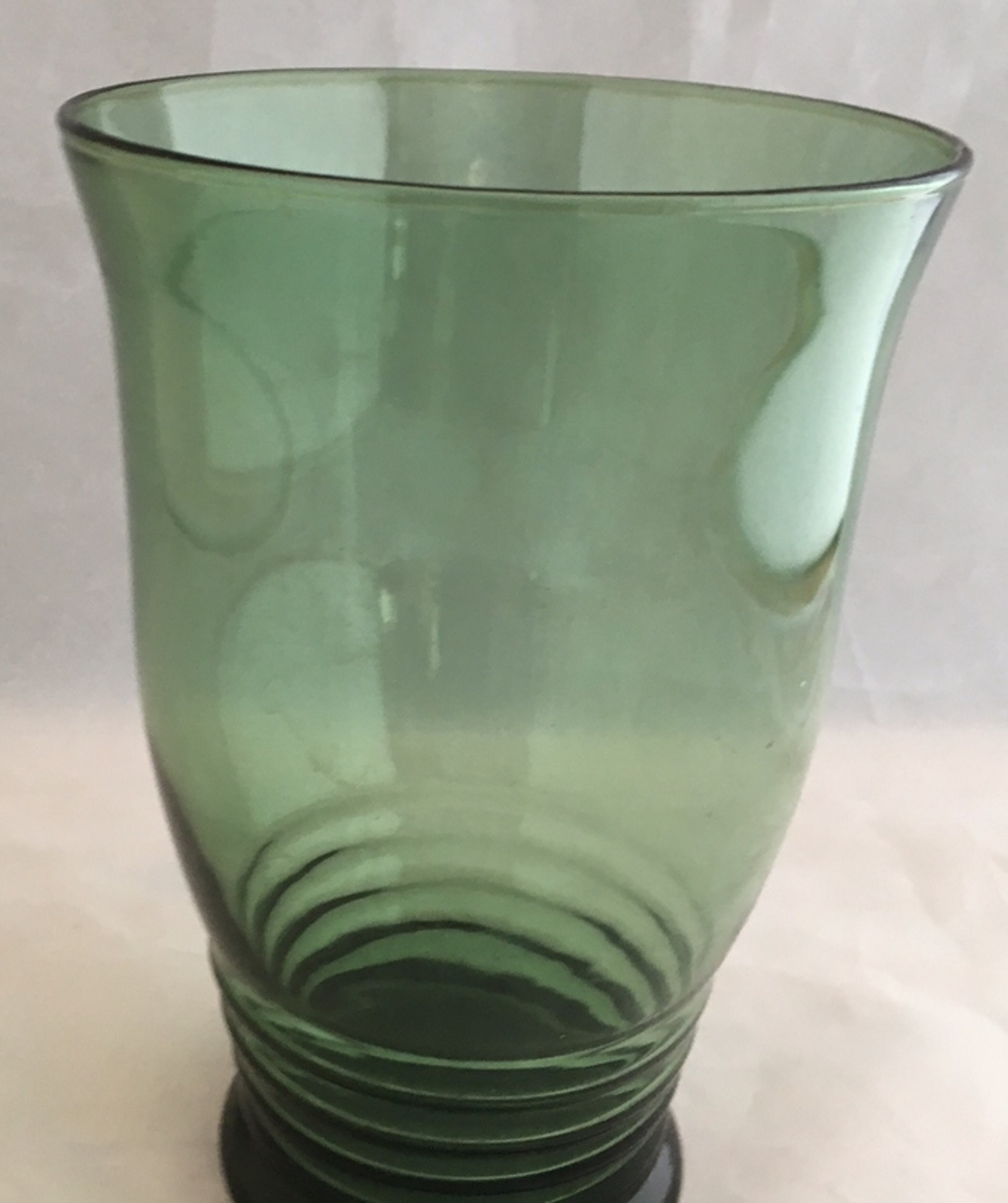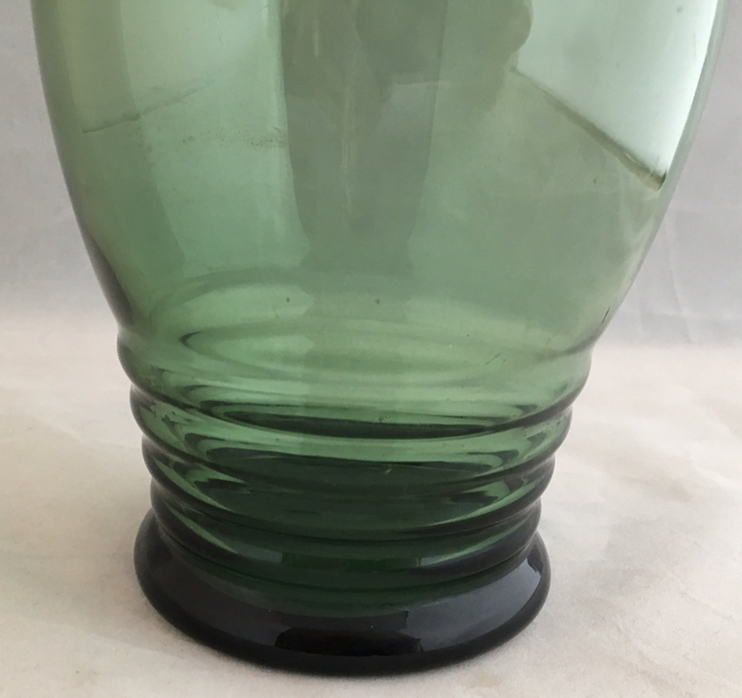 Mooie flesgroene vaas met geribde voet van Leerdam uit 1923, ontwerp A.D. Copier. In prima onbeschadigde conditie, heeft zeer licht aanslag aan de bovenrand. Niet gemerkt.