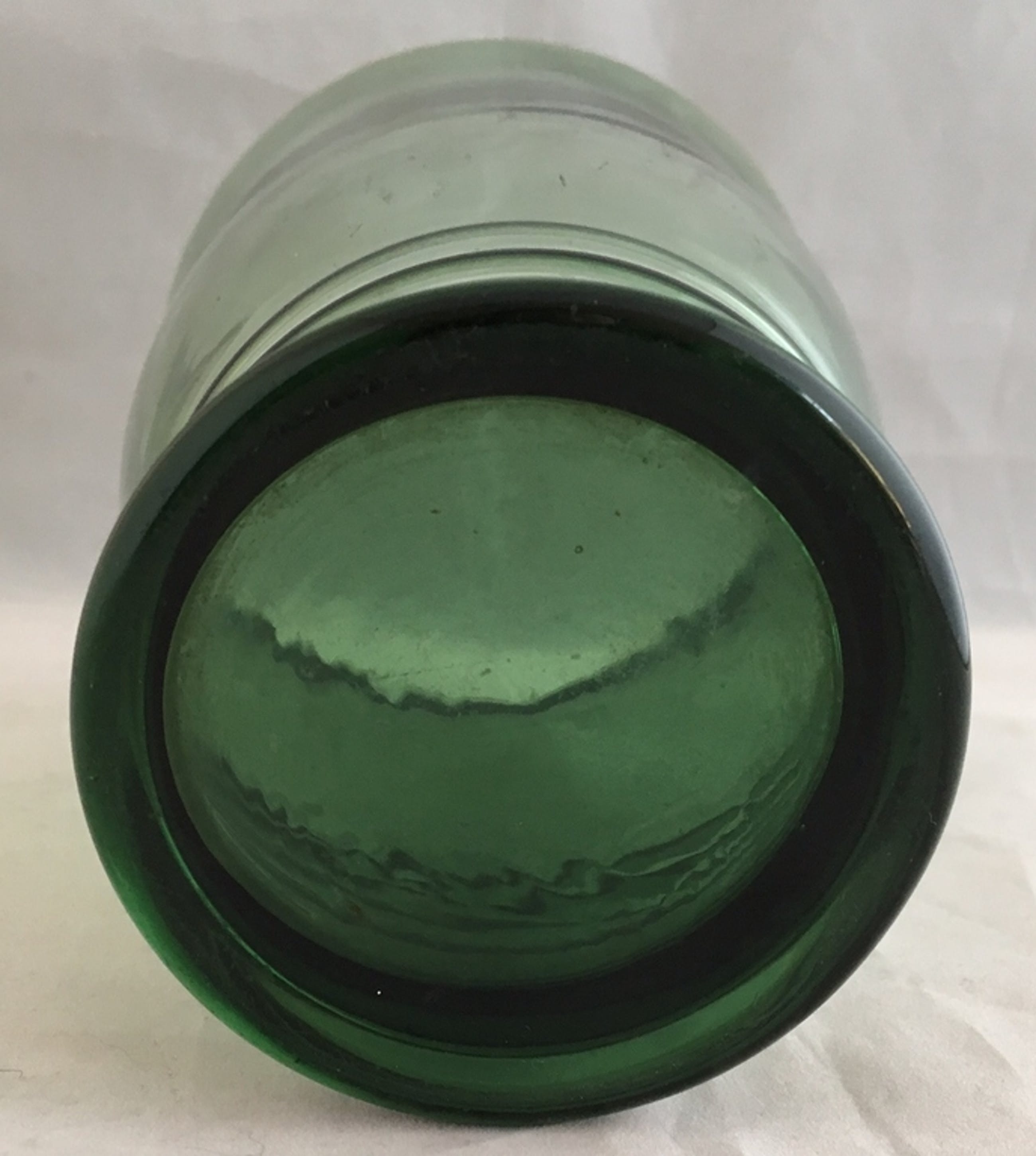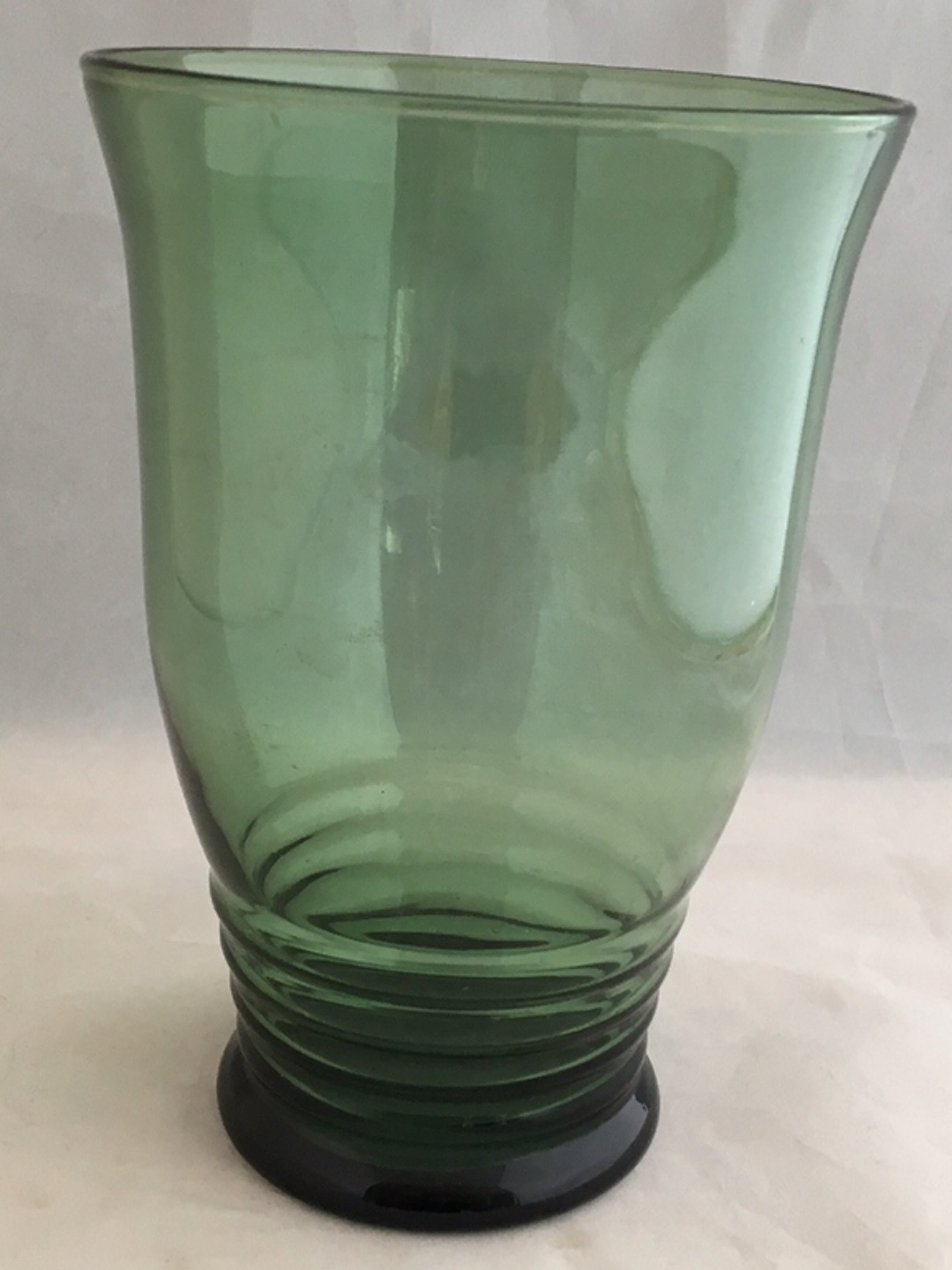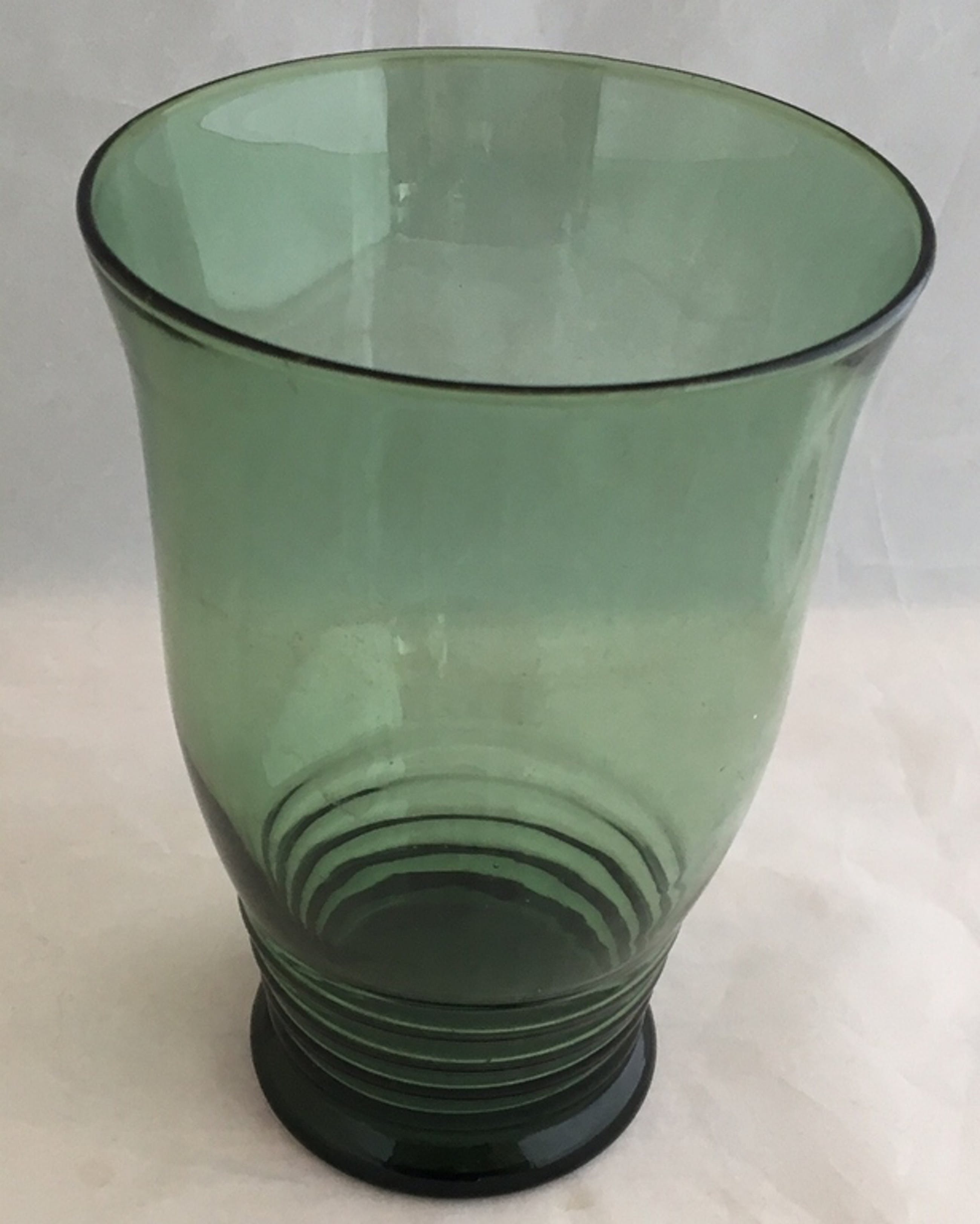 Mooie flesgroene vaas met geribde voet van Leerdam uit 1923, ontwerp A.D. Copier. In prima onbeschadigde conditie, heeft zeer licht aanslag aan de bovenrand. Niet gemerkt.