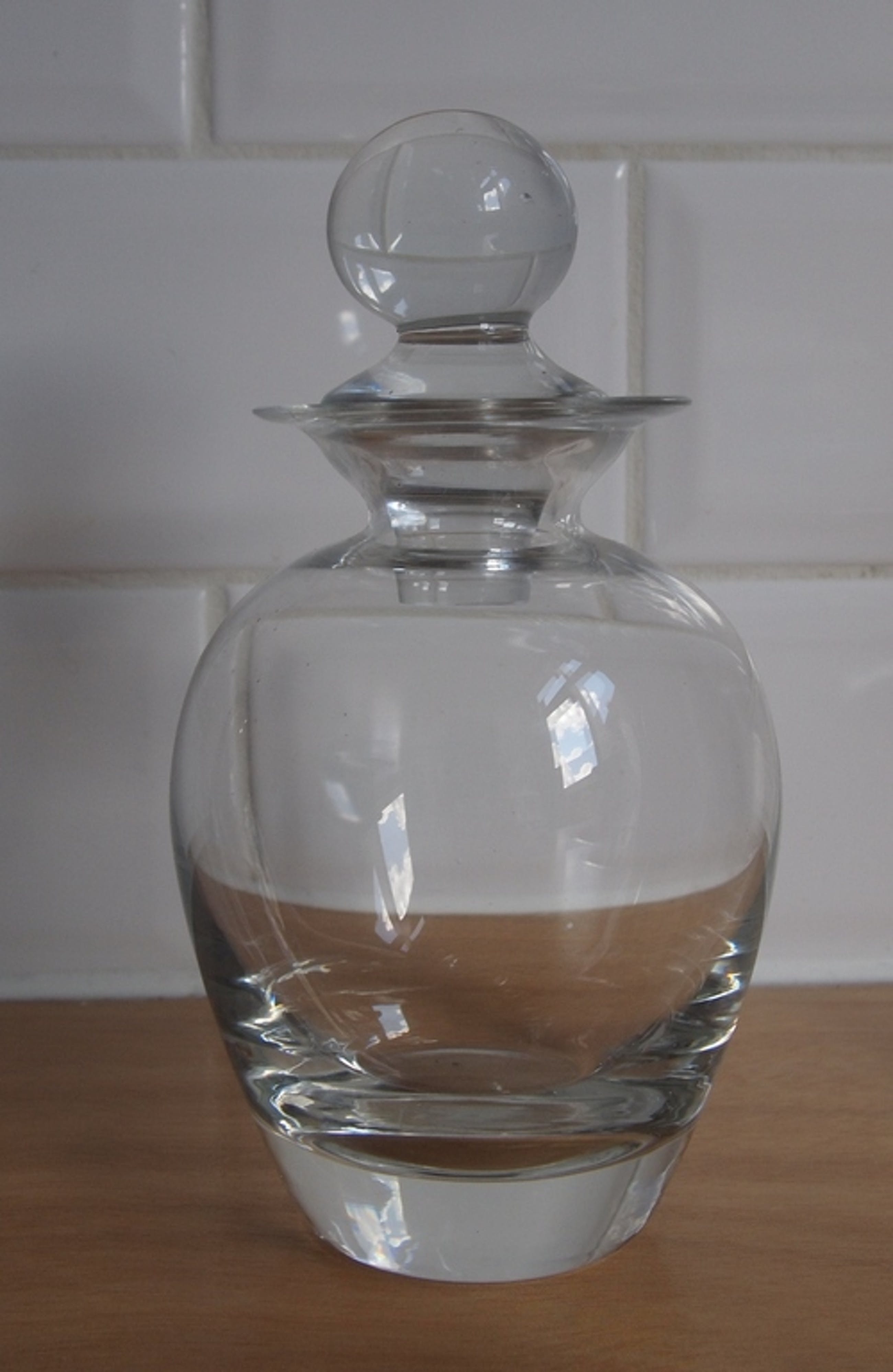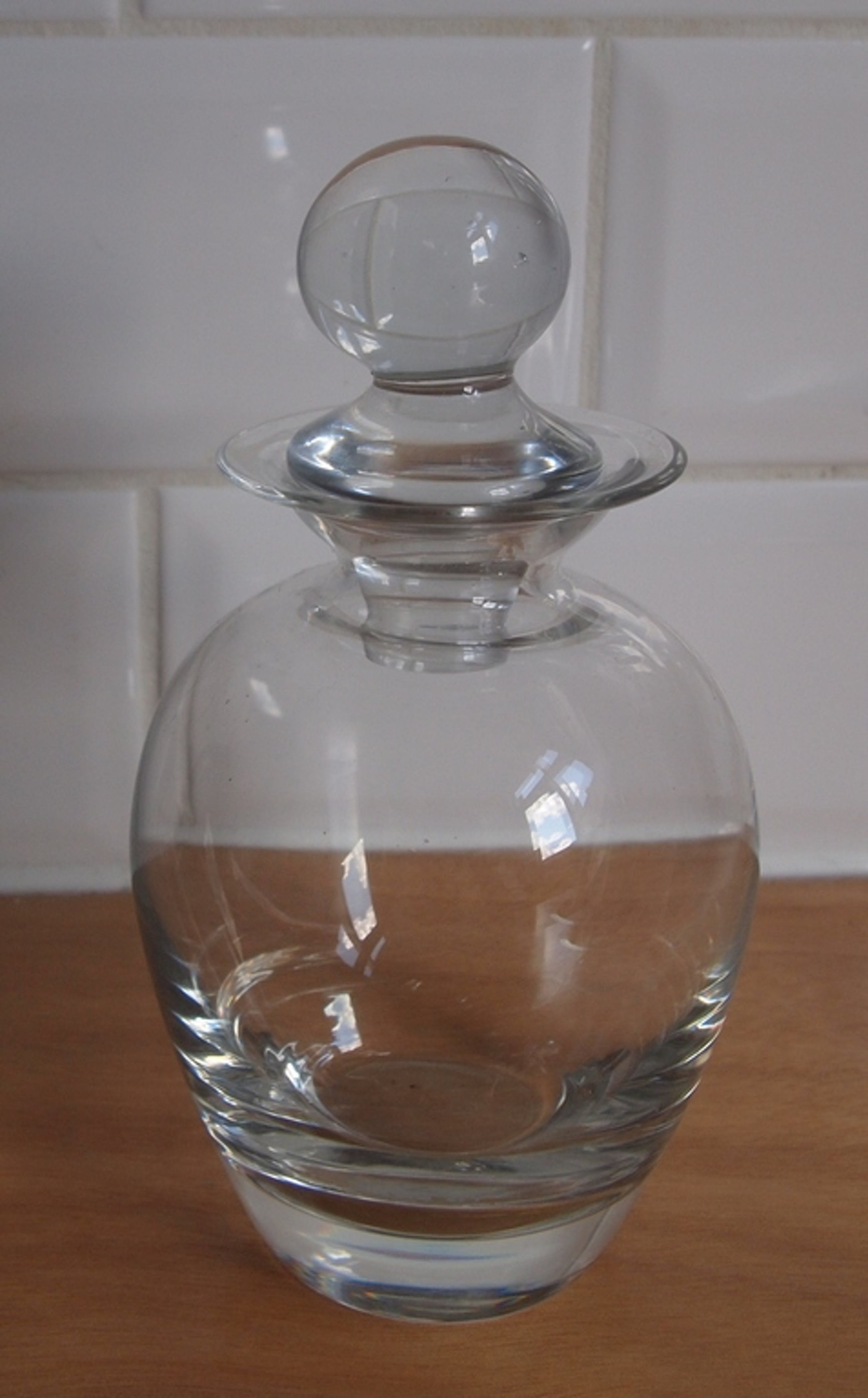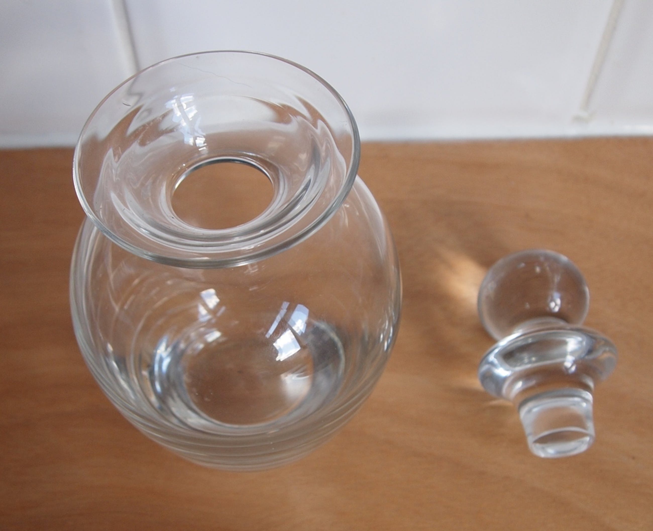 Mooie blankglazen karaf Rondo, ontwerp A.D. Copier in 1935 voor Leerdam. In prima onbeschadigde conditie, geen aanslag. Helaas is de stopper niet origineel. Aan de onderzijde voorzien van het etsmerk CL.