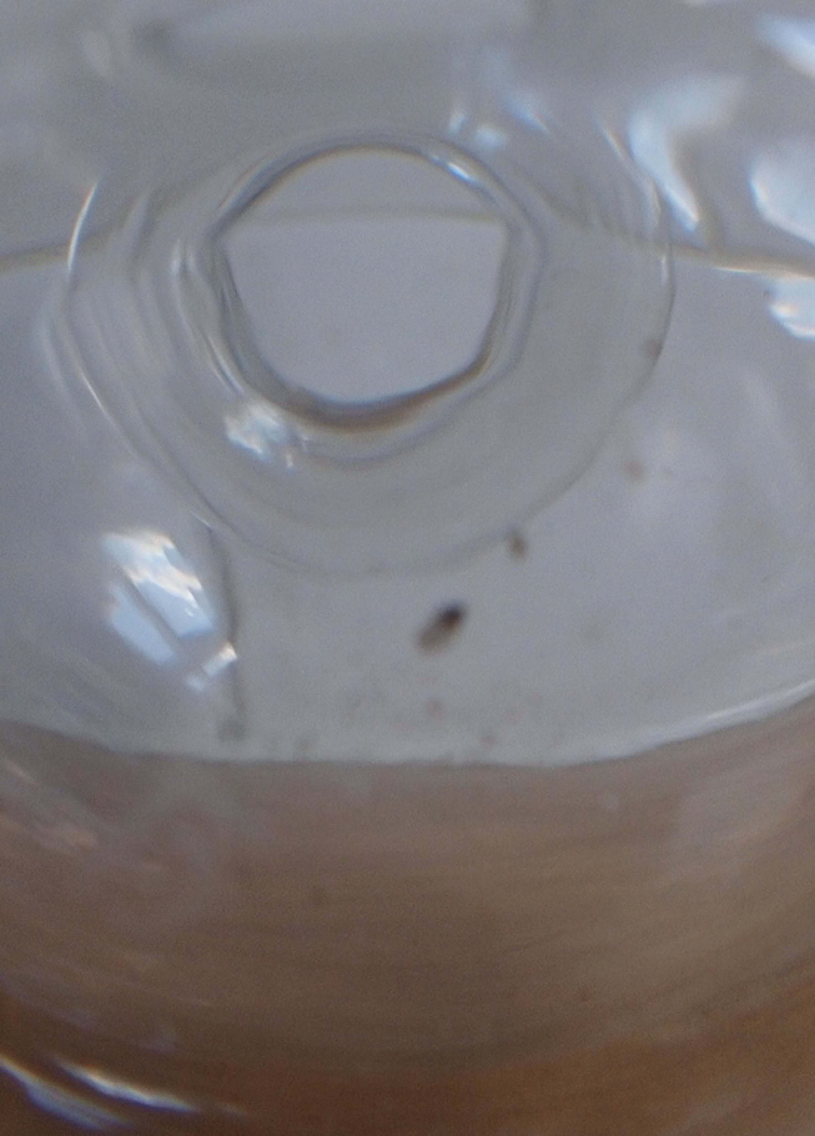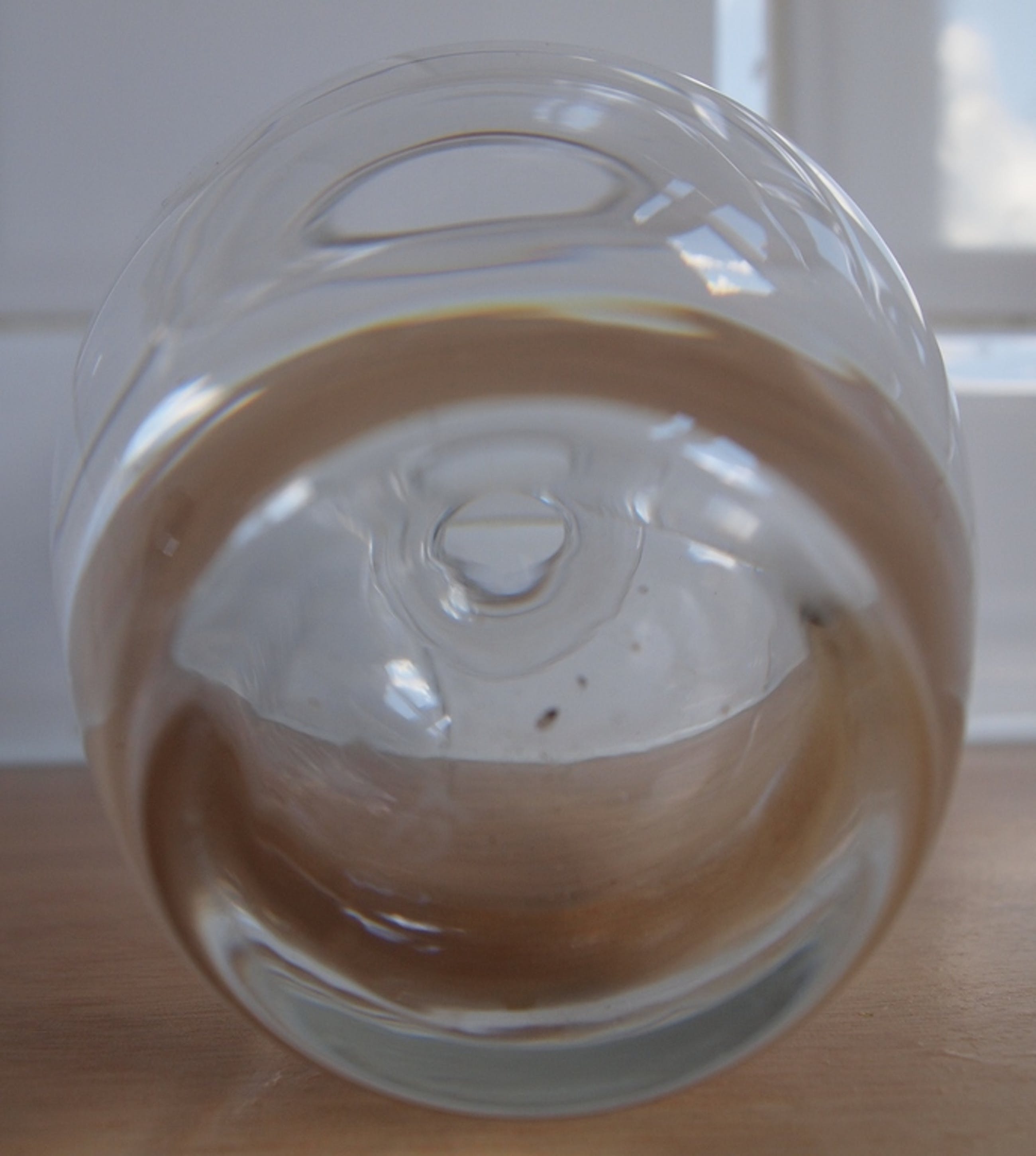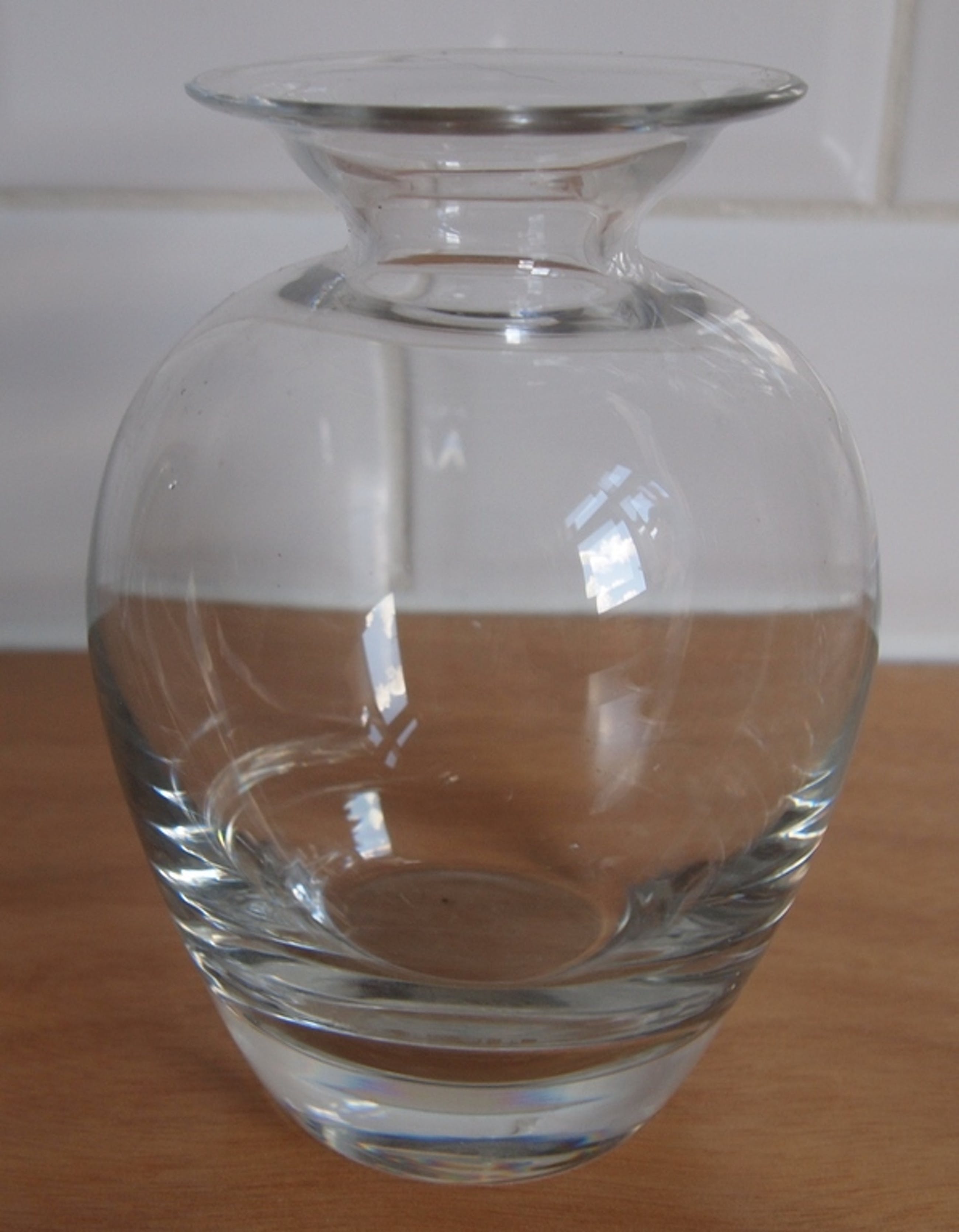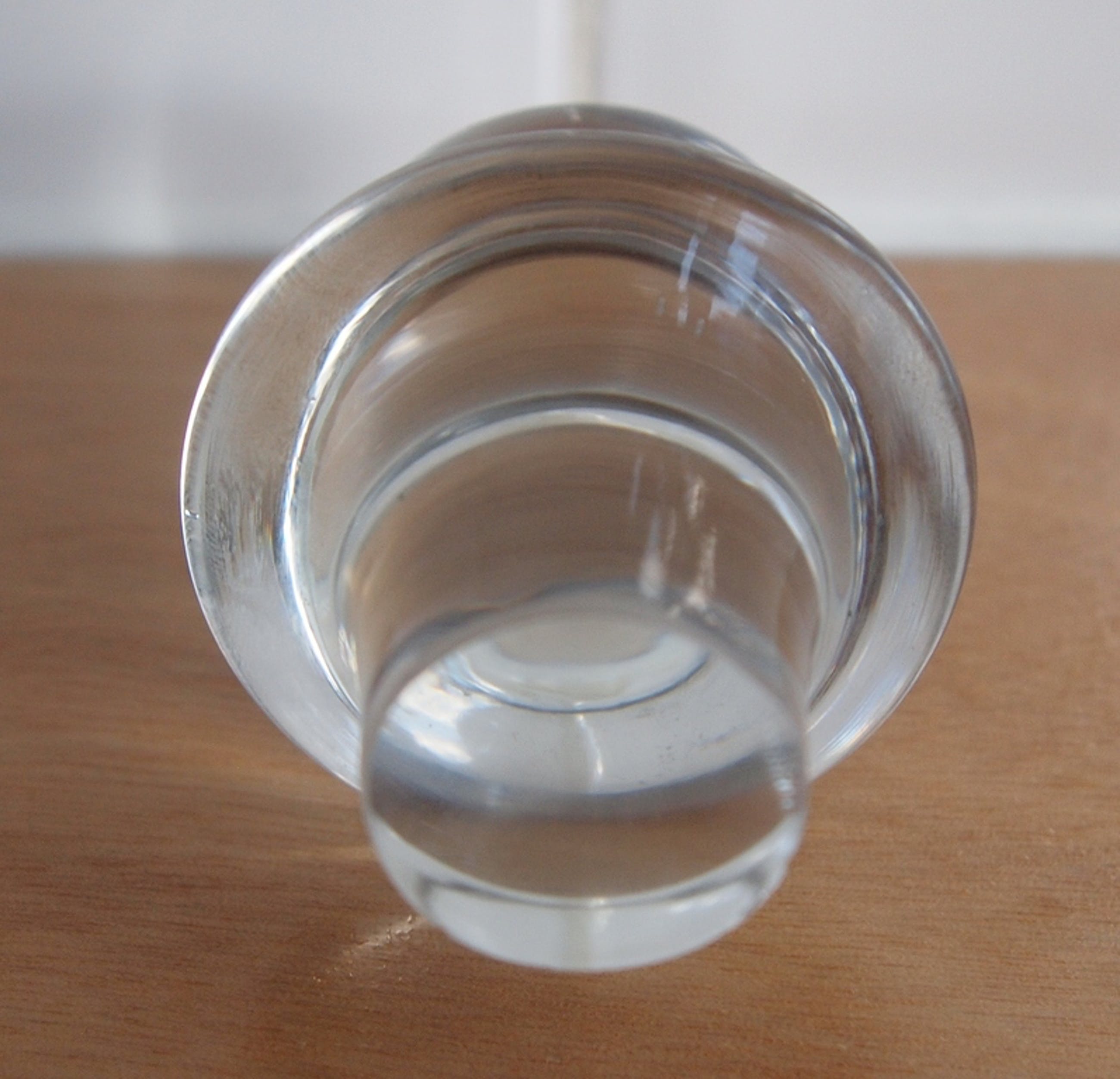 Mooie blankglazen karaf Rondo, ontwerp A.D. Copier in 1935 voor Leerdam. In prima onbeschadigde conditie, geen aanslag. Helaas is de stopper niet origineel. Aan de onderzijde voorzien van het etsmerk CL.