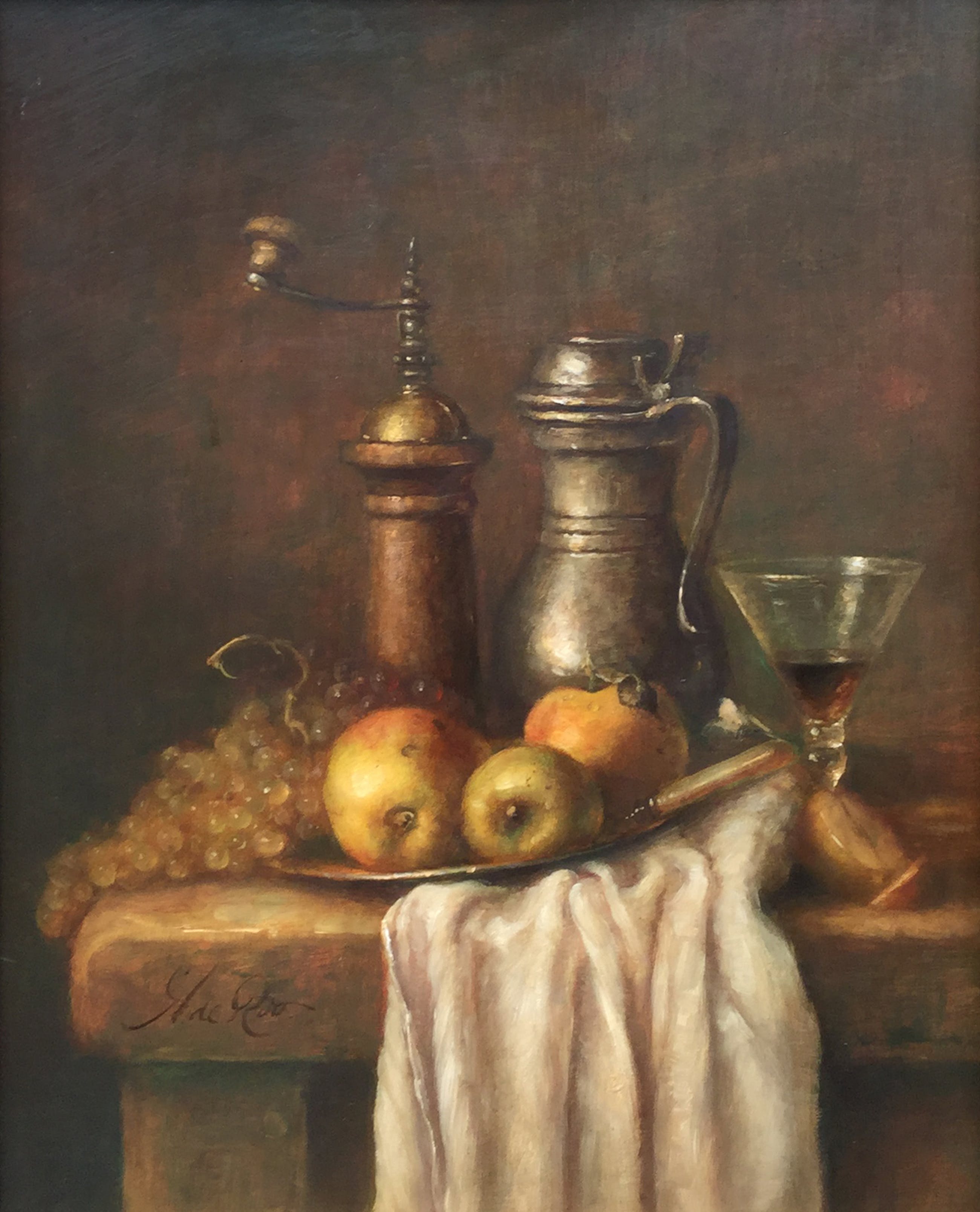 Ad de Roo, olie op paneel, l.o. gesigneerd, stilleven met tinnen kan, doekmaat 50.5 x 40.5, lijstmaat 72.5 x 62.5.