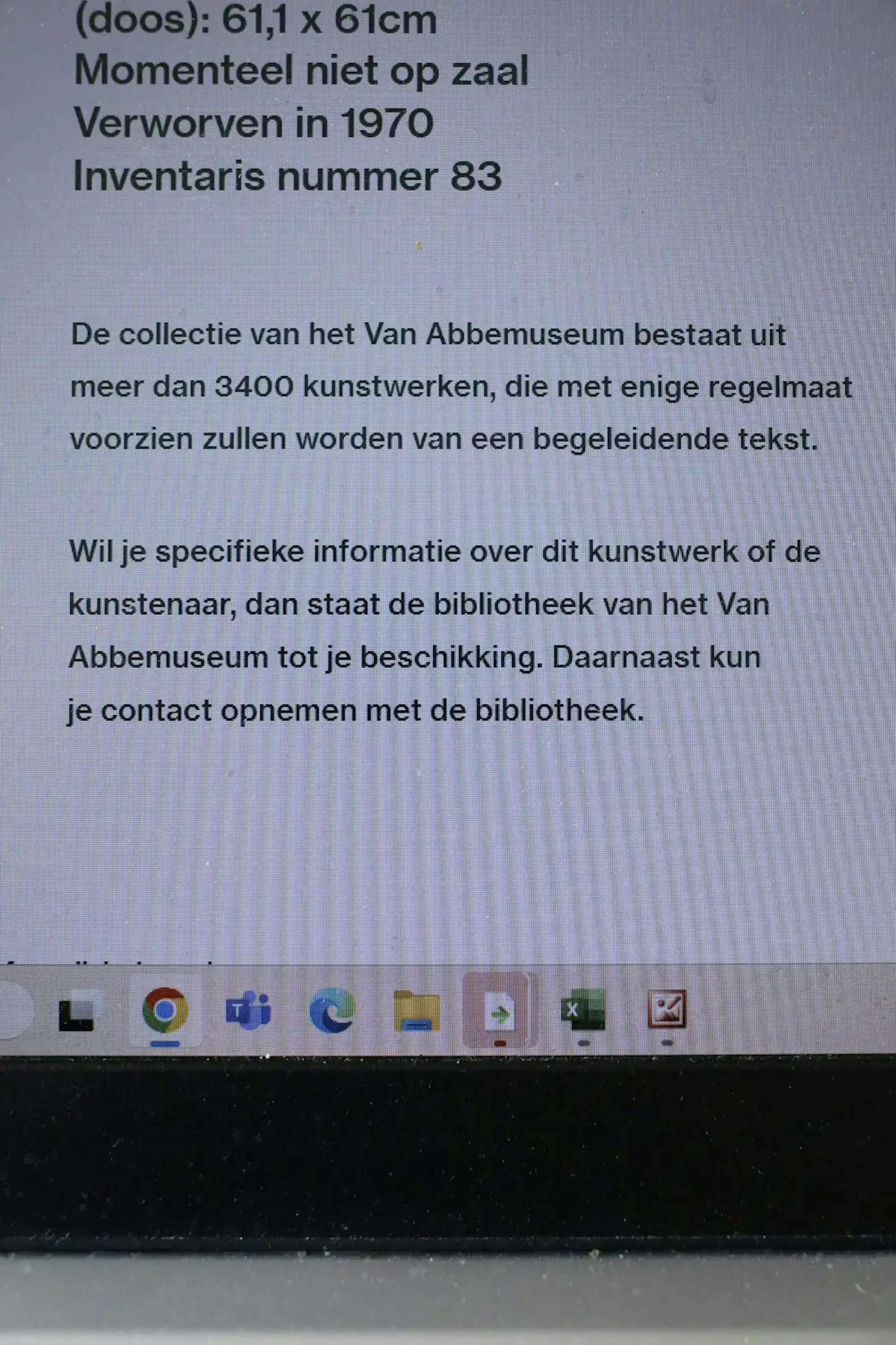 Het werk komt ook voor in de collectie van het van Abbemuseum. Zie de foto's. Ook is het werk te vinden in het Kunstmuseum Den Haag, Stedelijk Museum, Amsterdam.