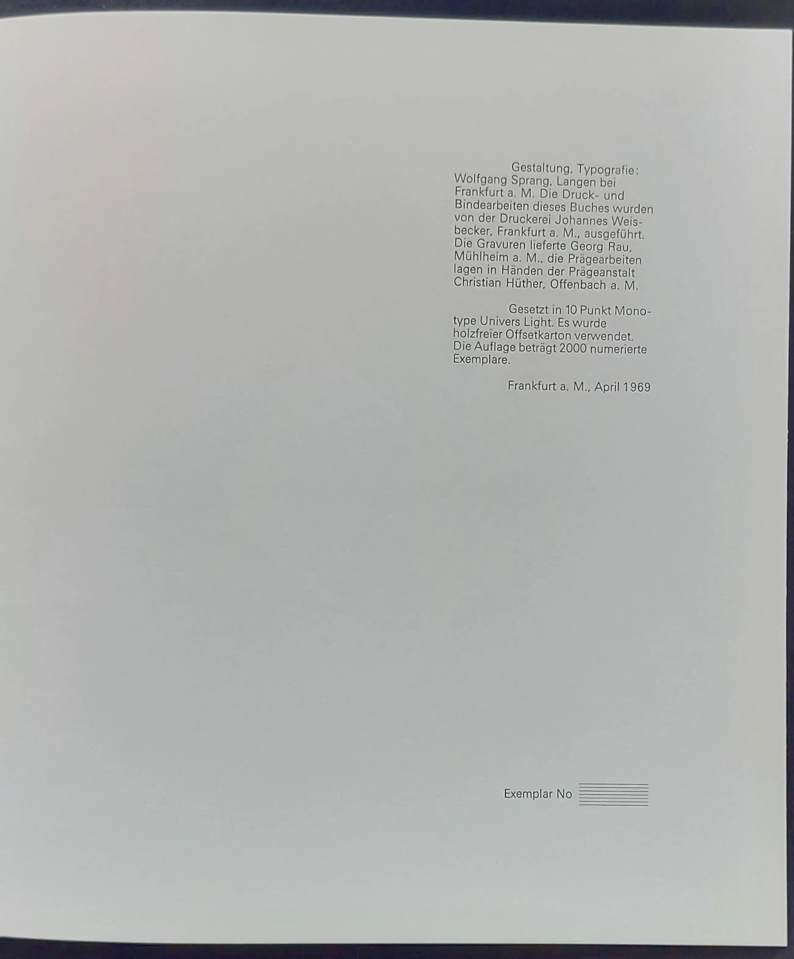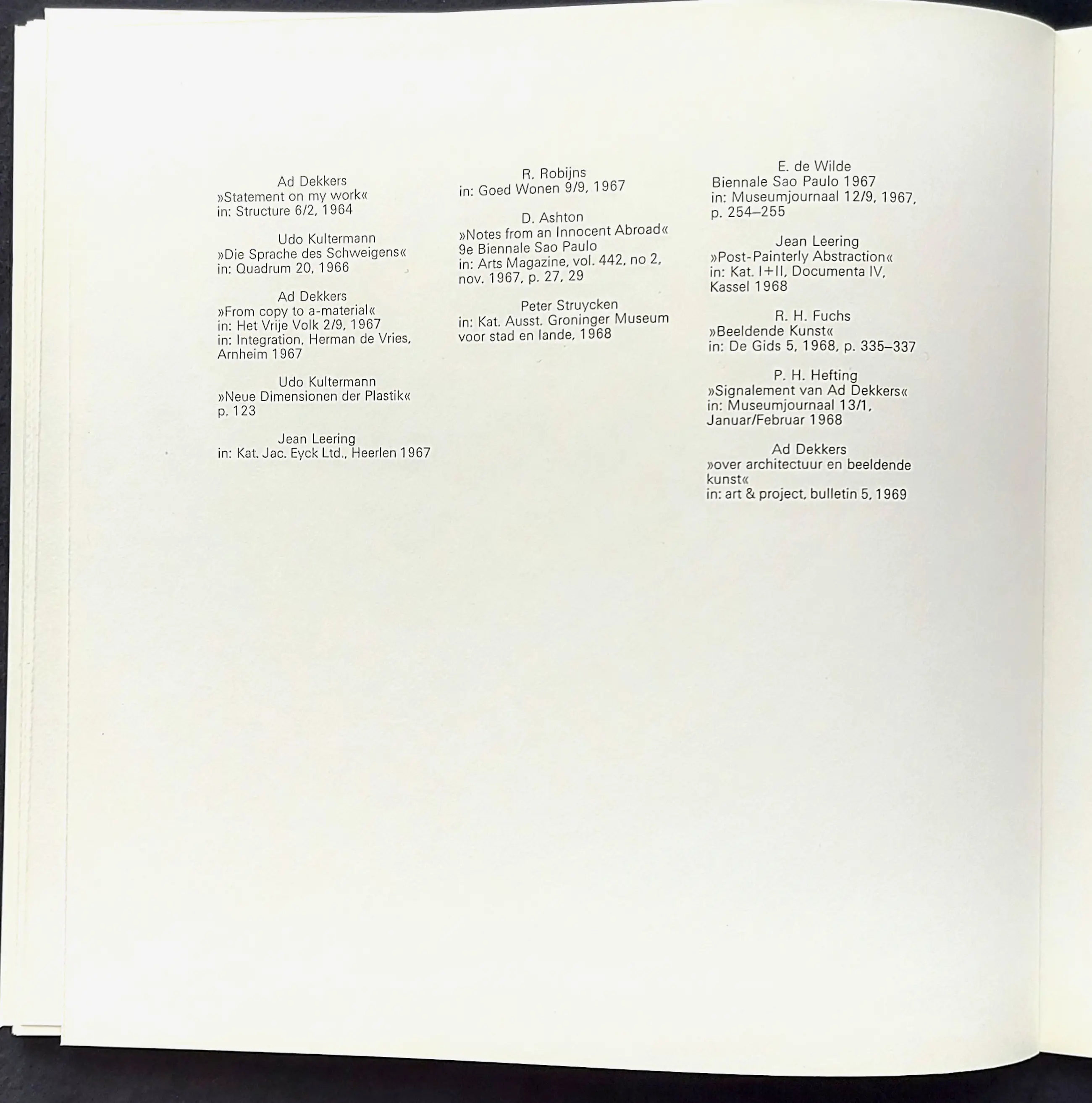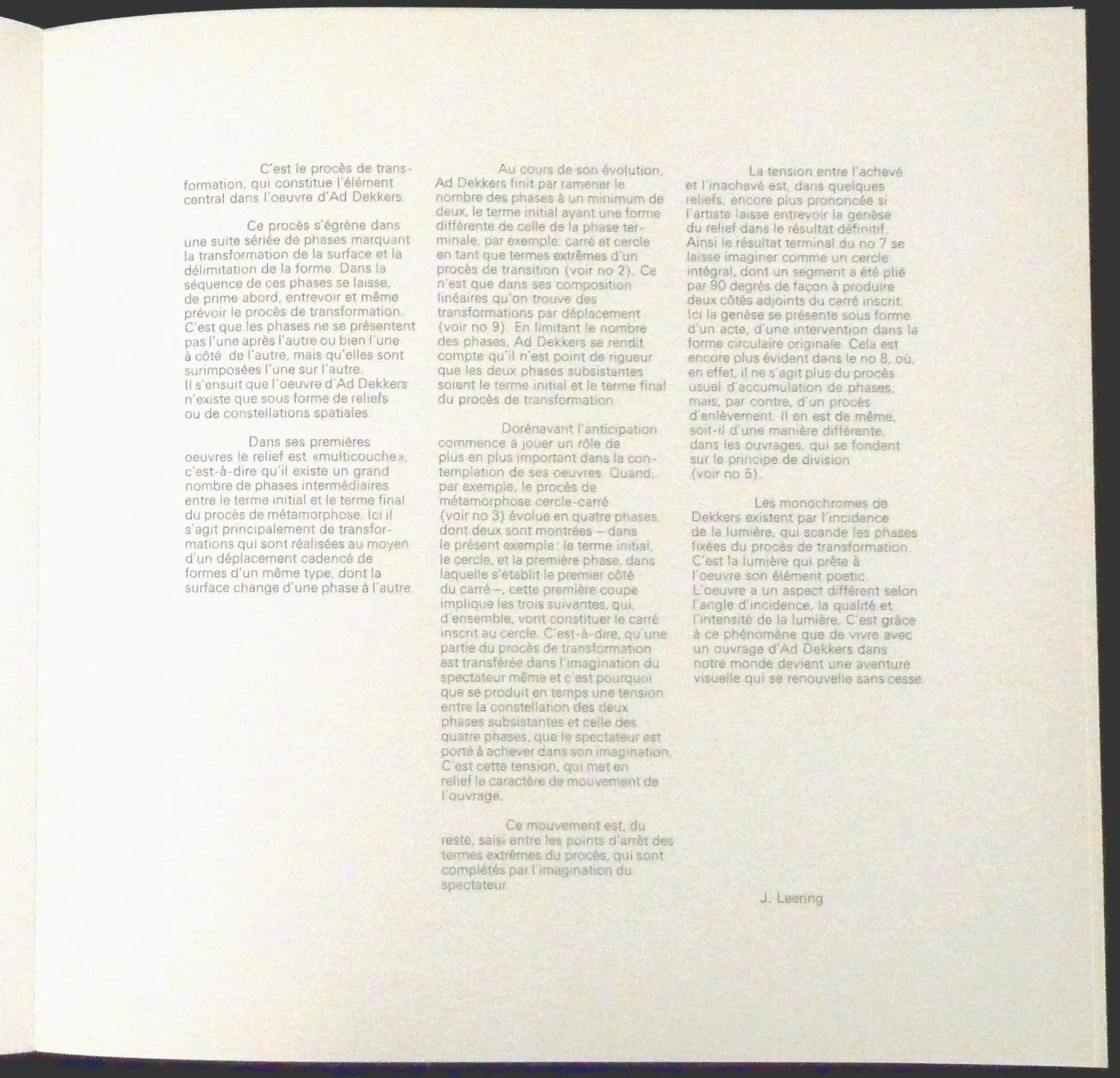 Kunstenaarsboek van Ad Dekkers met 9 reliëfprints. Tekst in 4 talen, waaronder Nederlands met 9 reliëfdrukken op karton. Gebonden als een blokboek. Plaats: Frankfurt am Main Uitgever: Gallerie Loehr Jaar: 1969 Conditie: Uitstekend