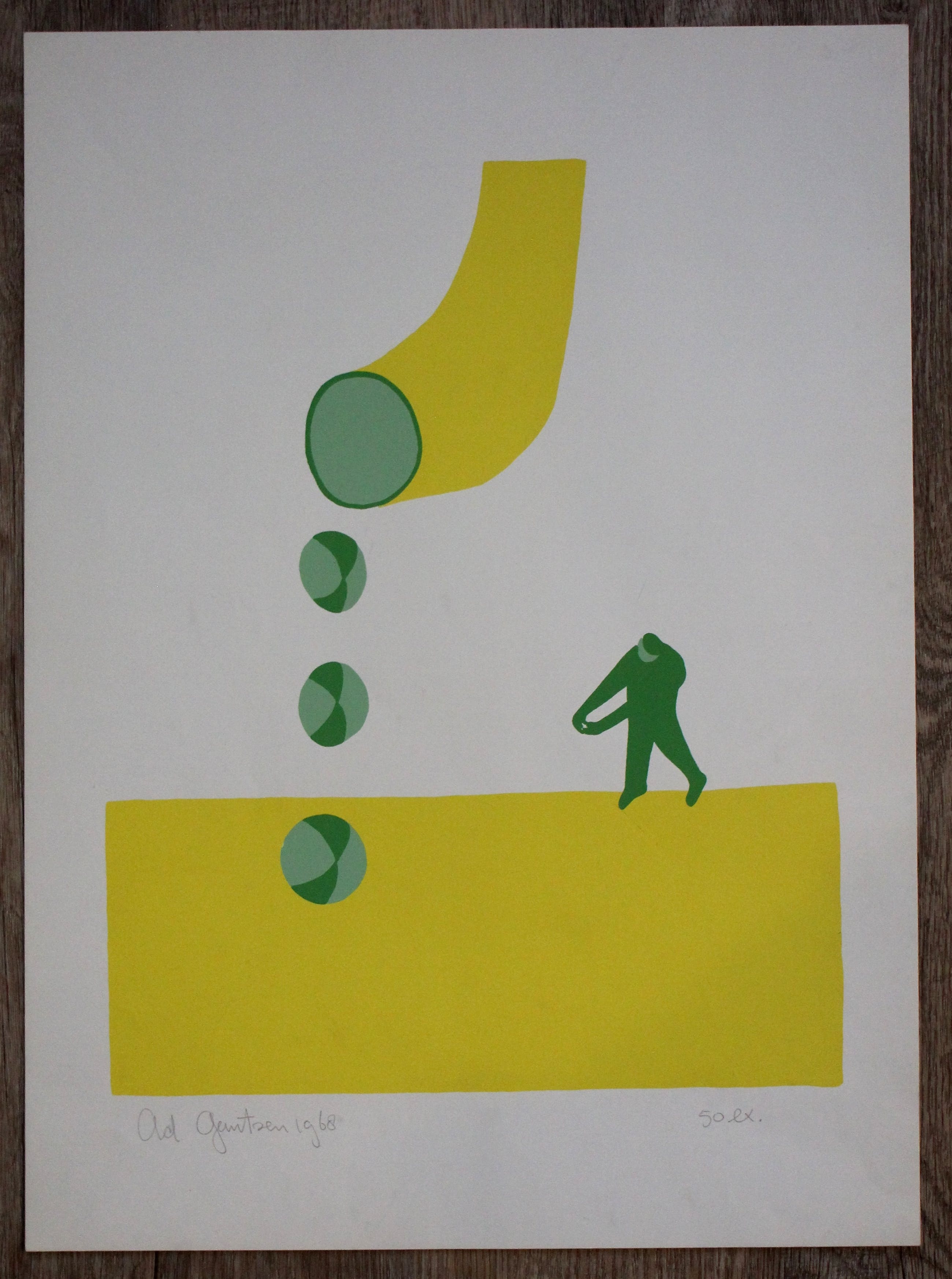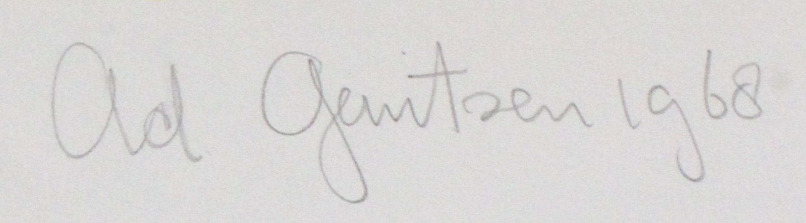 Litho van Ad Gerritsen. Jaar: 1968. Nummer: 50 ex. Afmetingen blad: H55 x b40cm. Afmetingen voorstelling: H34 x b33cm. Het werk is links onder gesigneerd door de kunstenaar. De authenticiteit van het aangeboden werk wordt volledig gegarandeerd. Een certificaat van echtheid kan, op aanvraag, worden gemaild.