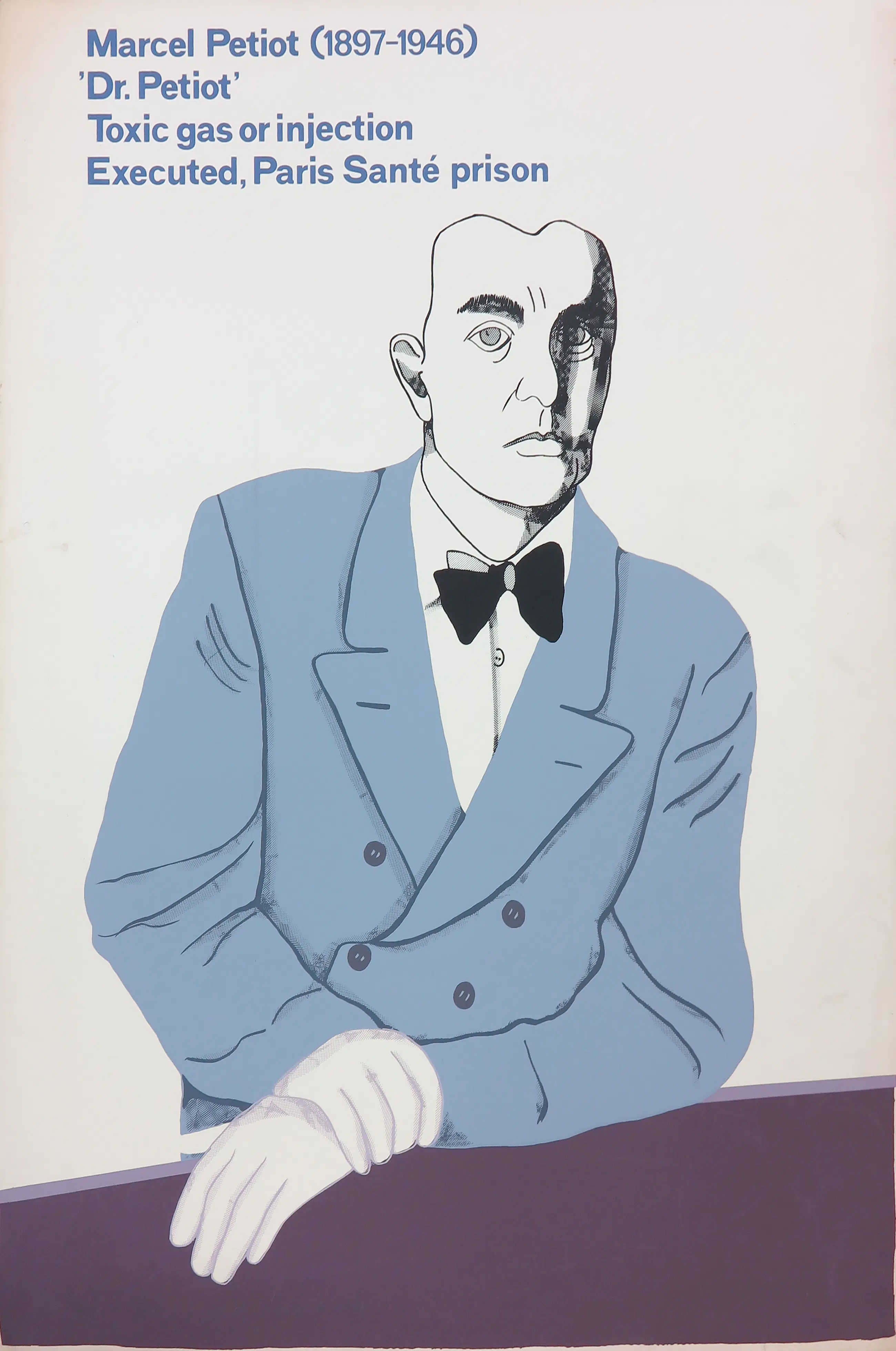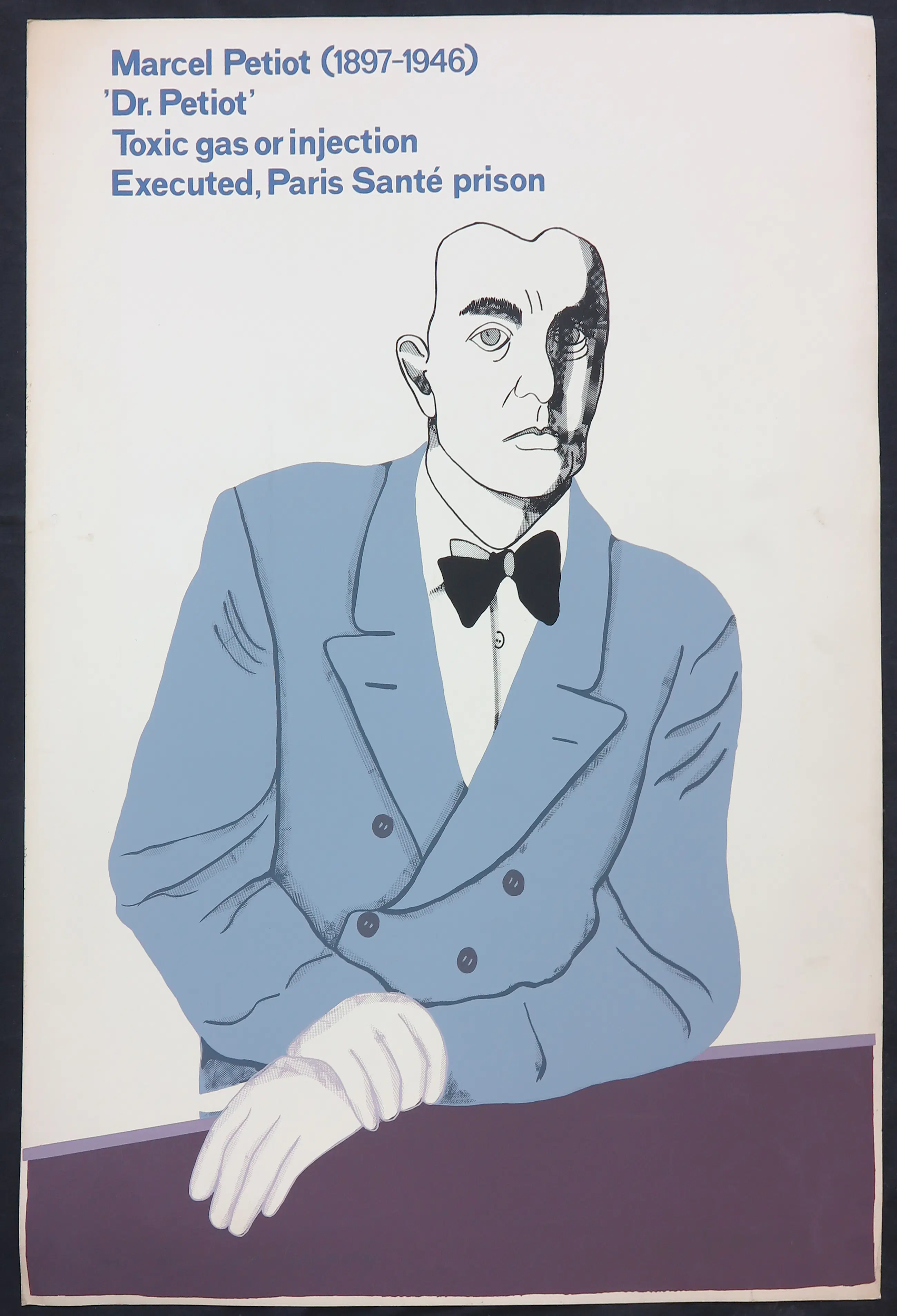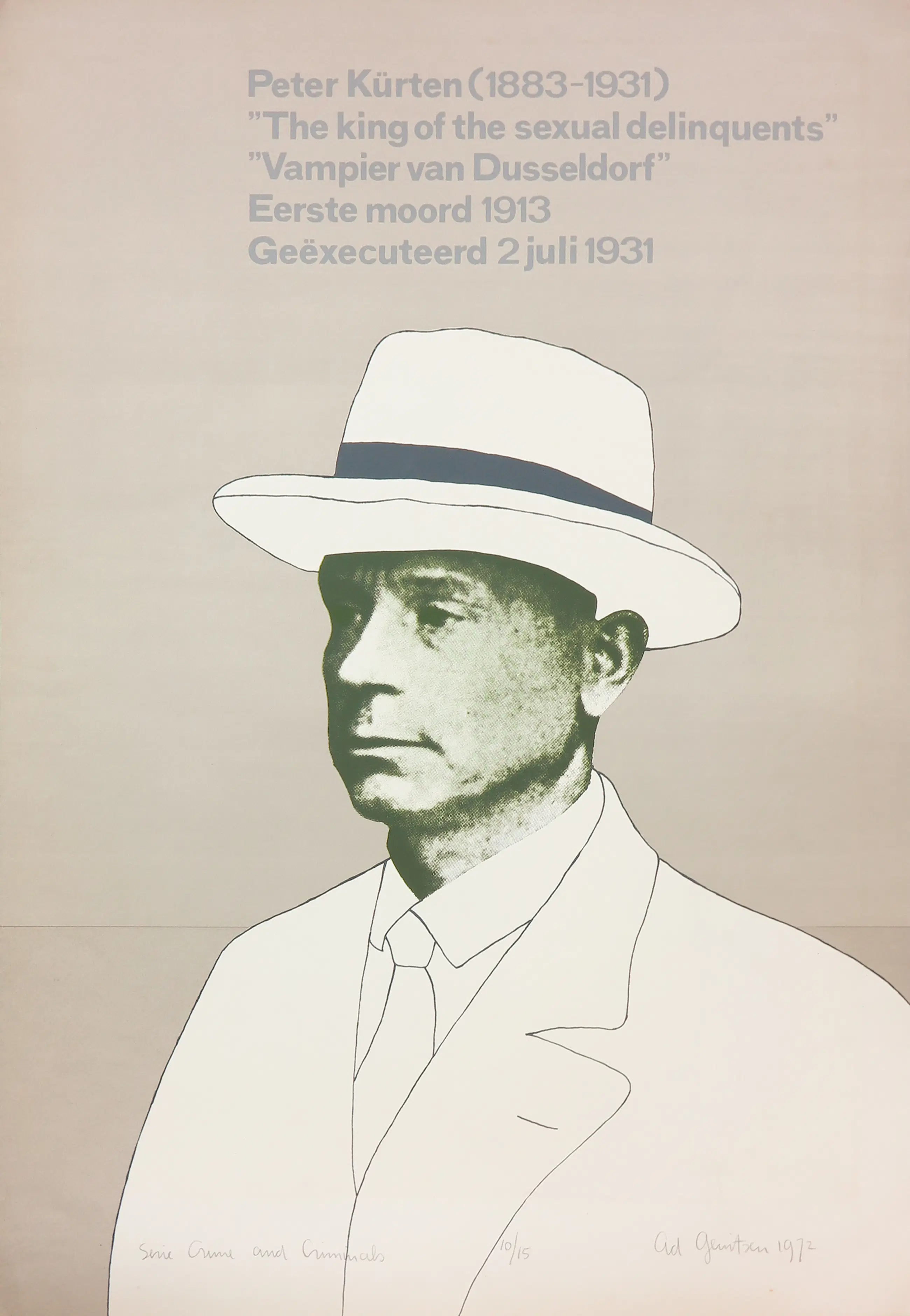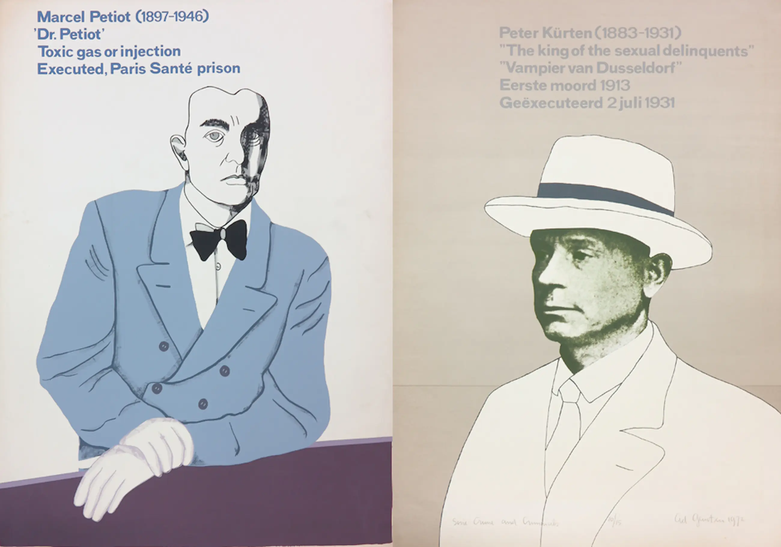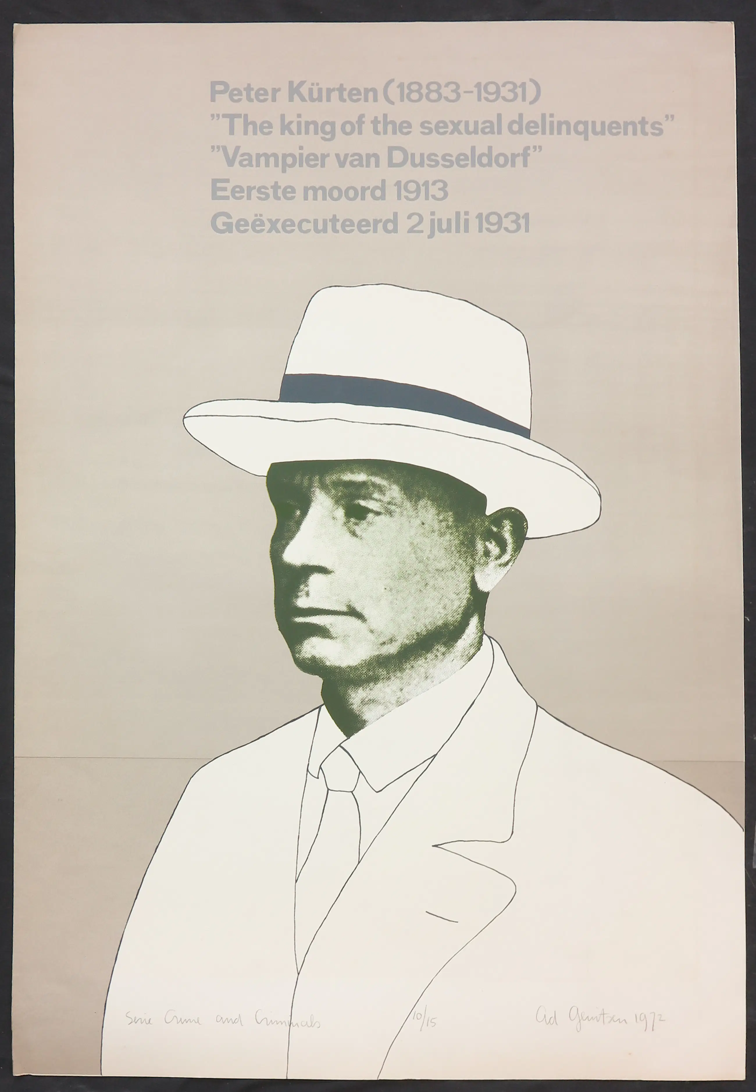 Twee handgesigneerde zeefdrukken van kunstenaar Ad Gerritsen. Binnen het oeuvre van Gerritsen speelt criminaliteit een belangrijke rol. De grafiekserie "Crime and Criminals," speelt verder in op zijn fascinatie voor criminaliteit en de duistere kanten van de samenleving. Elke zeefdruk licht een andere seriemoordenaar uit, eveneens welke straf zij hiervoor hebben gekregen.