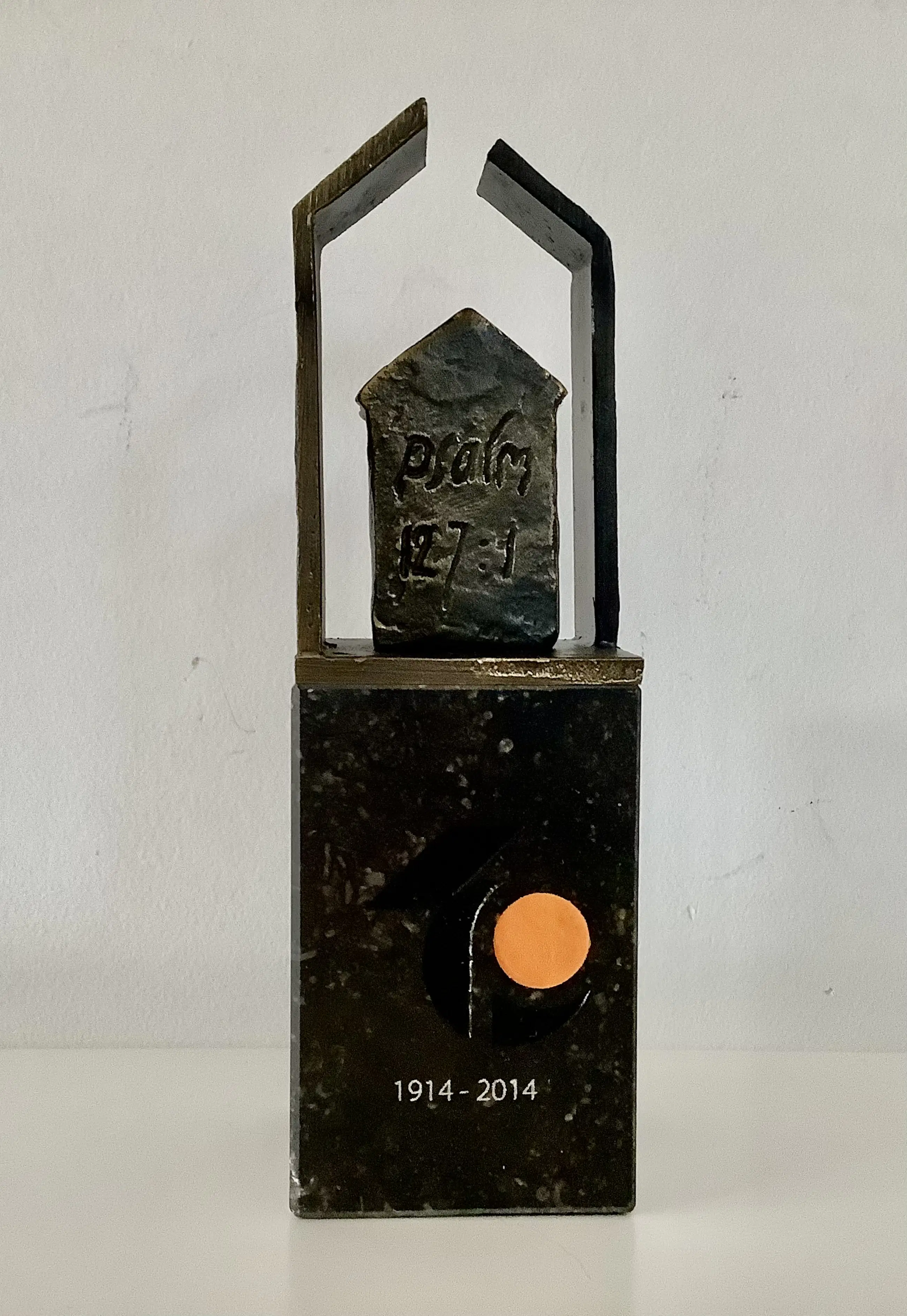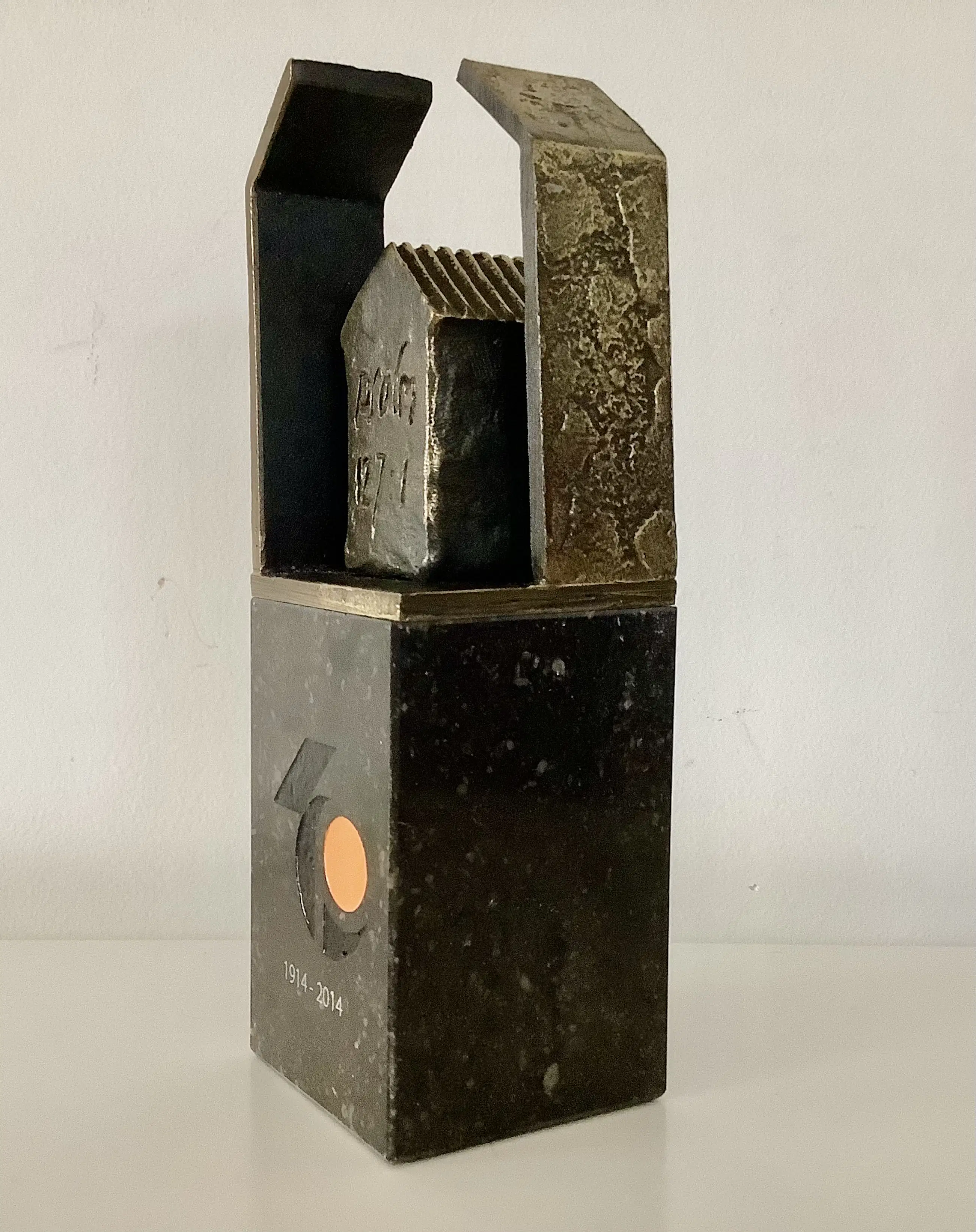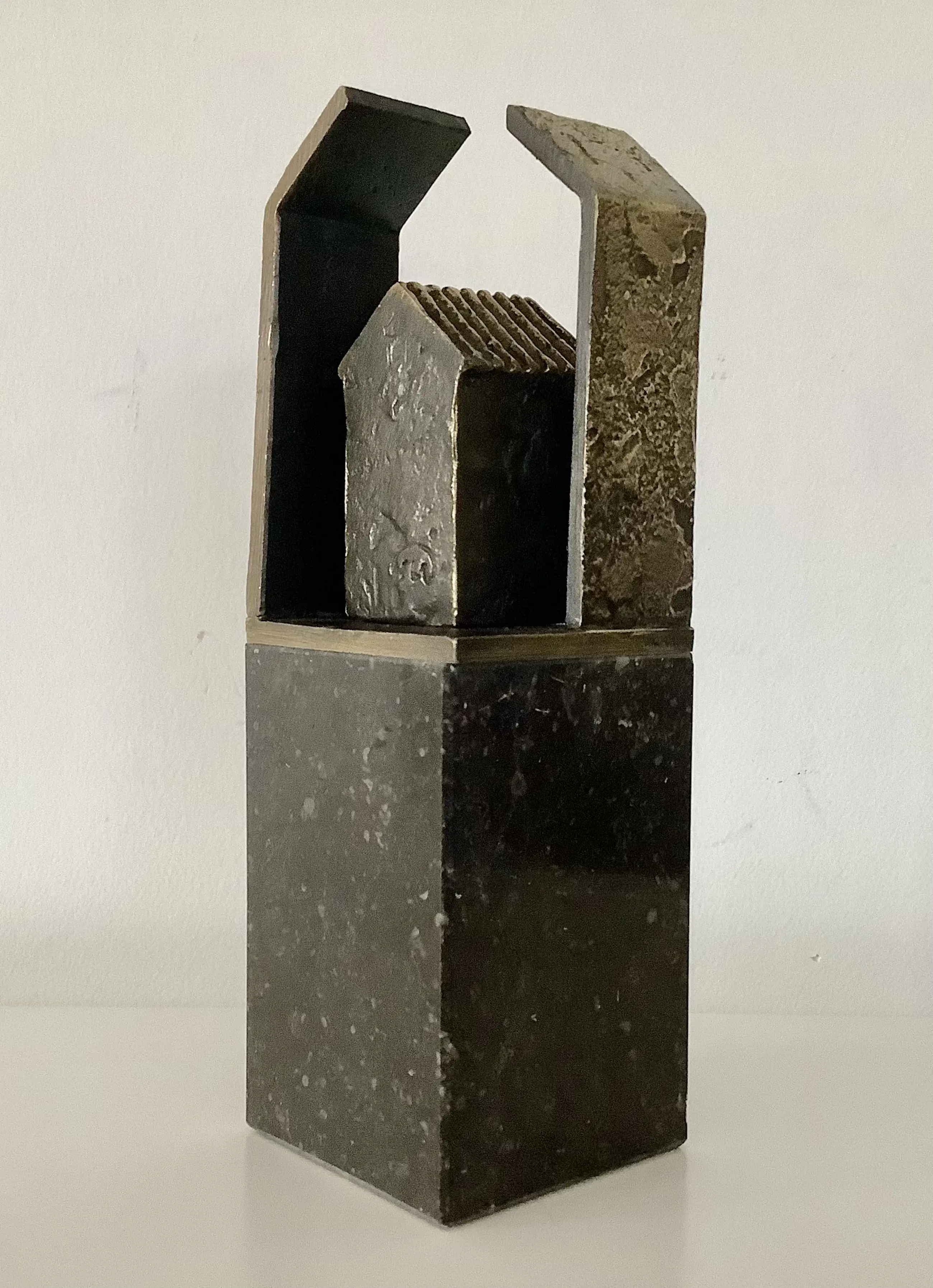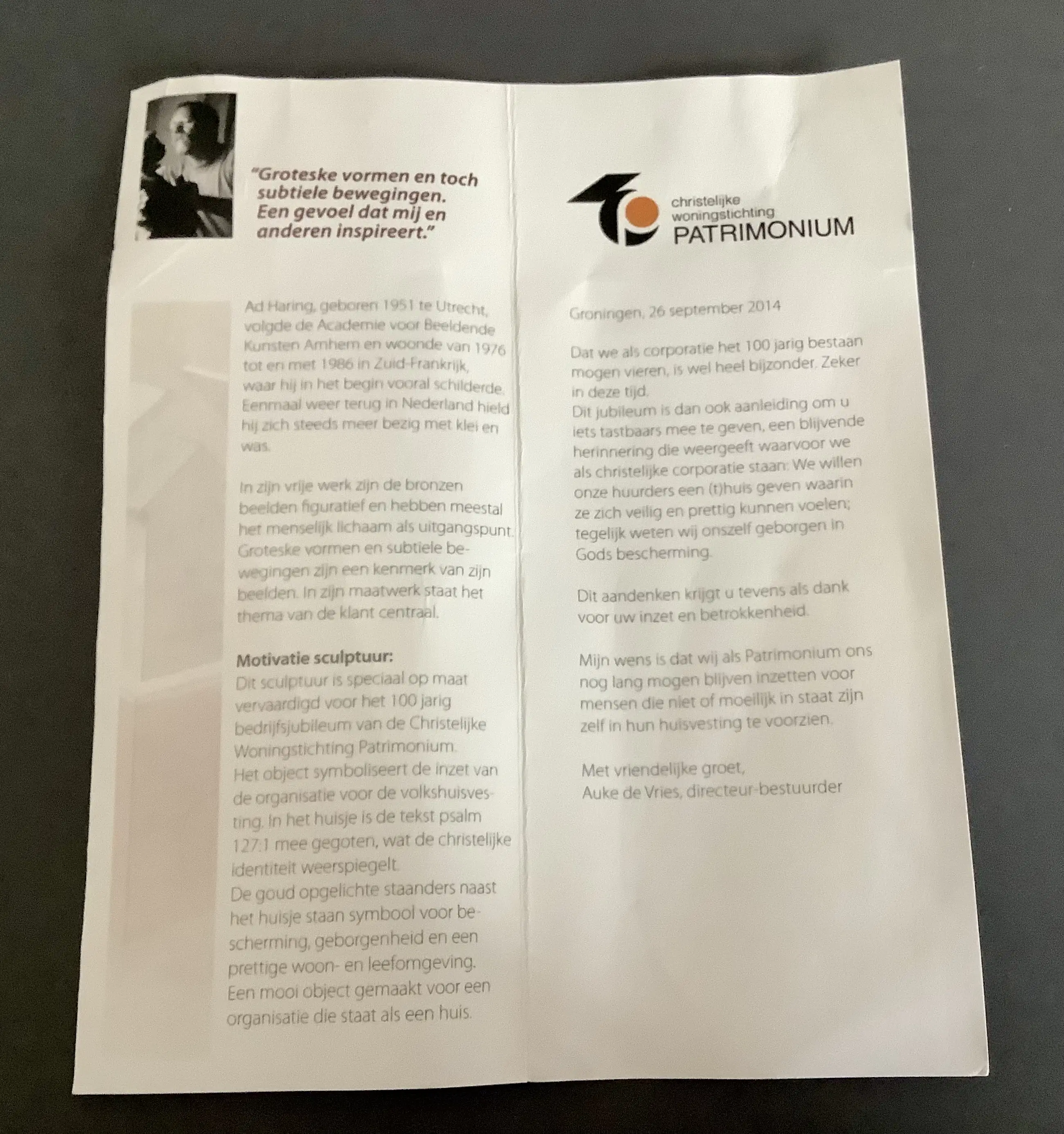 Mooi voorbeeld van werk in opdracht door Aad Haring voor het 100 jarig bedrijfsjubileum van de Christelijke Woningstichting Patrimonium. Fraai symbolisch werk op natuurstenen sokkel. Zwaar object.