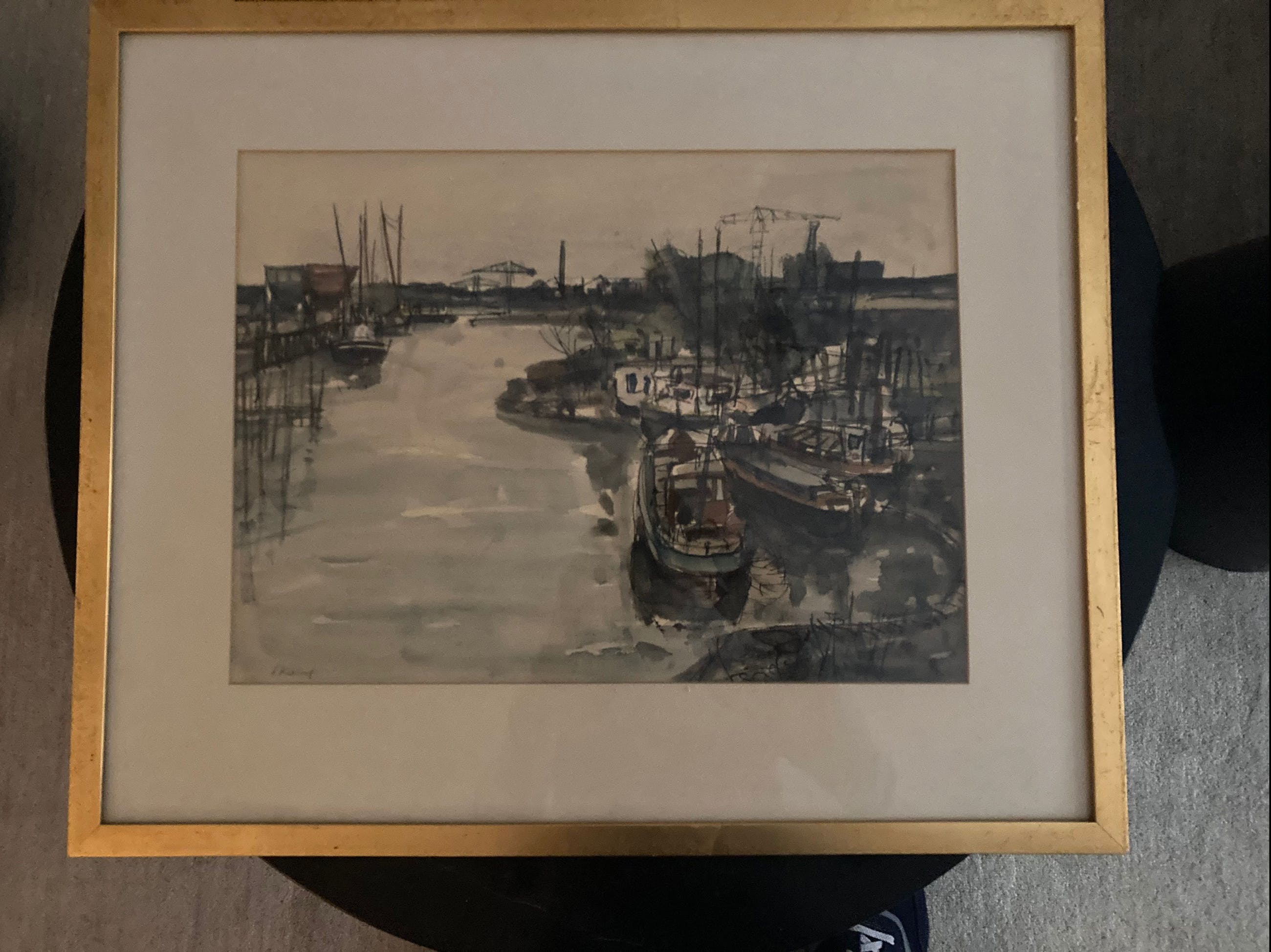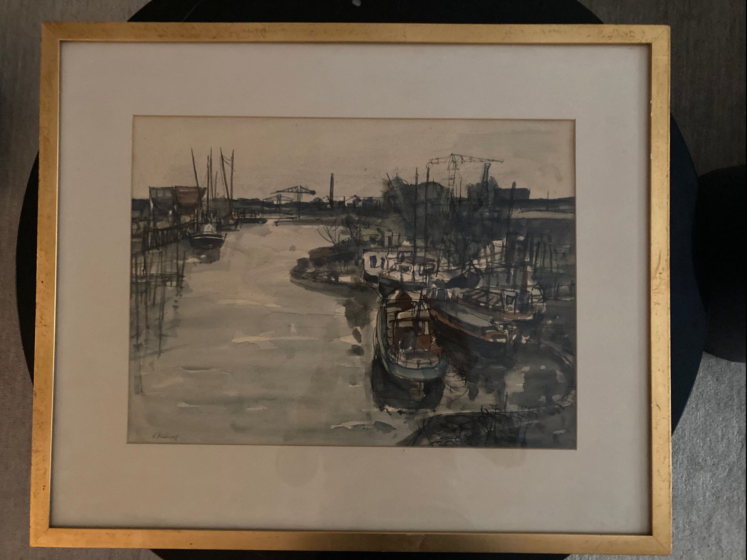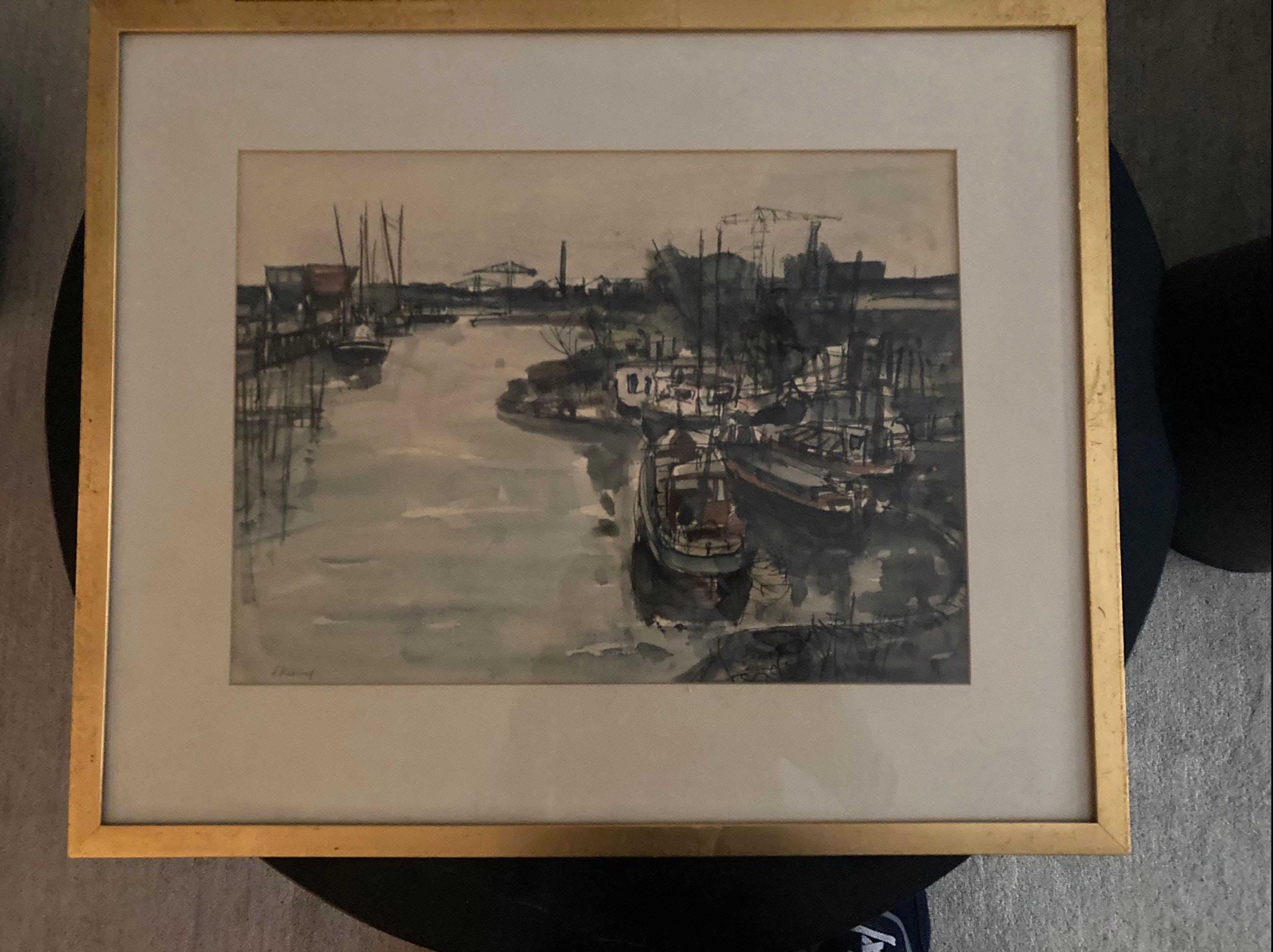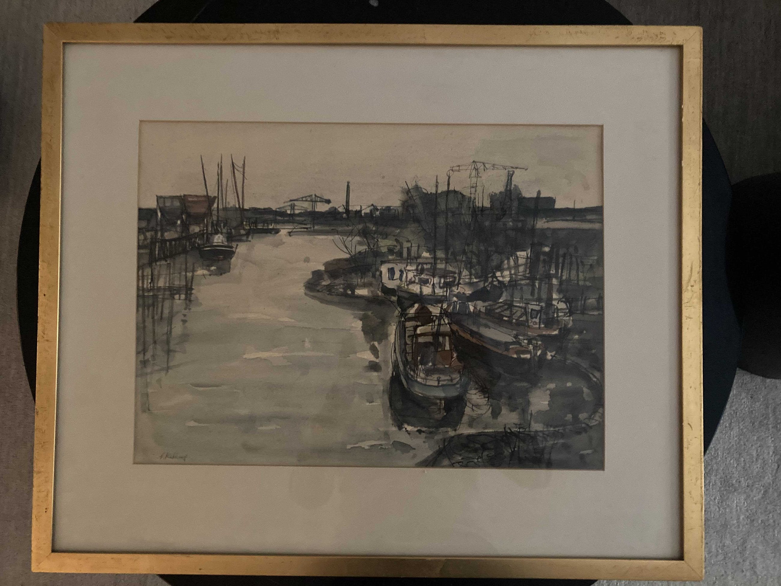 Schilderij met havengezicht en industriële achtergrond.