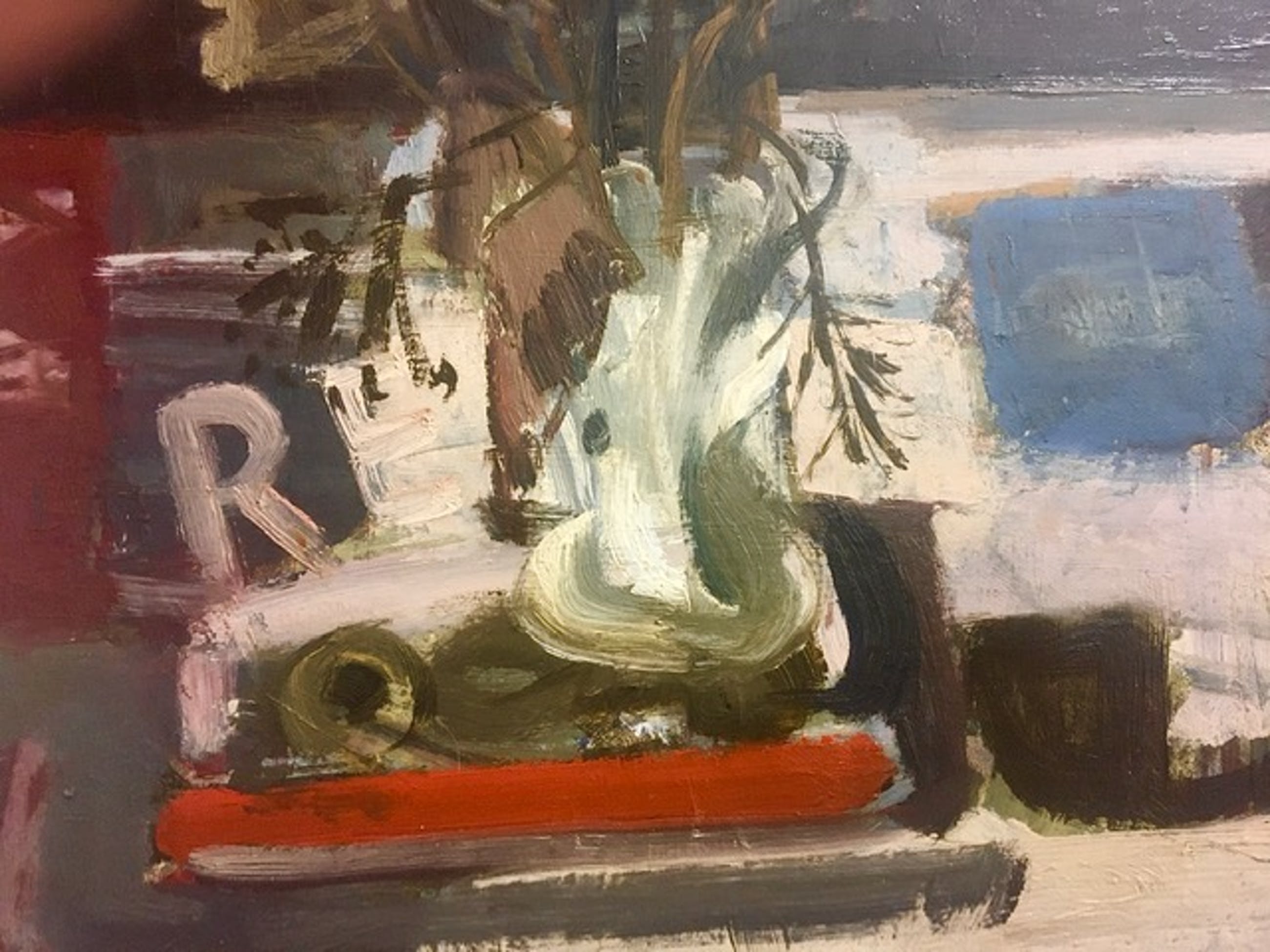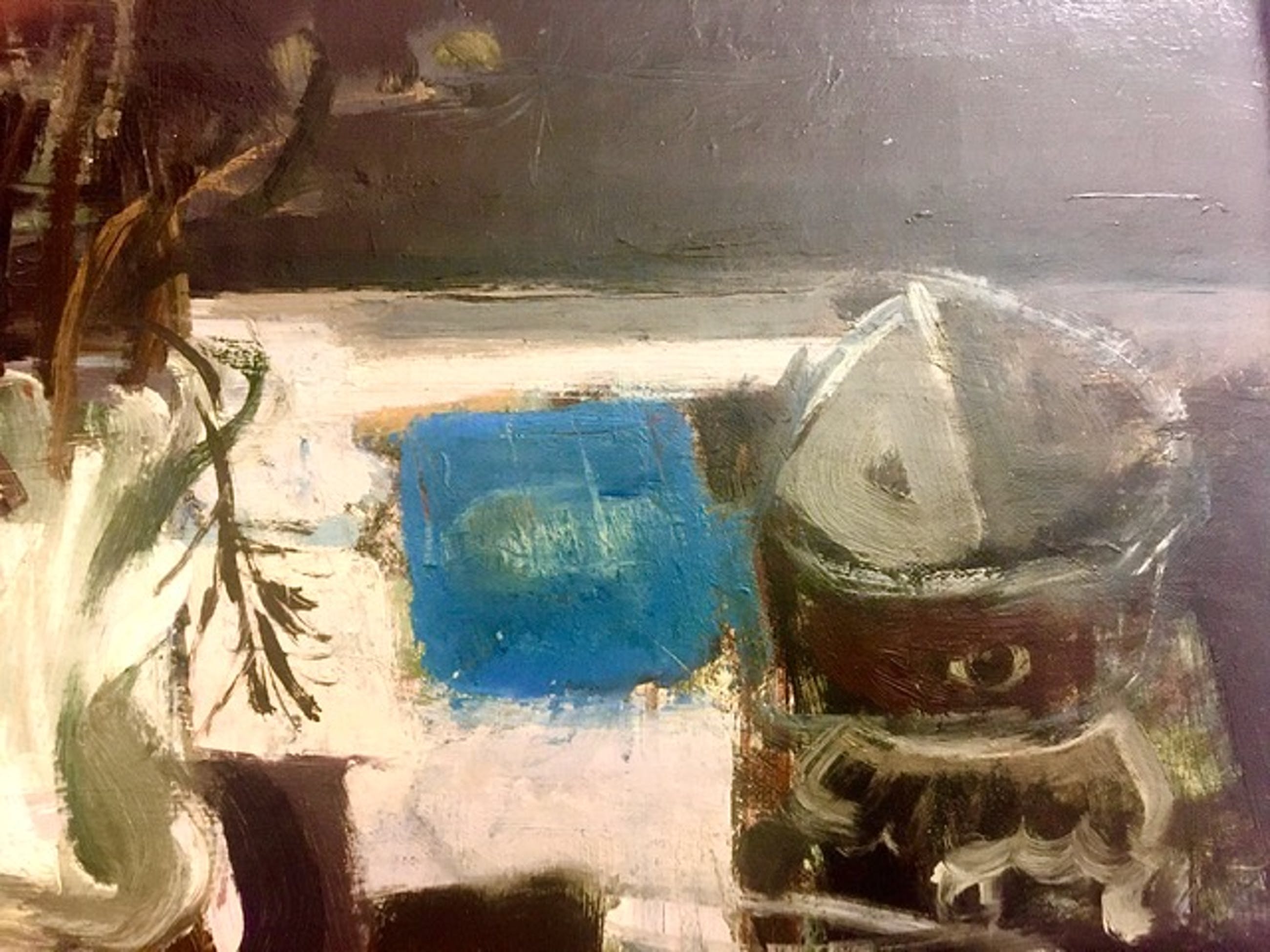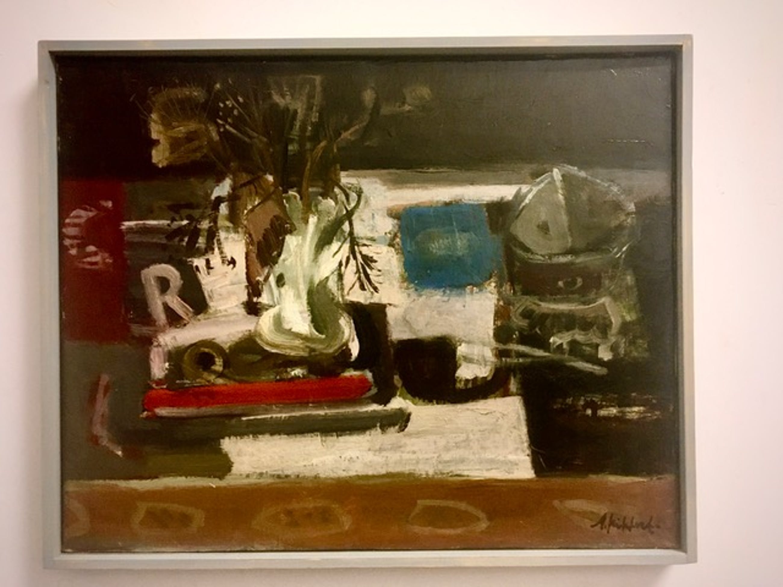 Aangeboden markant werk van de Rotterdamse kunstenaar Ad Kikkert,1914 1995, opleiding kunstacademie te Rotterdam. Het werk getiteld Stilleven vertoont in details herkenbare motieven, maar is in zijn geheel abstract en mag daarom ook wel gezien worden als een experimenteel werk in een stijl van overgang van figuratie naar abstractie.