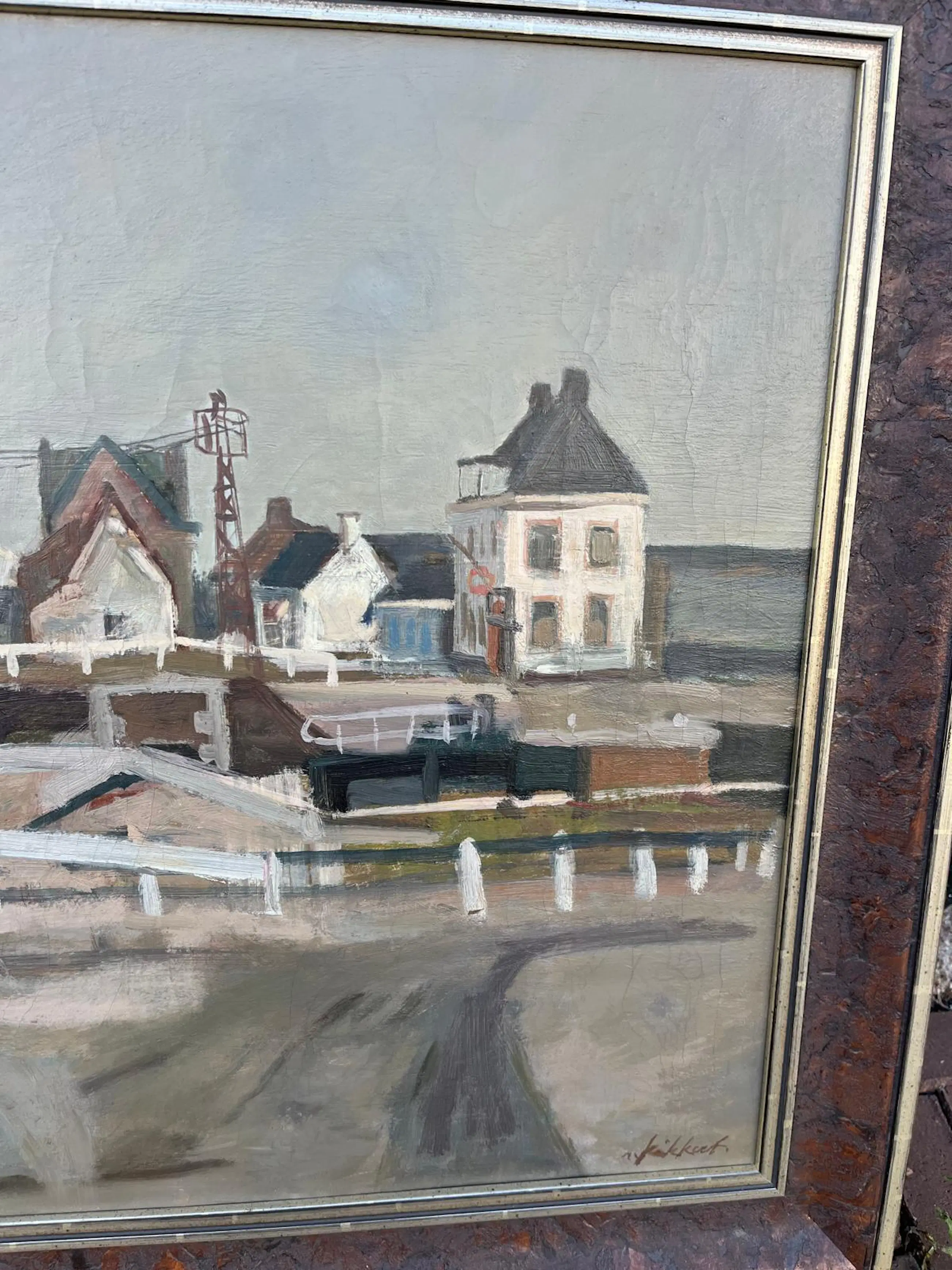 Fraai werk van de schilder Ad Kikkert, Rotterdamse kunstenaar Mooi ingelijst zicht op het inmiddels verdwenen dorpje Nieuwersluis