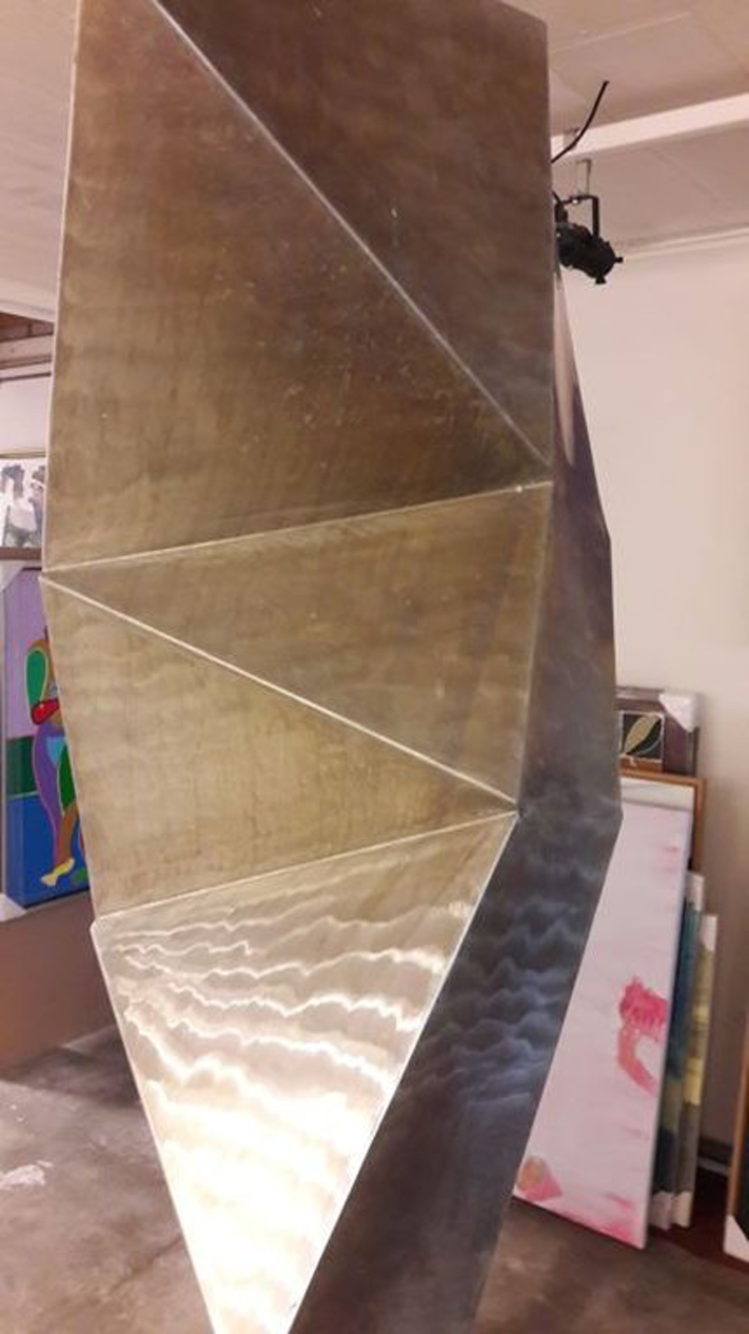 Een grijs aluminium object met geruwd oppervlak dat destijds bij de opening van de nieuwbouw voor de ingang geplaatst in het kader van de rijkspercentage-regeling.