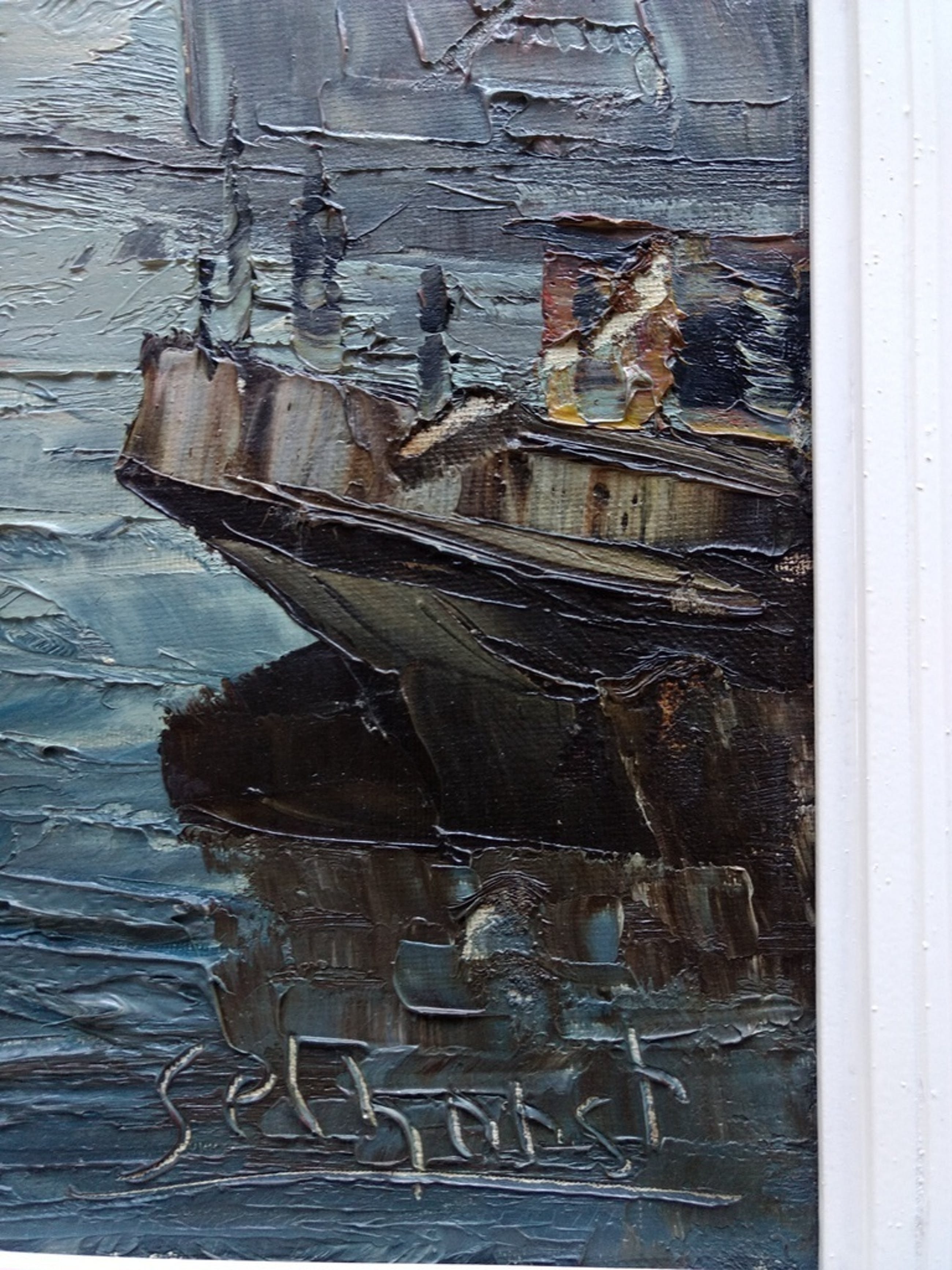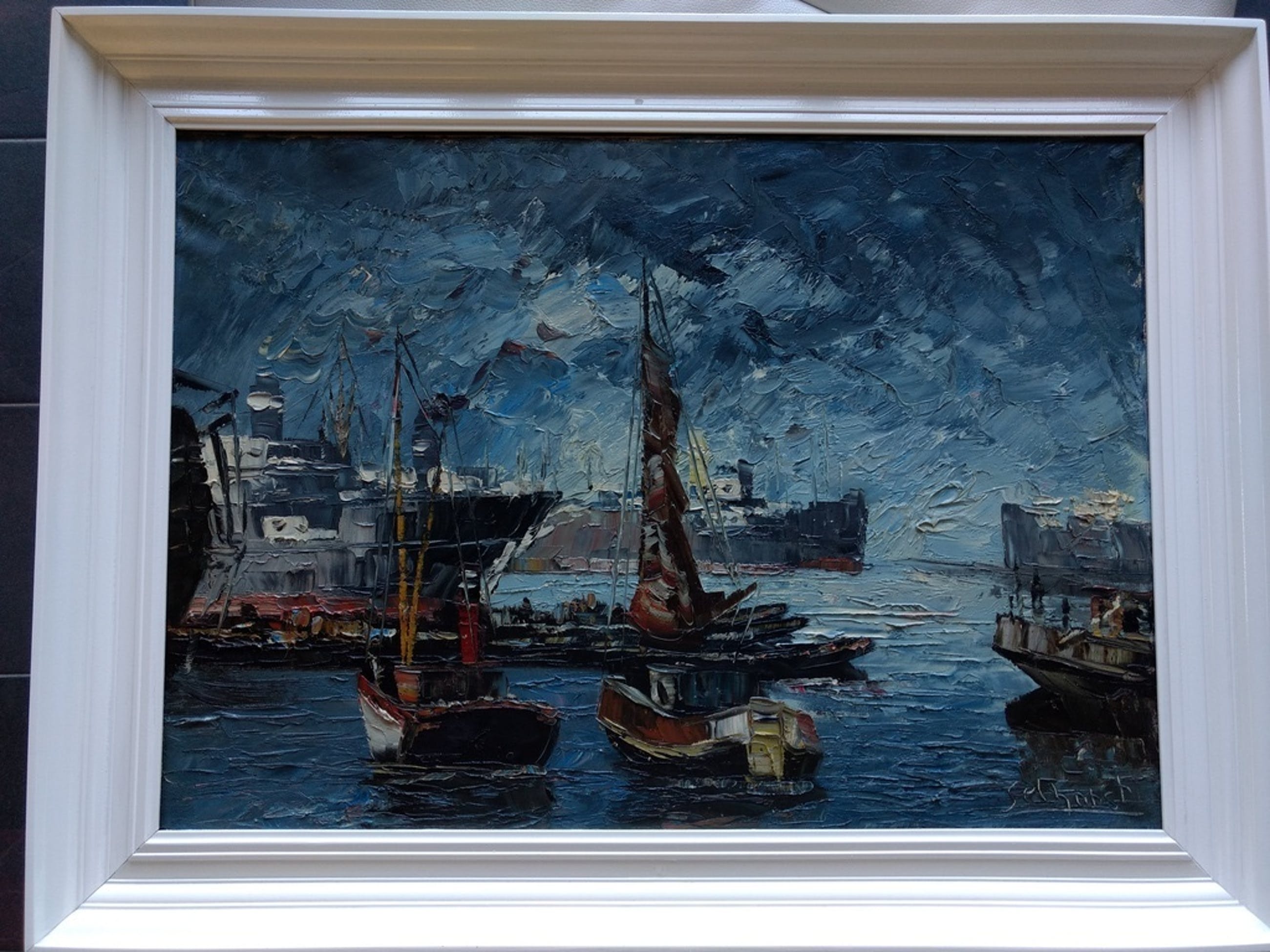 Mooi ingelijst olieverfschilderij van Ad Selhorst: Havengezicht