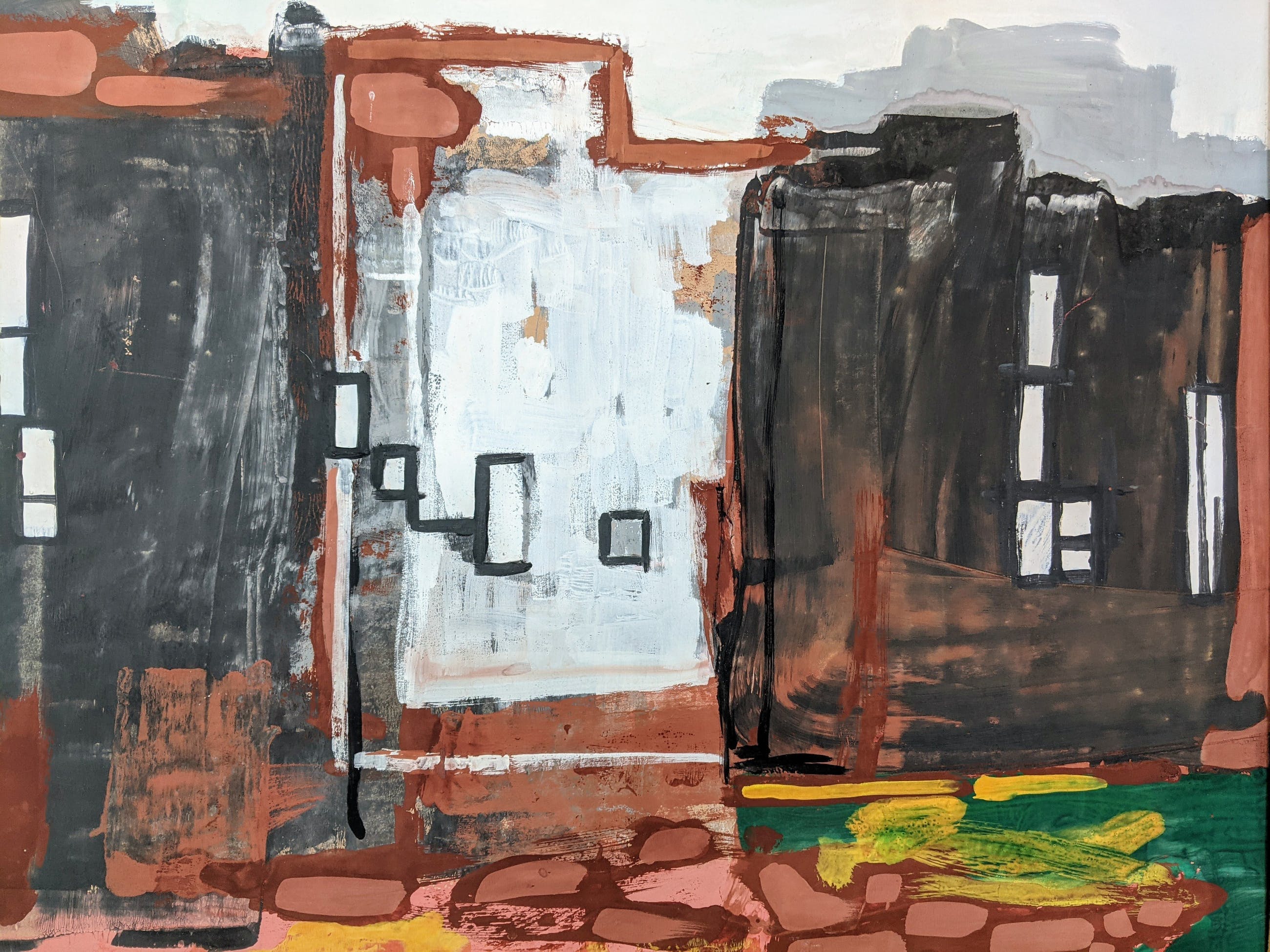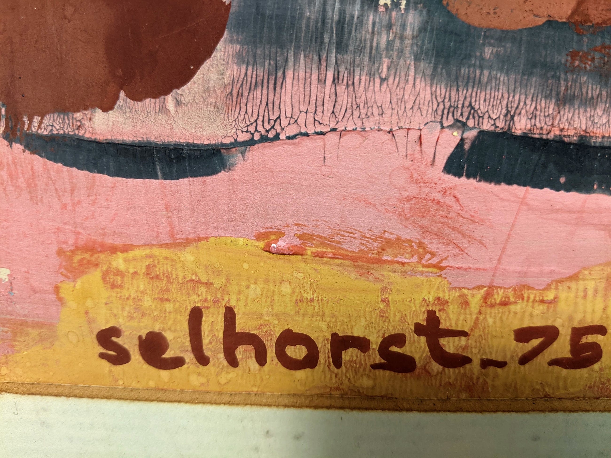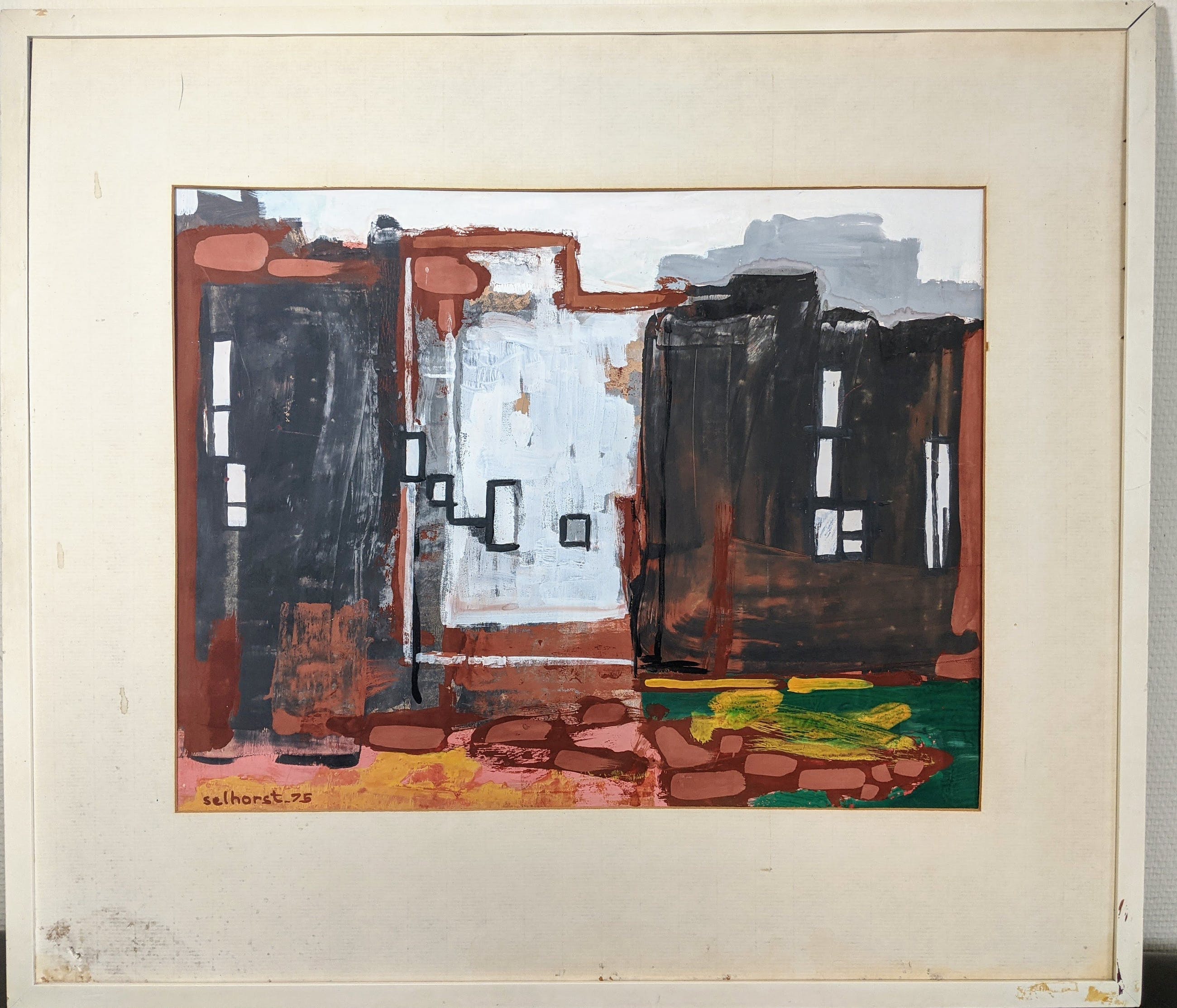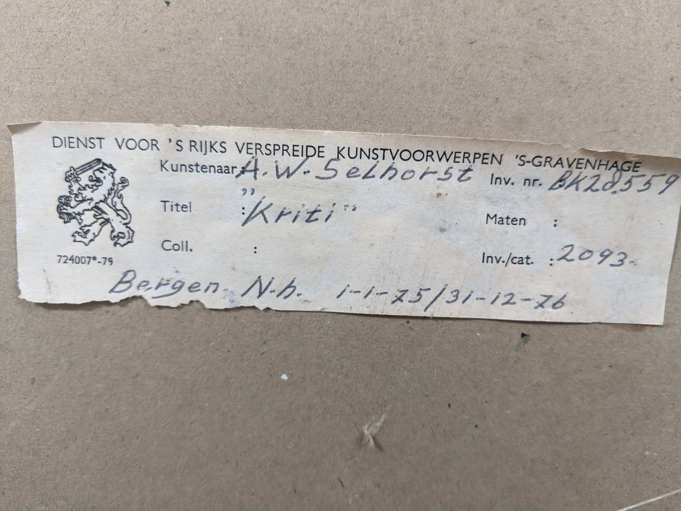 Dit werk heeft jarenlang gehangen als onderdeel van de kunstenaarsregeling. Zie ook de sticker aan de achterzijde. Het kunstwerk is in goede staat. De lijst en passe-partout zijn origineel, maar aan vervanging toe. Op verzoek- en tegen meerprijs kunnen wij dit verzorgen.