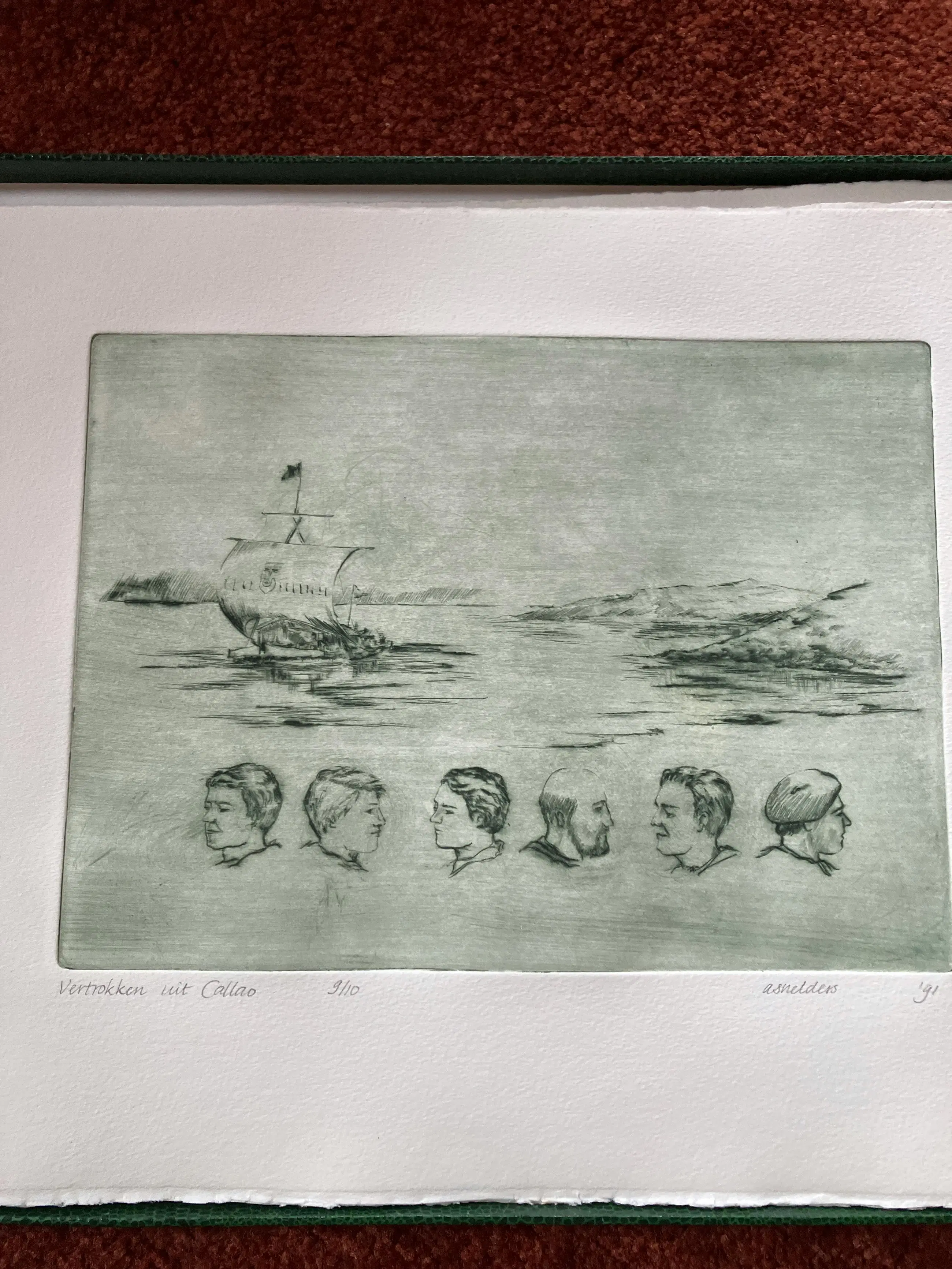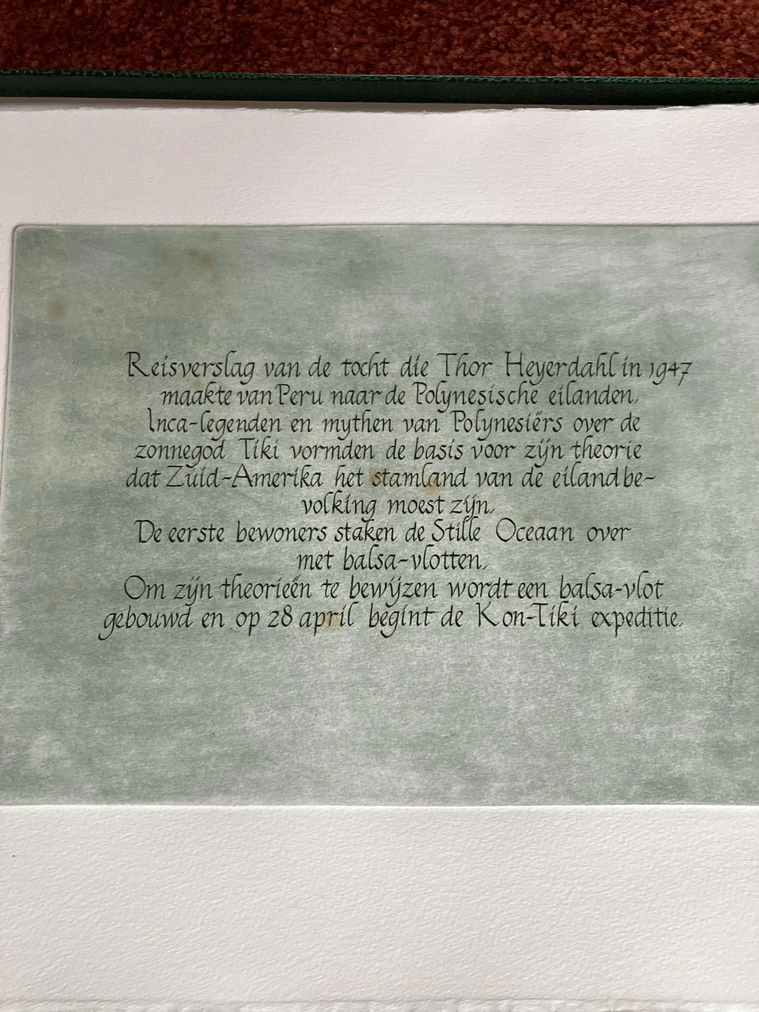 Een vlot voor Thor is een prachtig “boekwerk” wat het reisverslag van de tocht die Thor Heyerdahl in 1947 maakte van Peru naar de Polynesische eilanden. Het reisverhaal bestaat uit 10 etsen met een afbeelding en twee etsen met tekst. Het “ boekwerk” zijn allemaal losse pagina’s ( etsen) in een doos.