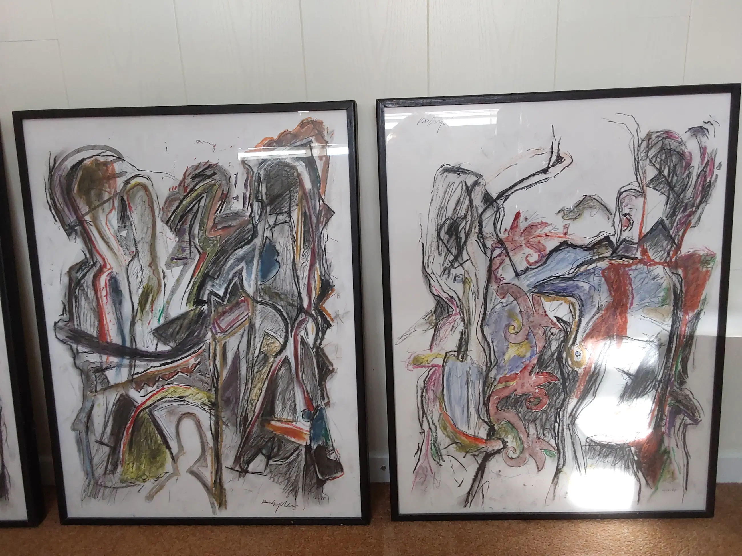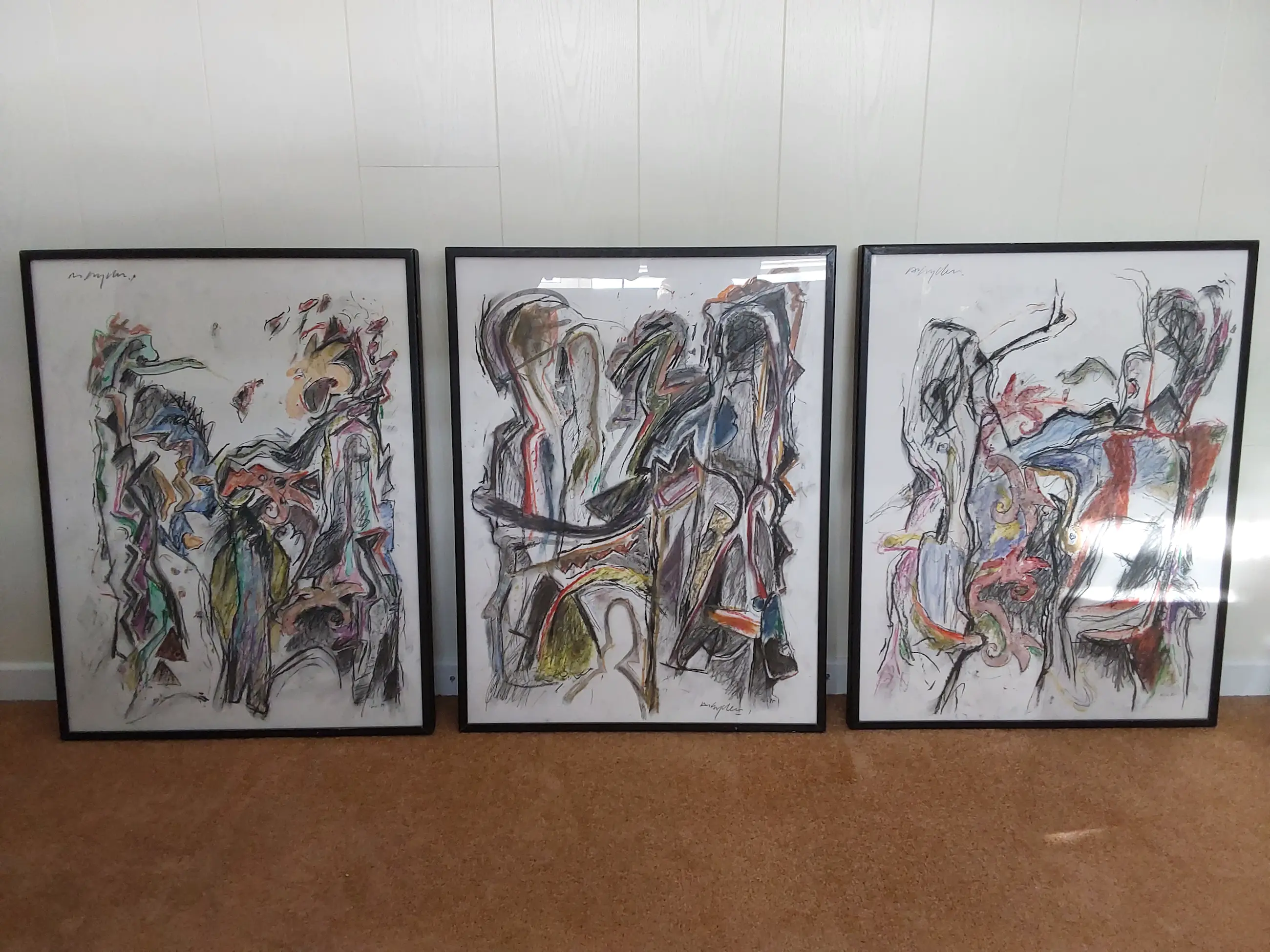 Een abstracte 3 Luik tekening uit 1985. Werk van Ad Snijders op een geheel eigen stijl getekend en fascinerend is en gesigneerd.