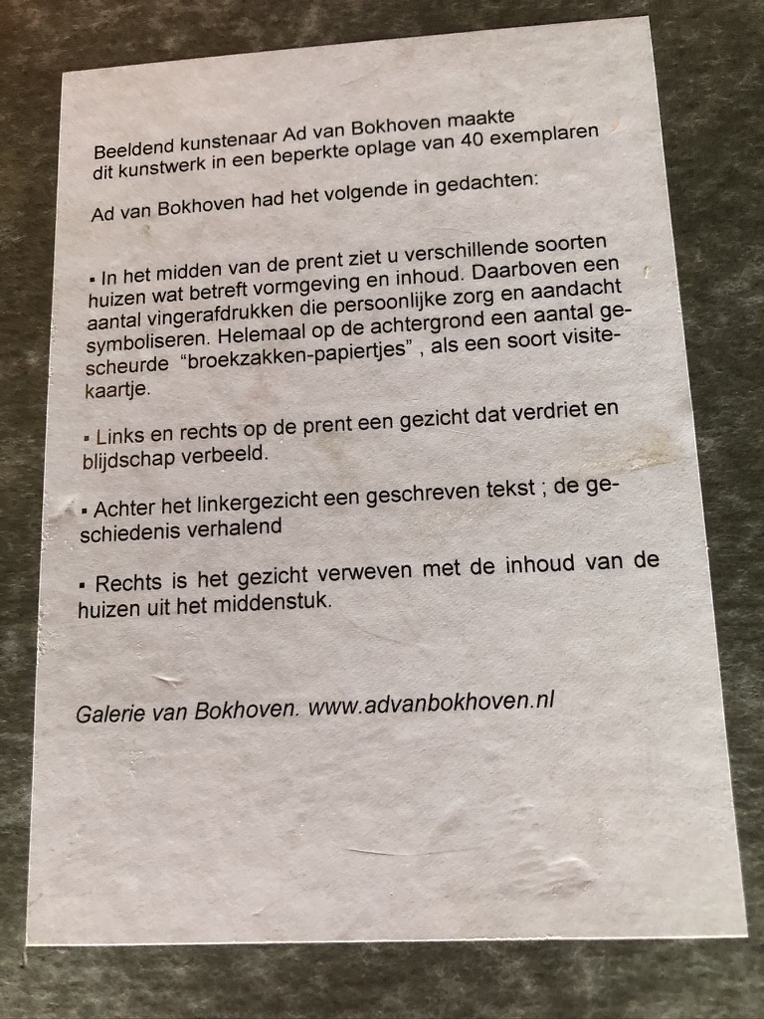 Achter op het kunstwerk staat het verhaal achter de kunstwerken afgedrukt.