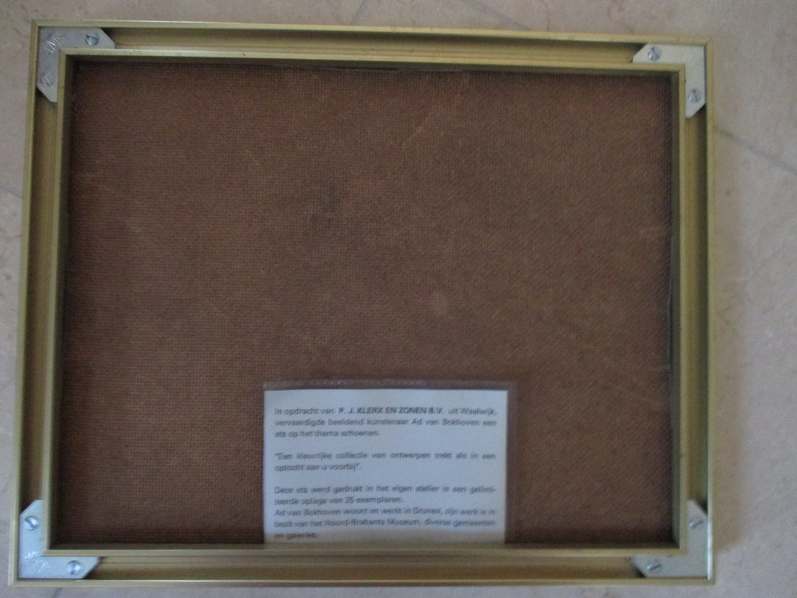 Ingekleurde ets van Ad Van Bokhoven gemaakt in opdracht van P.J. Klrx en Zonen uit Waalwijk. Nummer 17 van 25.