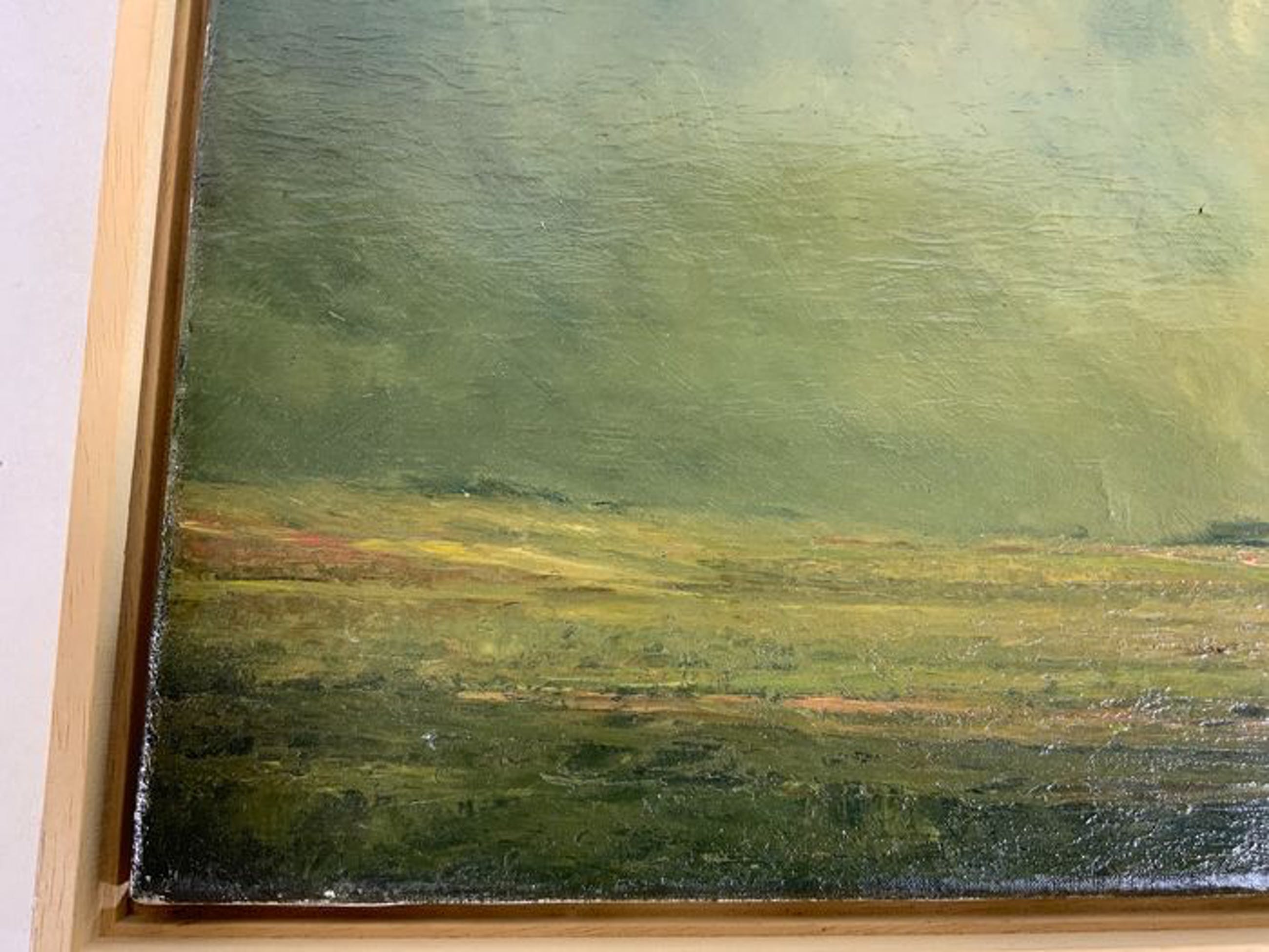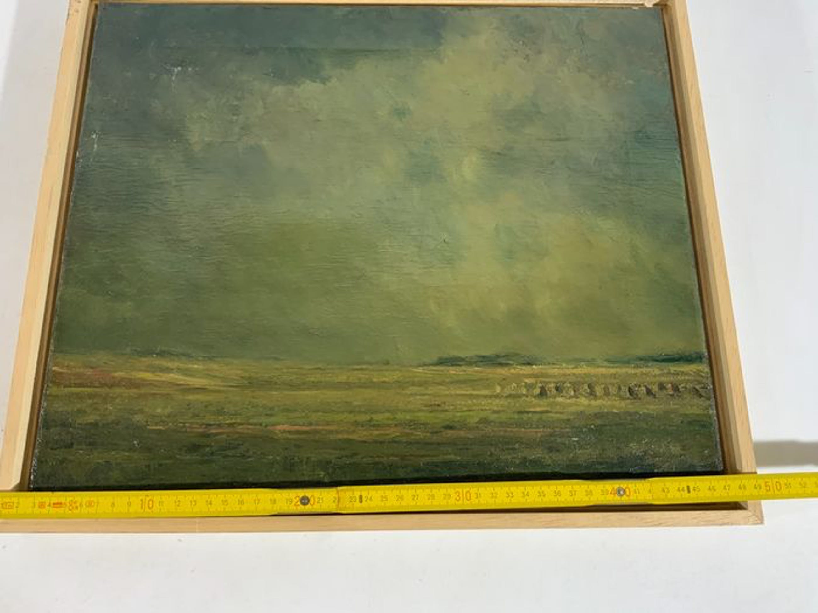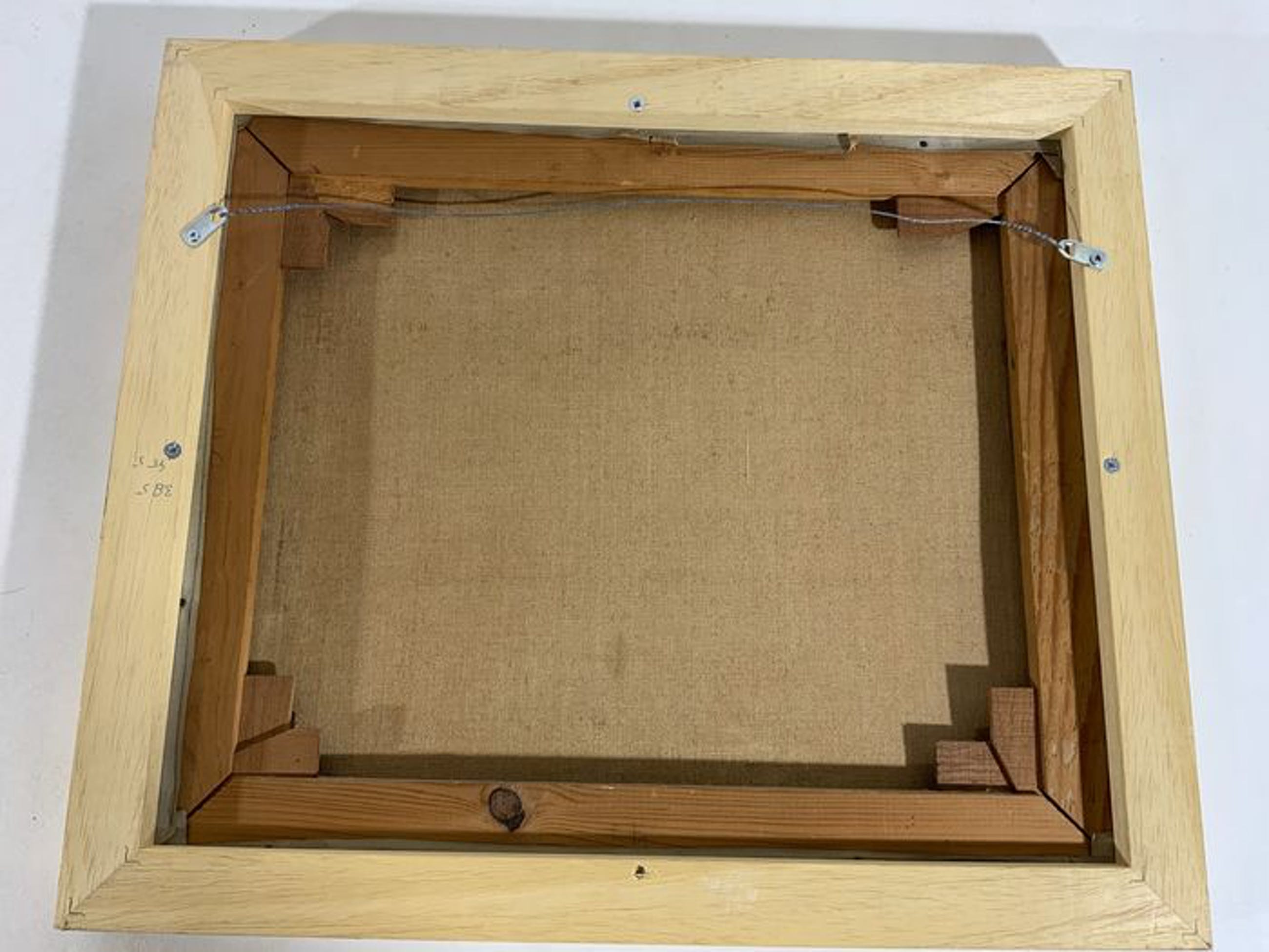 Formaat werk is 50 x 40 cm inclusief. lijst. Conditie is goed - In Luchtpartij wat krassen links boven en rechts-boven een diepere kras. Datering : Op basis van kleurgebruik en linnen schat ik werk uit periode 1940 - 1955 . Locatie is moeilijk te duiden.