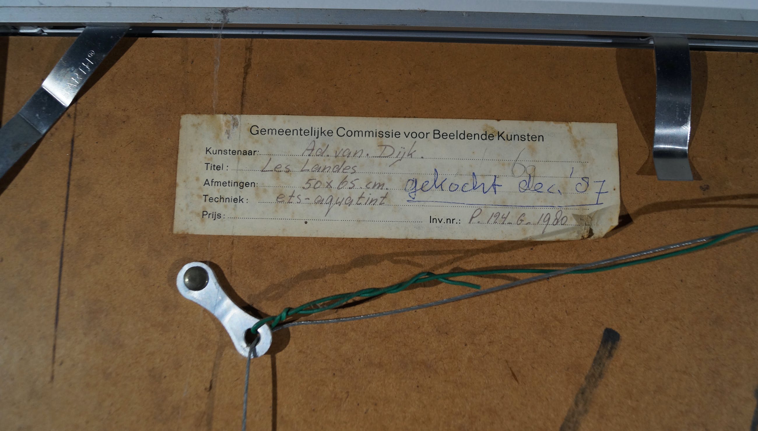 Mooie ets van Ad van Dijk (Bergen op Zoom 1932 - Assen 2017) Adrianus Christianus Maria (Ad) van Dijk (geb. 1932) is een Nederlandse etser en graficus. Hij genoot zijn opleiding aan de Academie van Beeldende Kunsten en de Vrije Academie, beide in Den Haag.