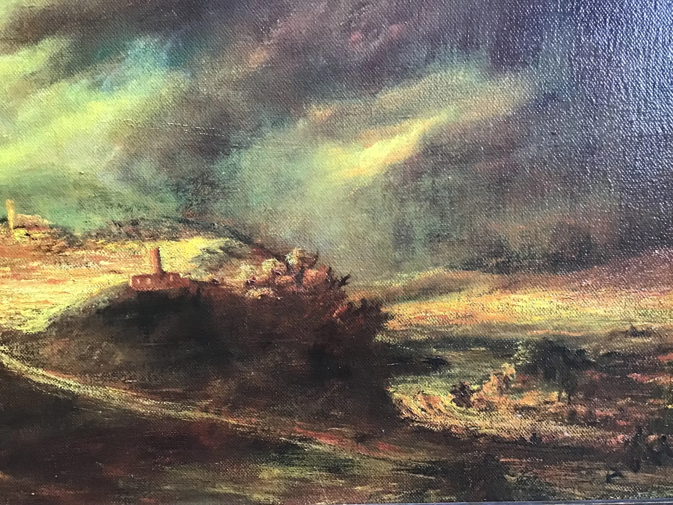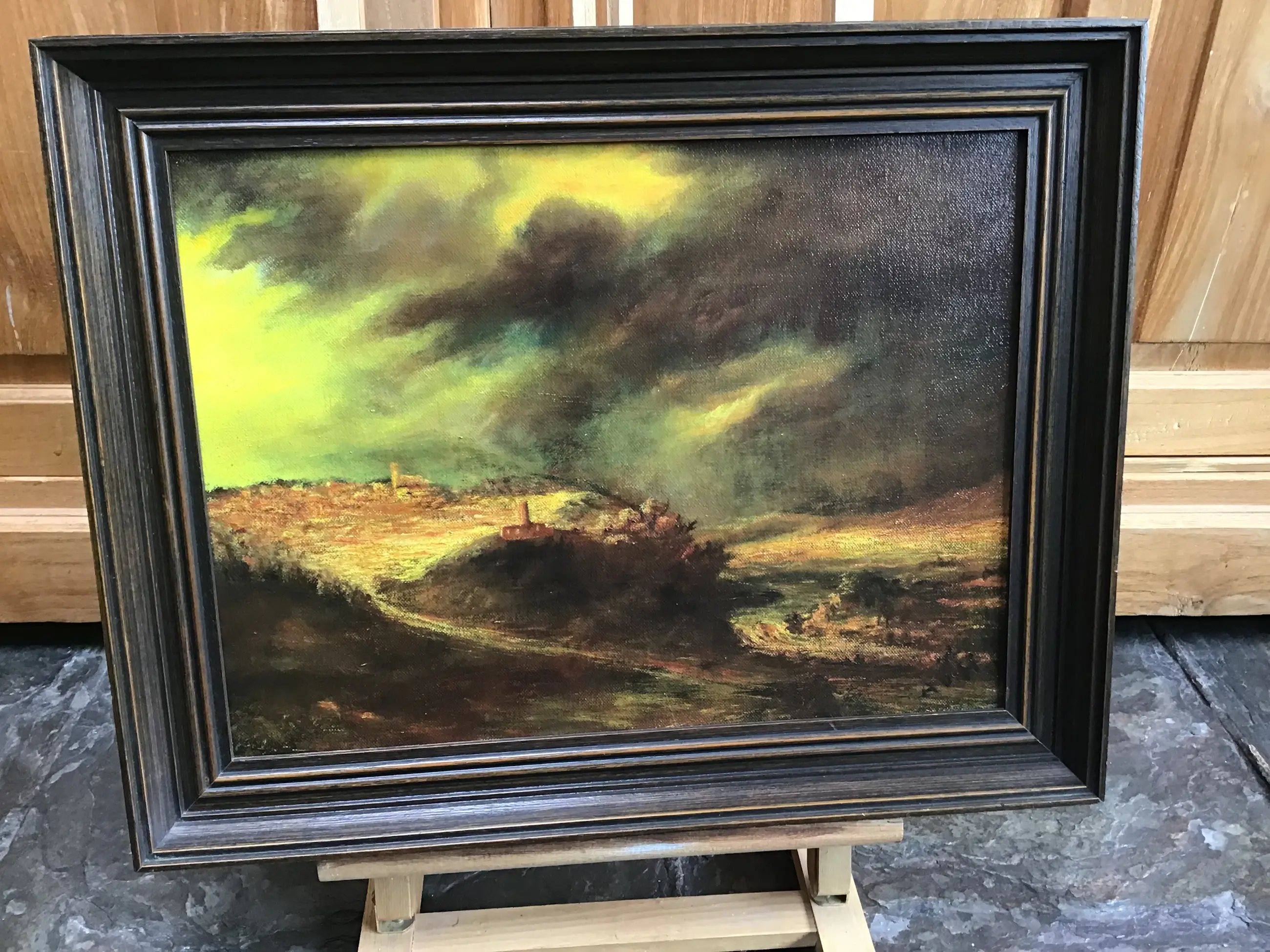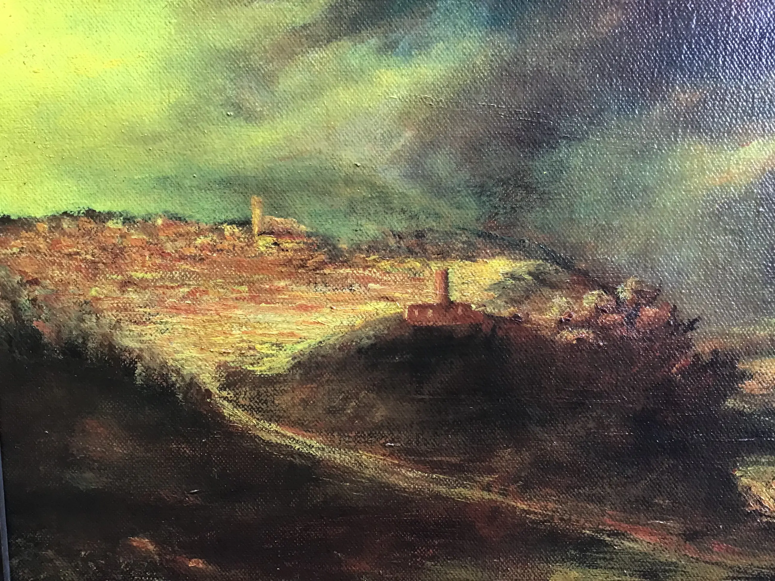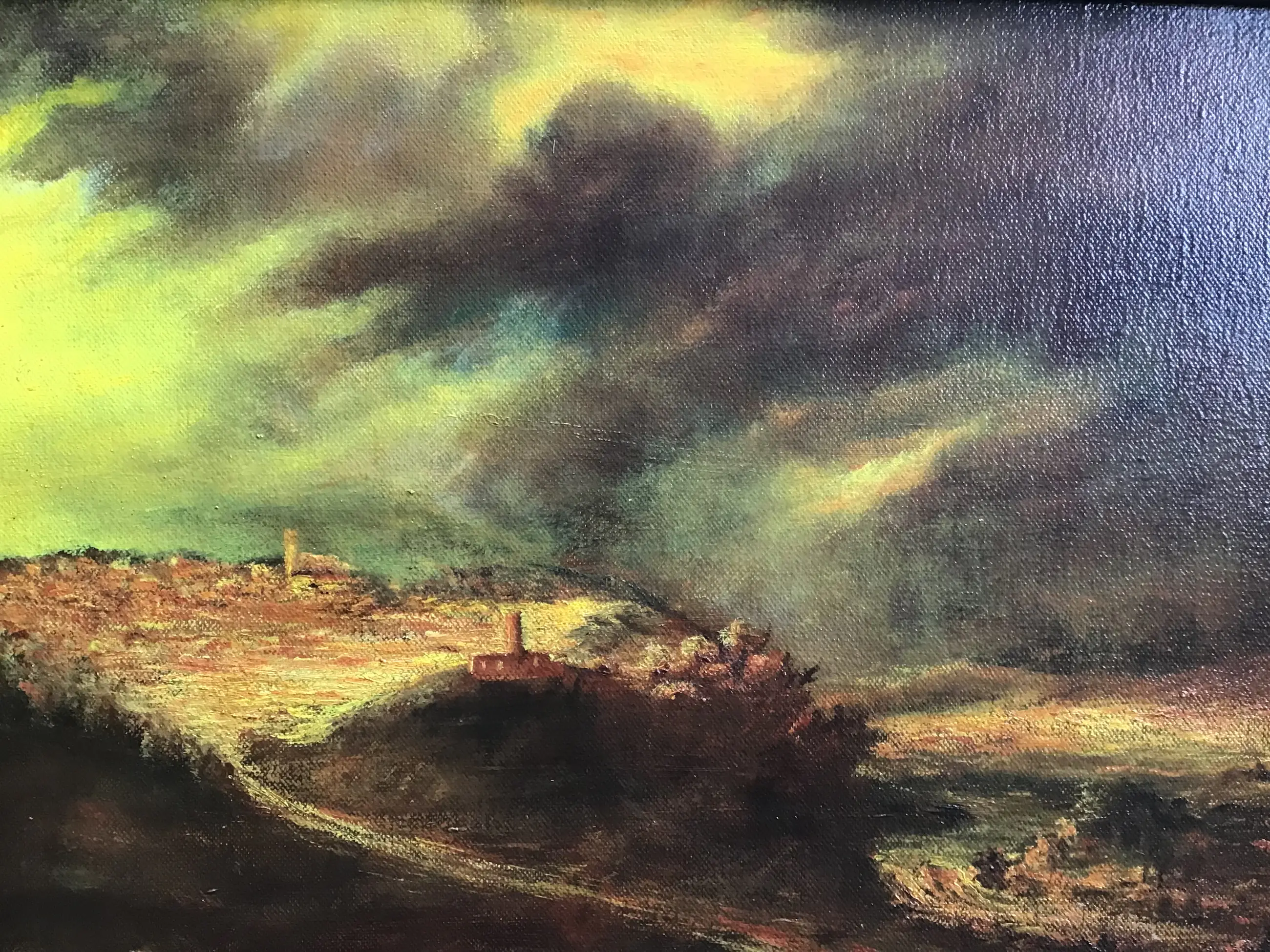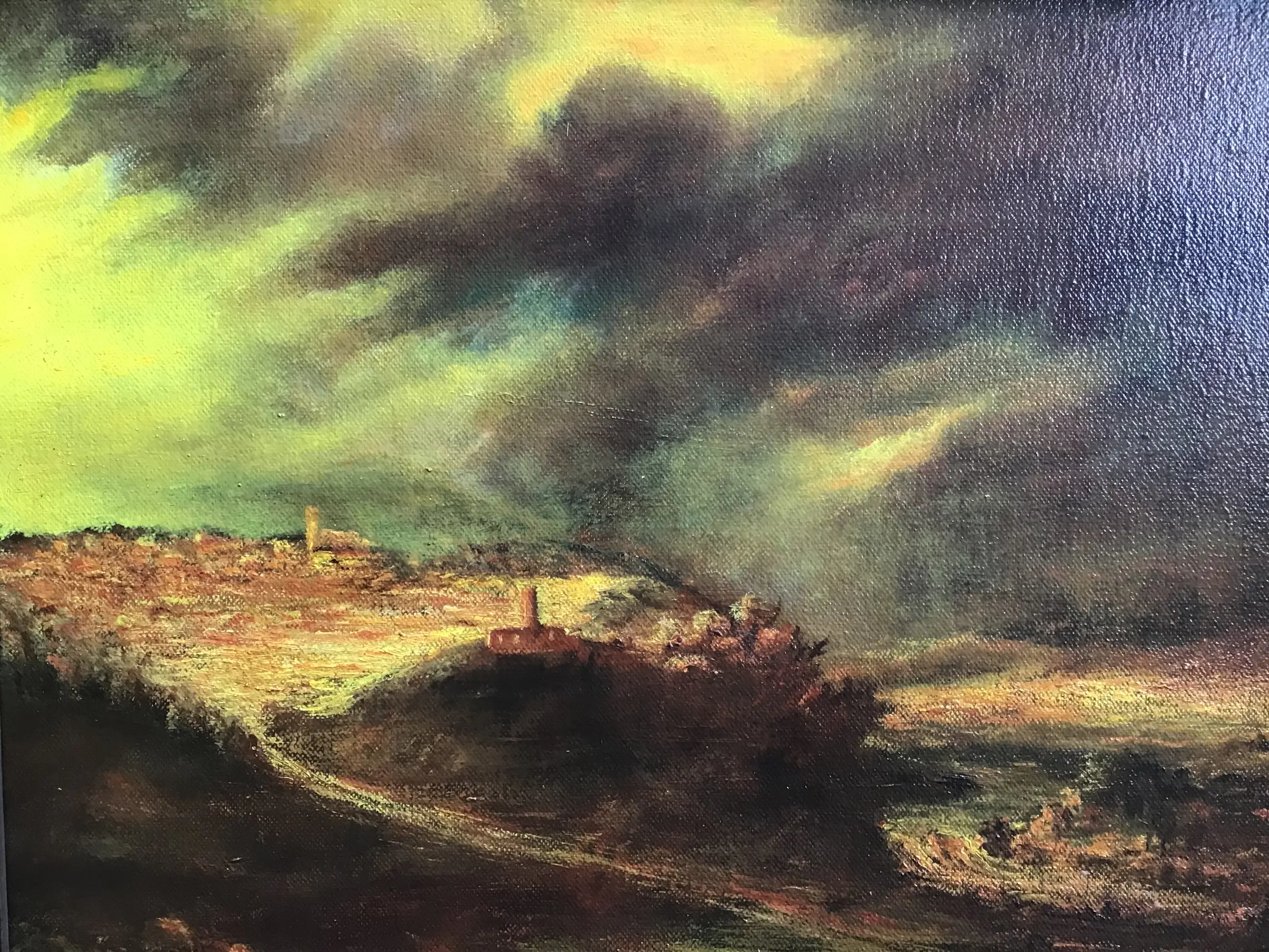 Impressie van een stadje onder een dreigende lucht op een heuvel. Ad van Haandel is een Helmondse kunstenaar.