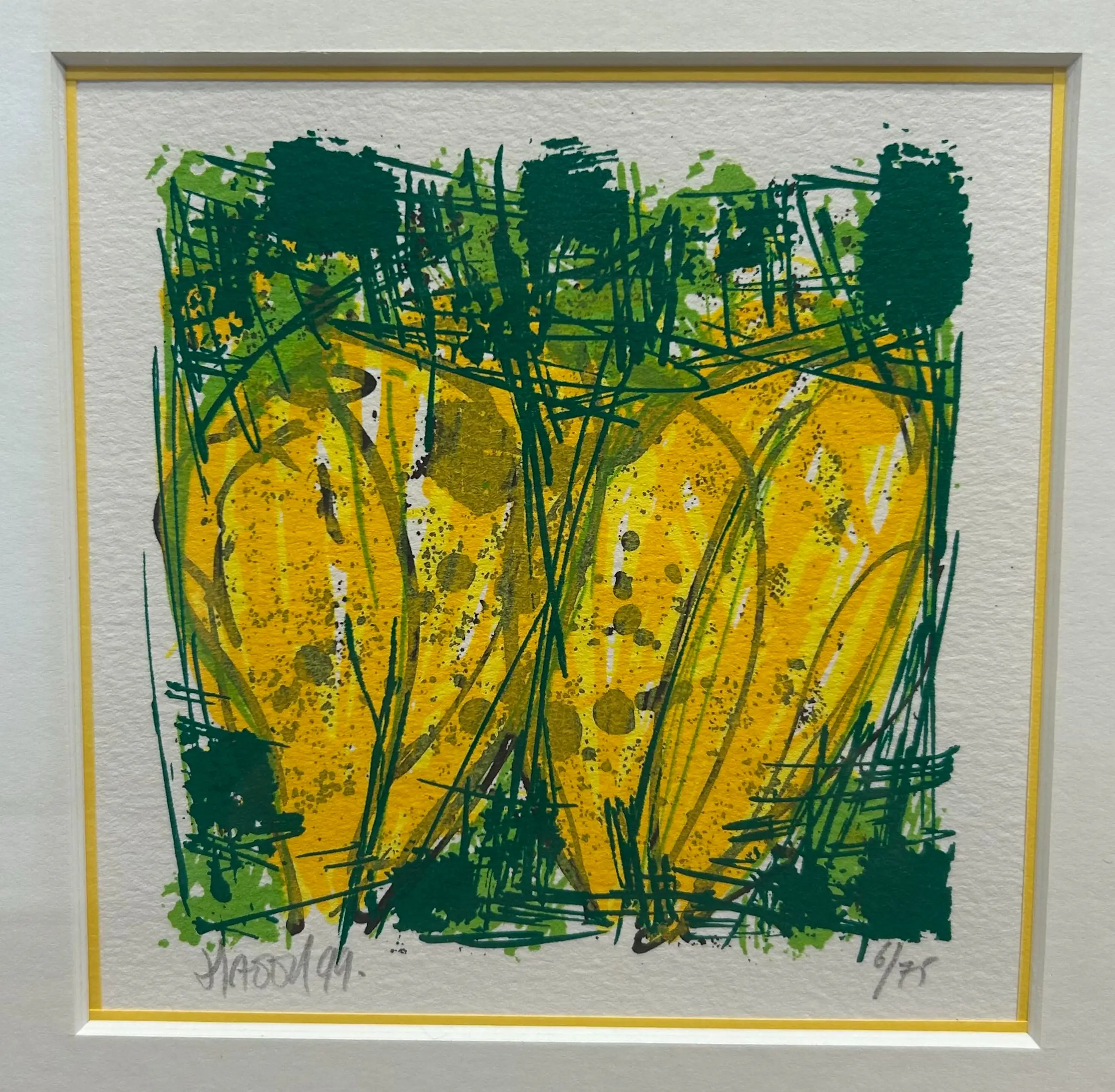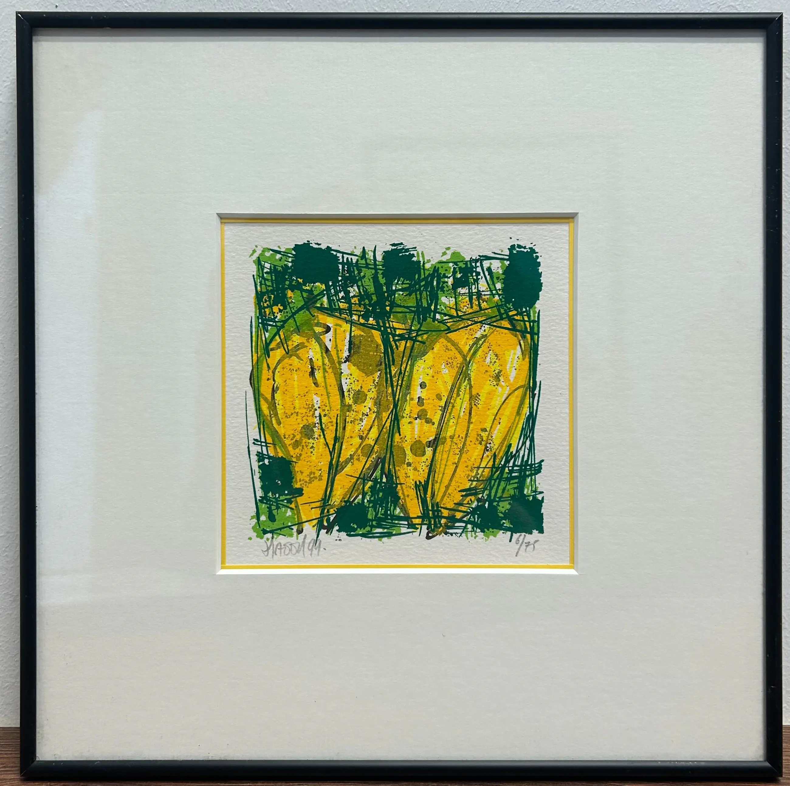 De zeefdrukken zijn verzorgd ingelijst in een zwarte aluminium lijst, voorzien van een passe-partout en geplaatst achter glas, wat zorgt voor een stijlvolle en beschermende presentatie. De lijsten vertonen lichte, normale gebruikssporen, passend bij regulier gebruik.