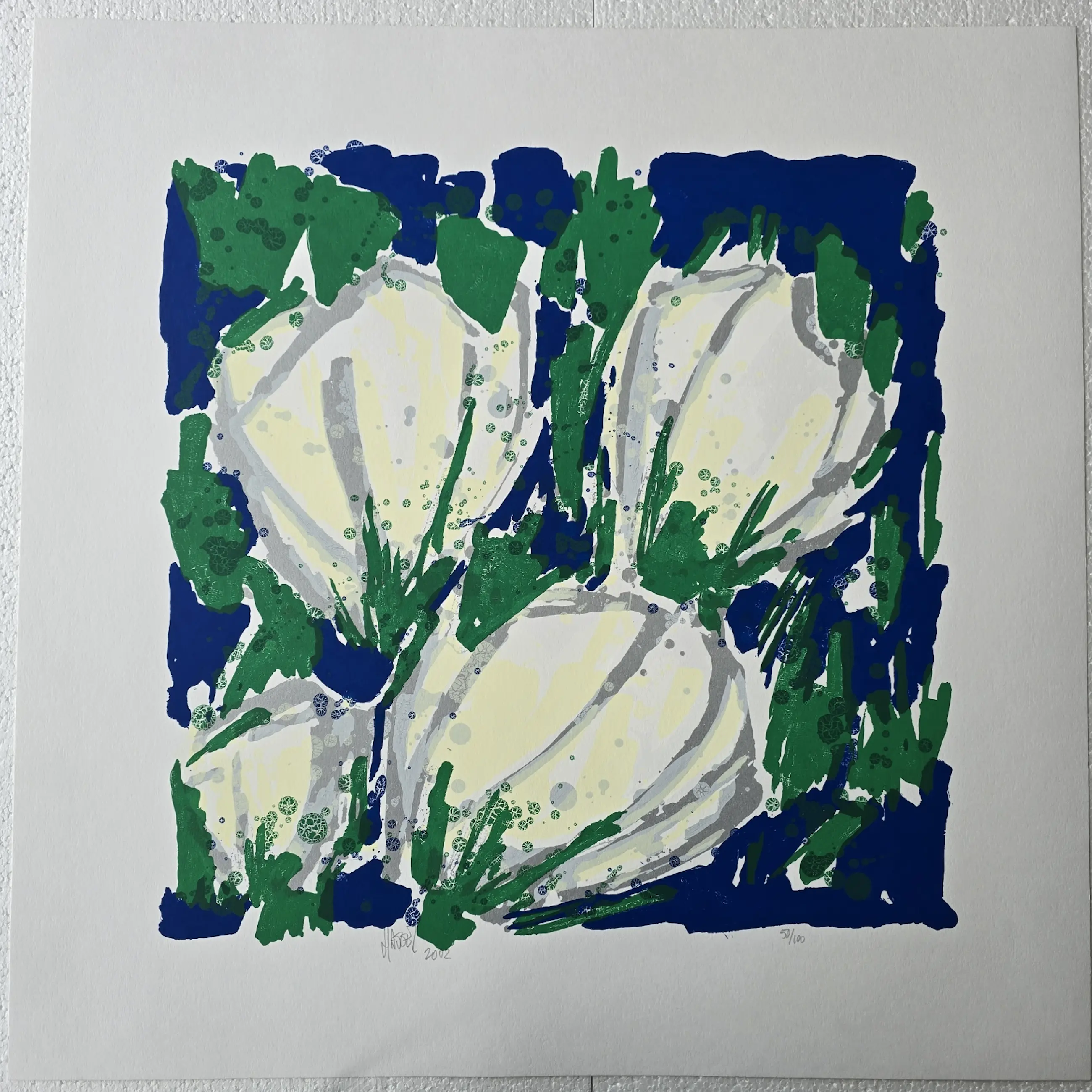Kunstenaar: Ad van Hassel Techniek: Zeefdruk Oplage: 100 exemplaren Jaar: 2002 Afmeting papier: 70 x 70 cm Afmeting beeld: 55 x 55 cm
