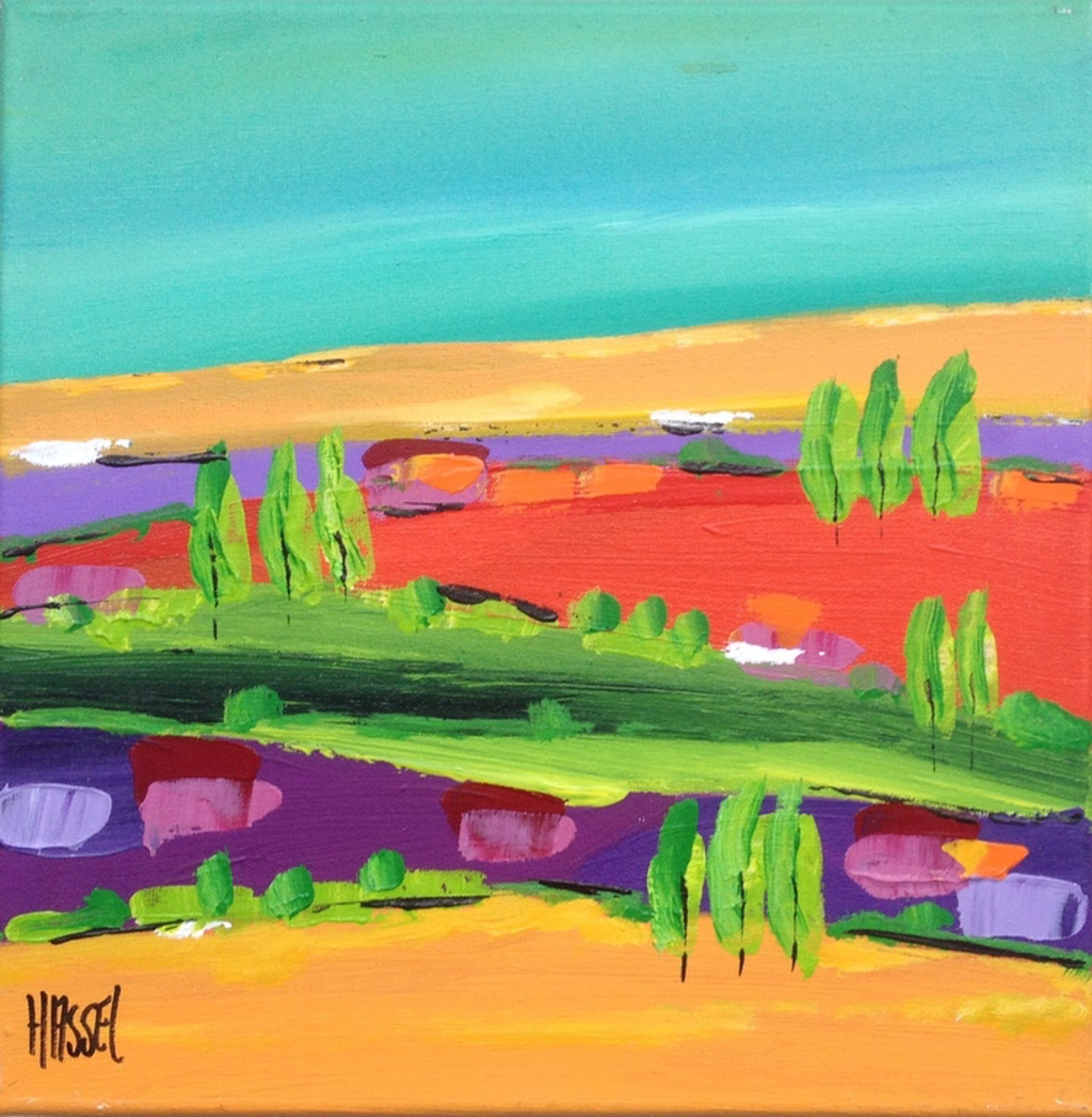 Landschap geschilderd met acrylverf op een dik 3D doek, zijkanten zijn meegeschilderd, kan zo aan de muur.