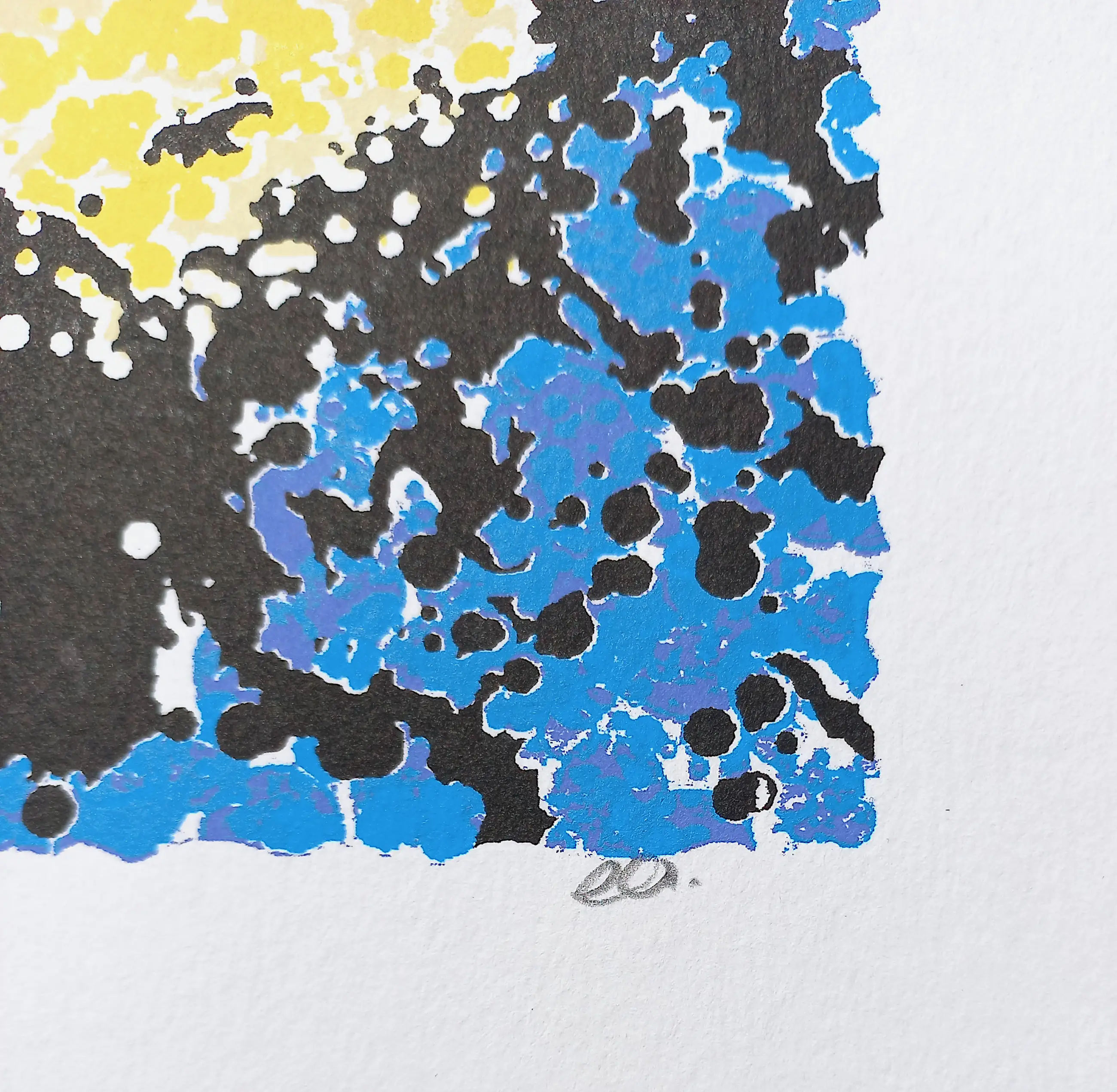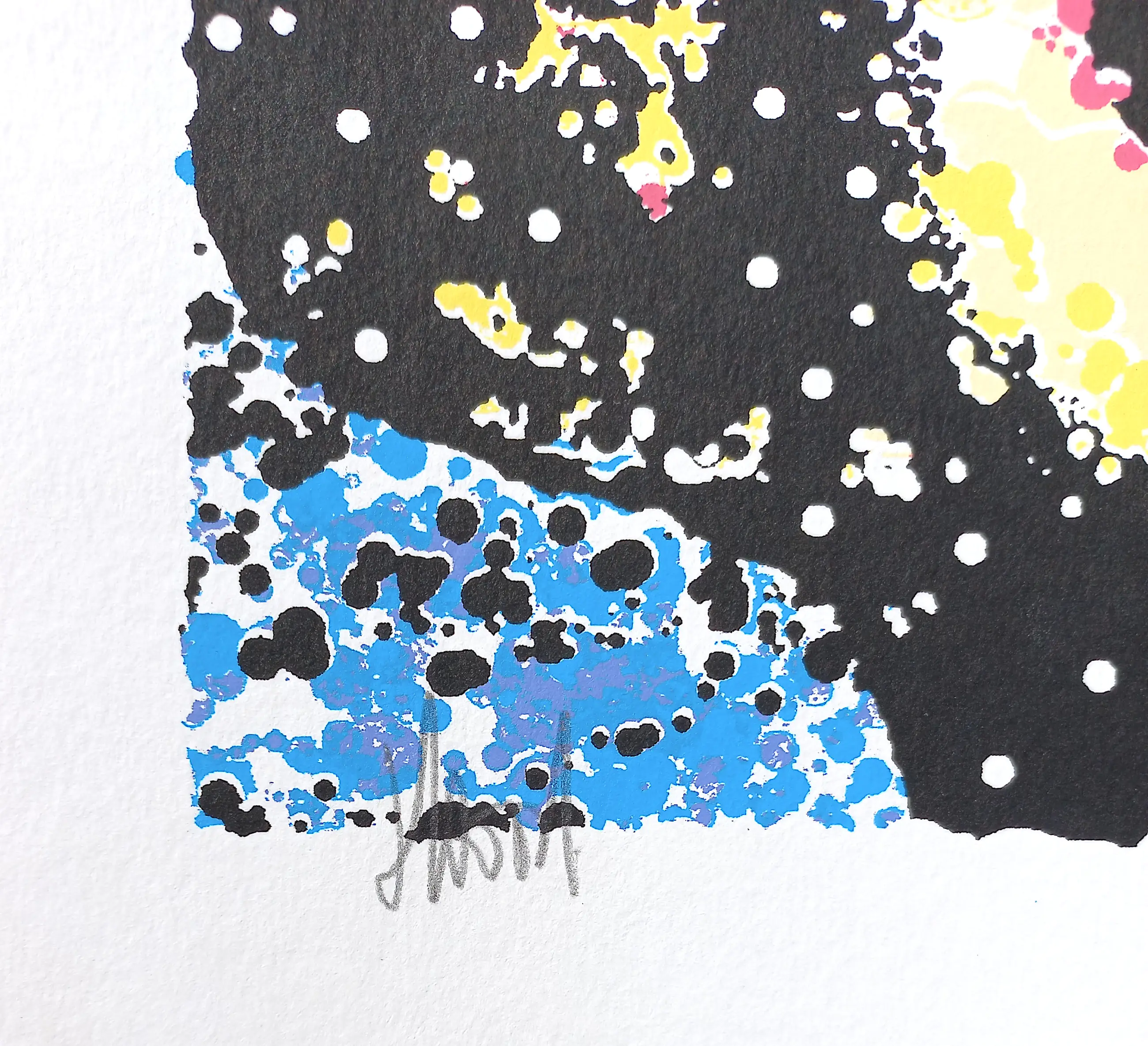 Mooi, kleurrijk portret van dit icoon. Zeefdruk op papier, met potlood gesigneerd, een E.A. exemplaar. In zeer goede conditie.